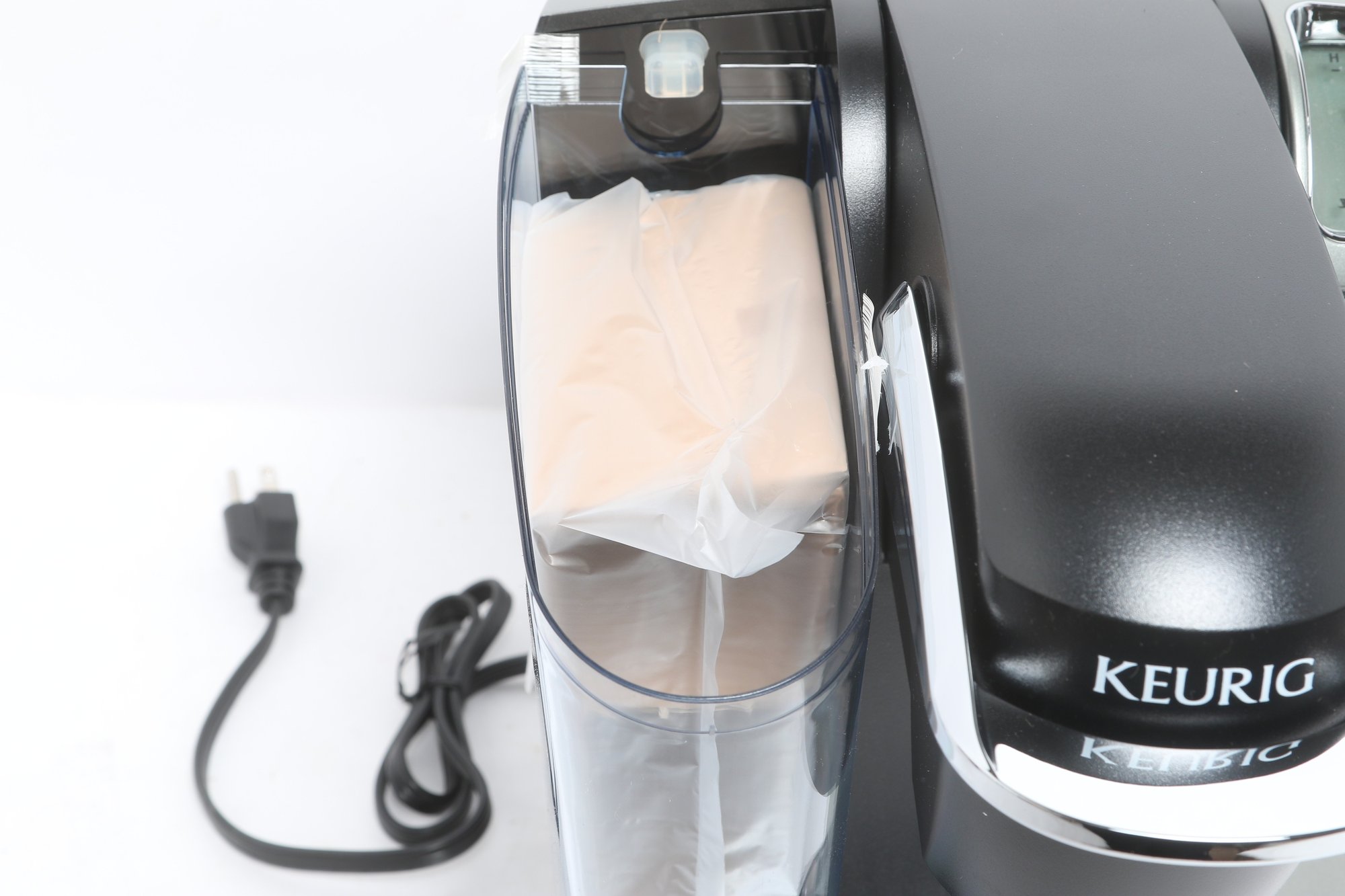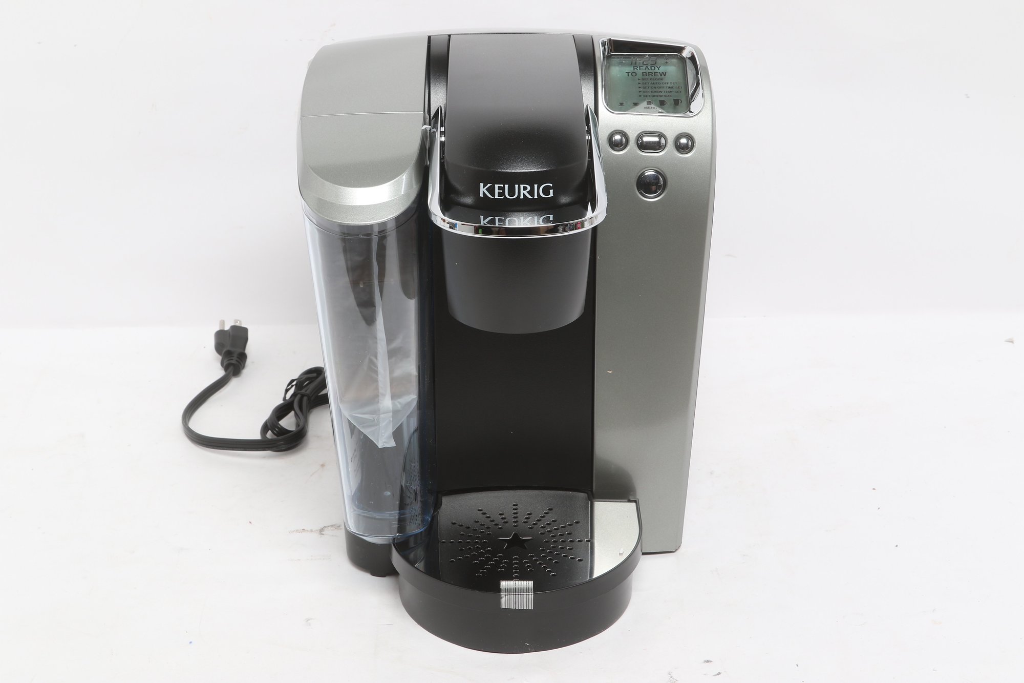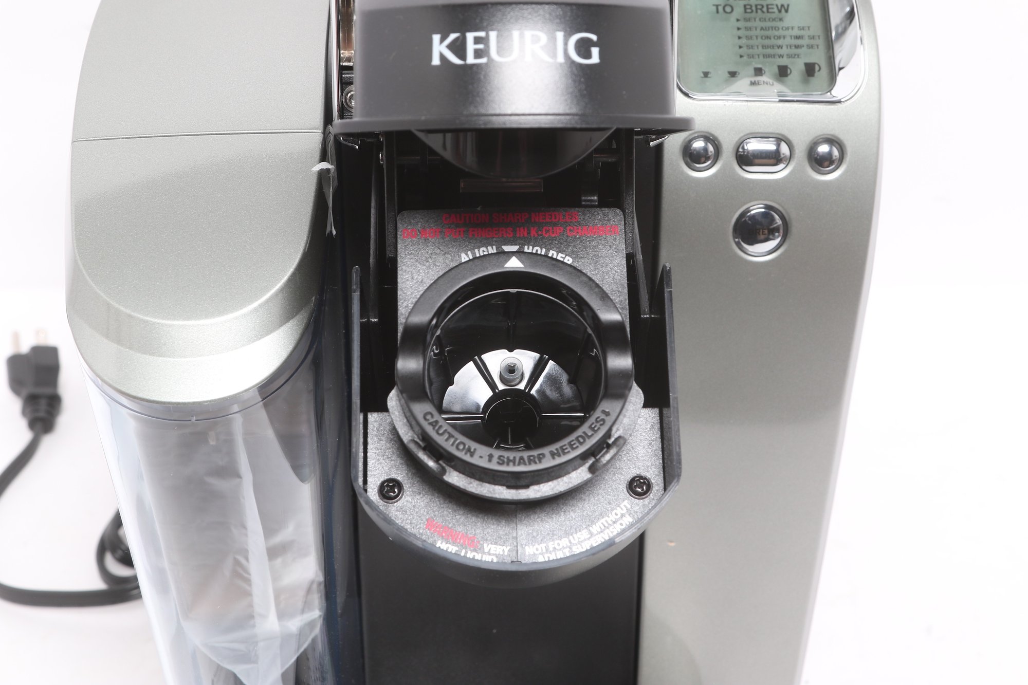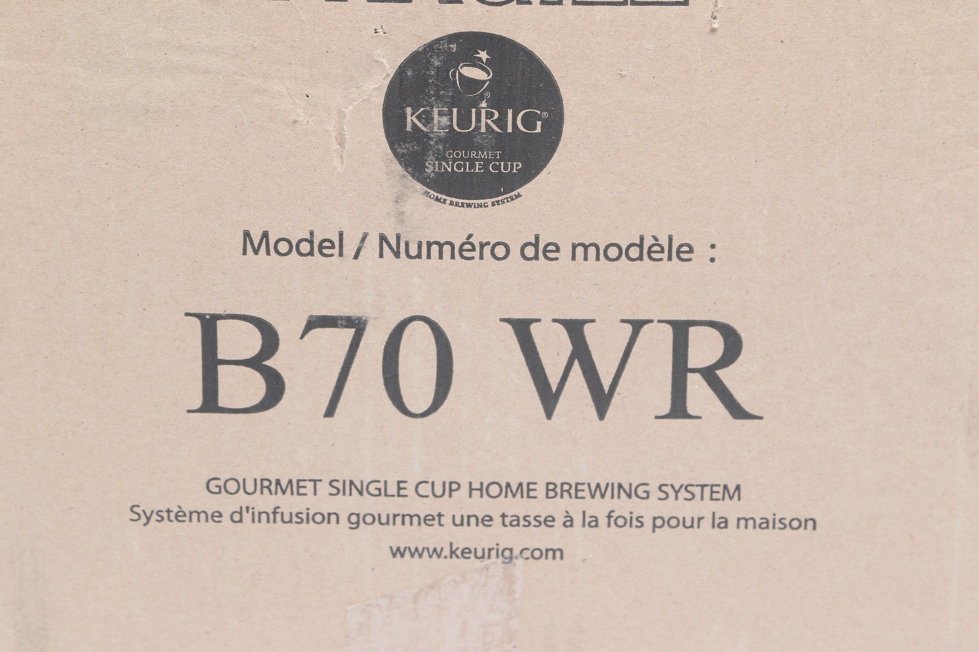New with open box Keurig B70 WR Platinum single cup coffee maker featuring programmable settings, multiple brew sizes, and a large removable water reservoir. Includes power cord and original box as shown.