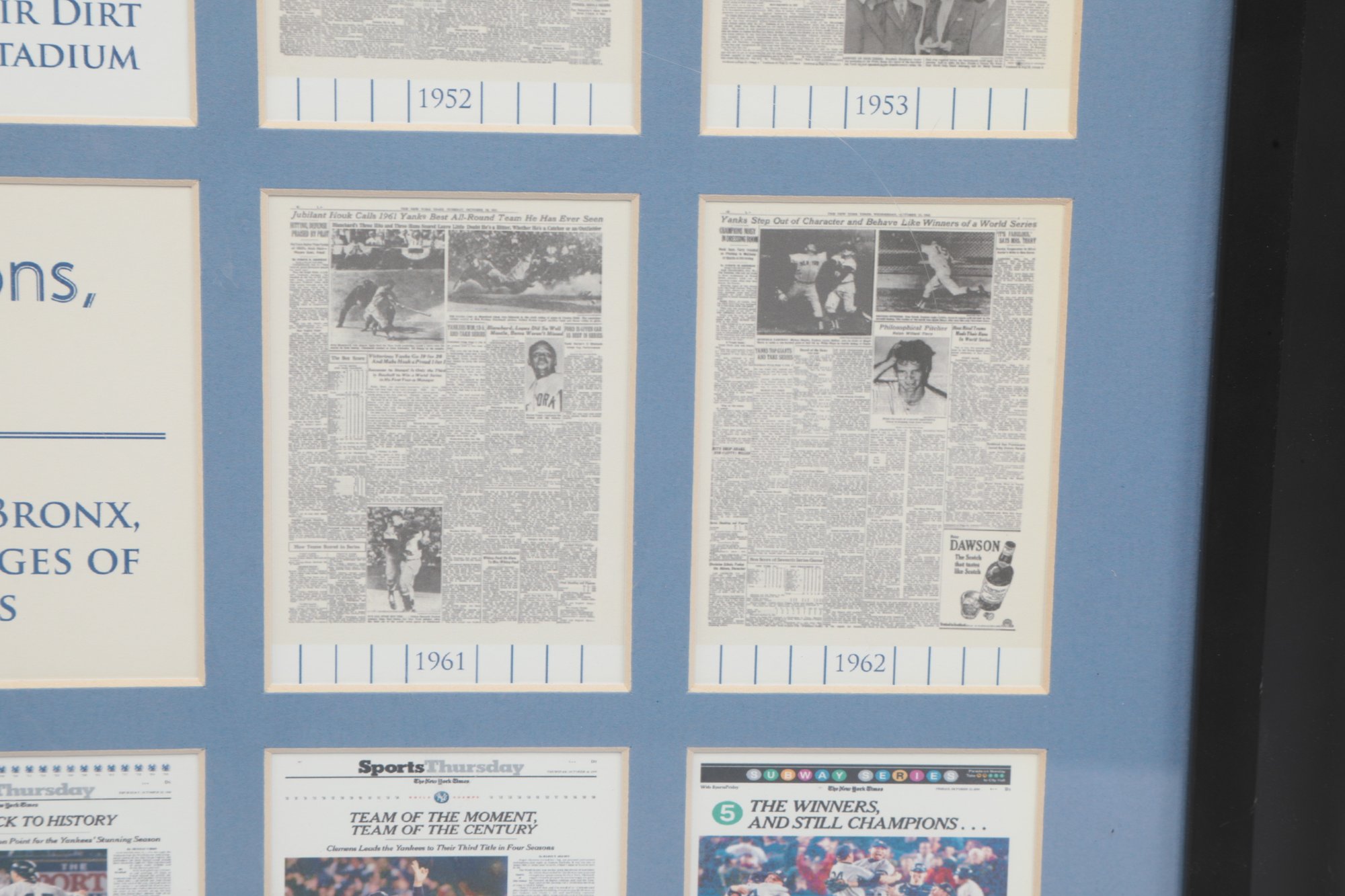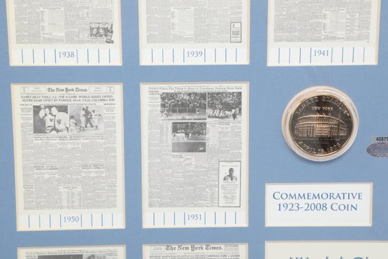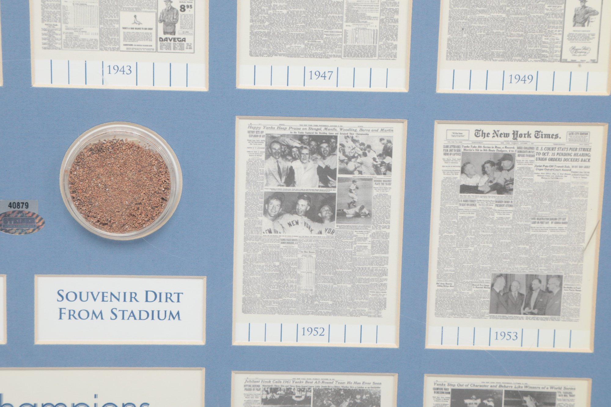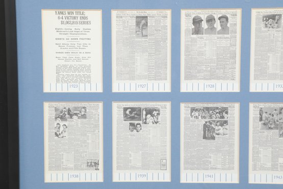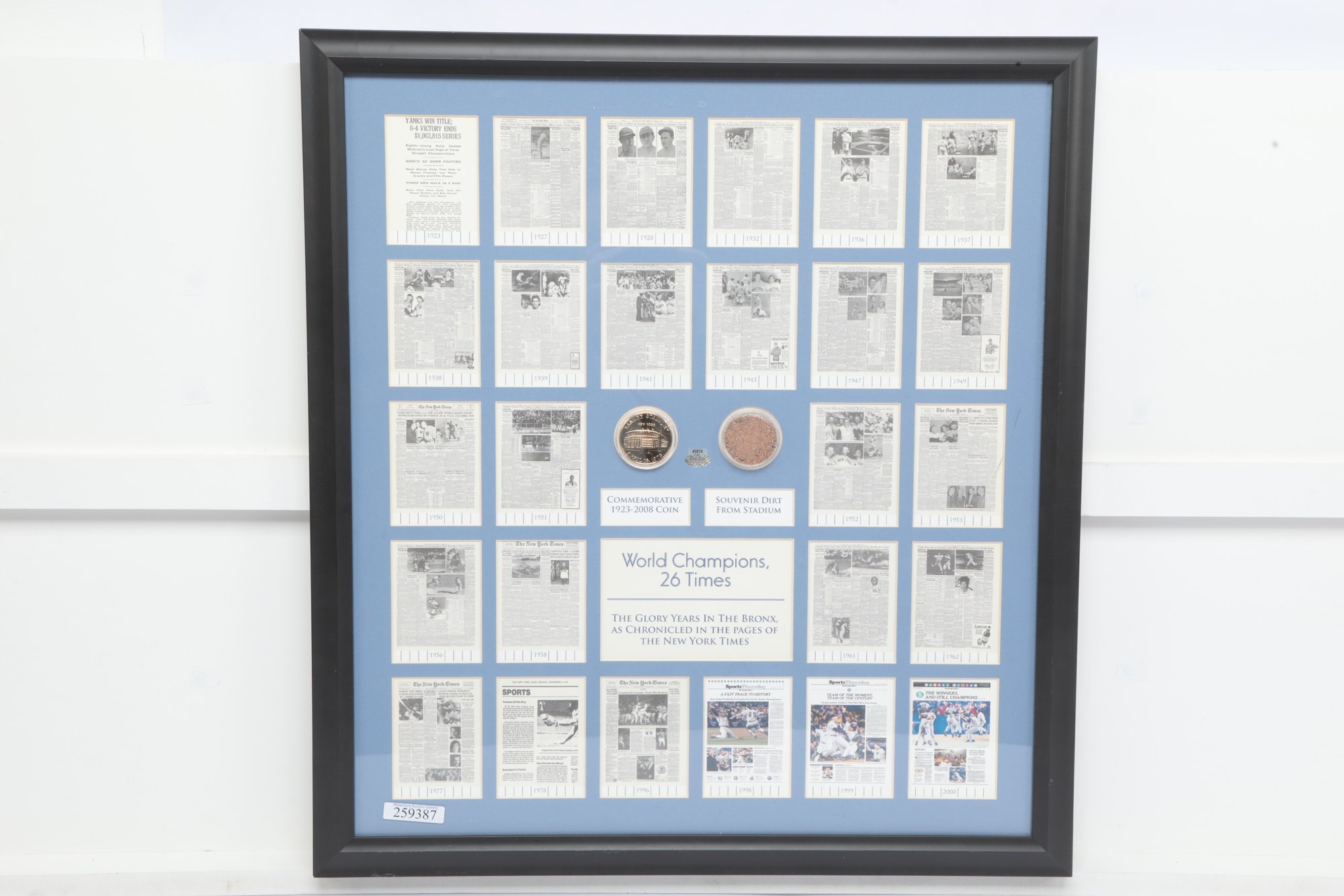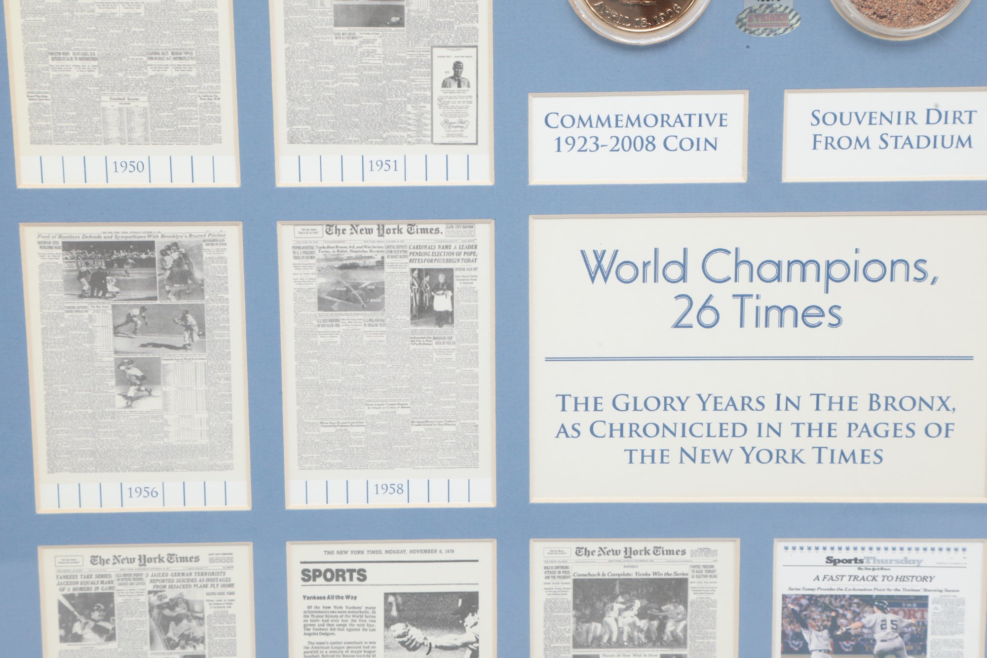 Multiple newspaper headline reproductions highlighting World Series wins with Center plaque reading “World Champions”. Includes Commemorative coin and stadium dirt mounted in the center. See pictures carefully for details on size and condition.