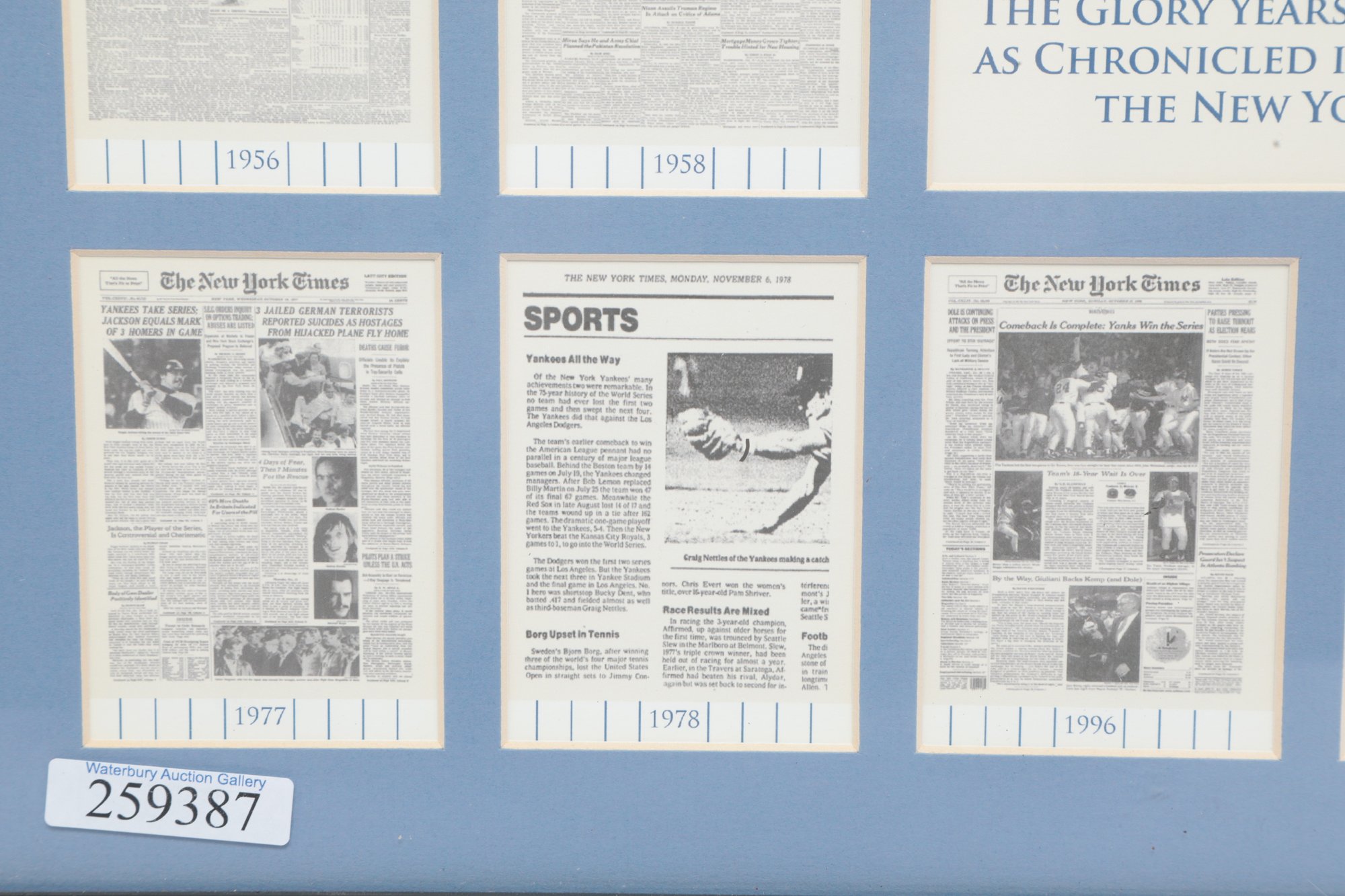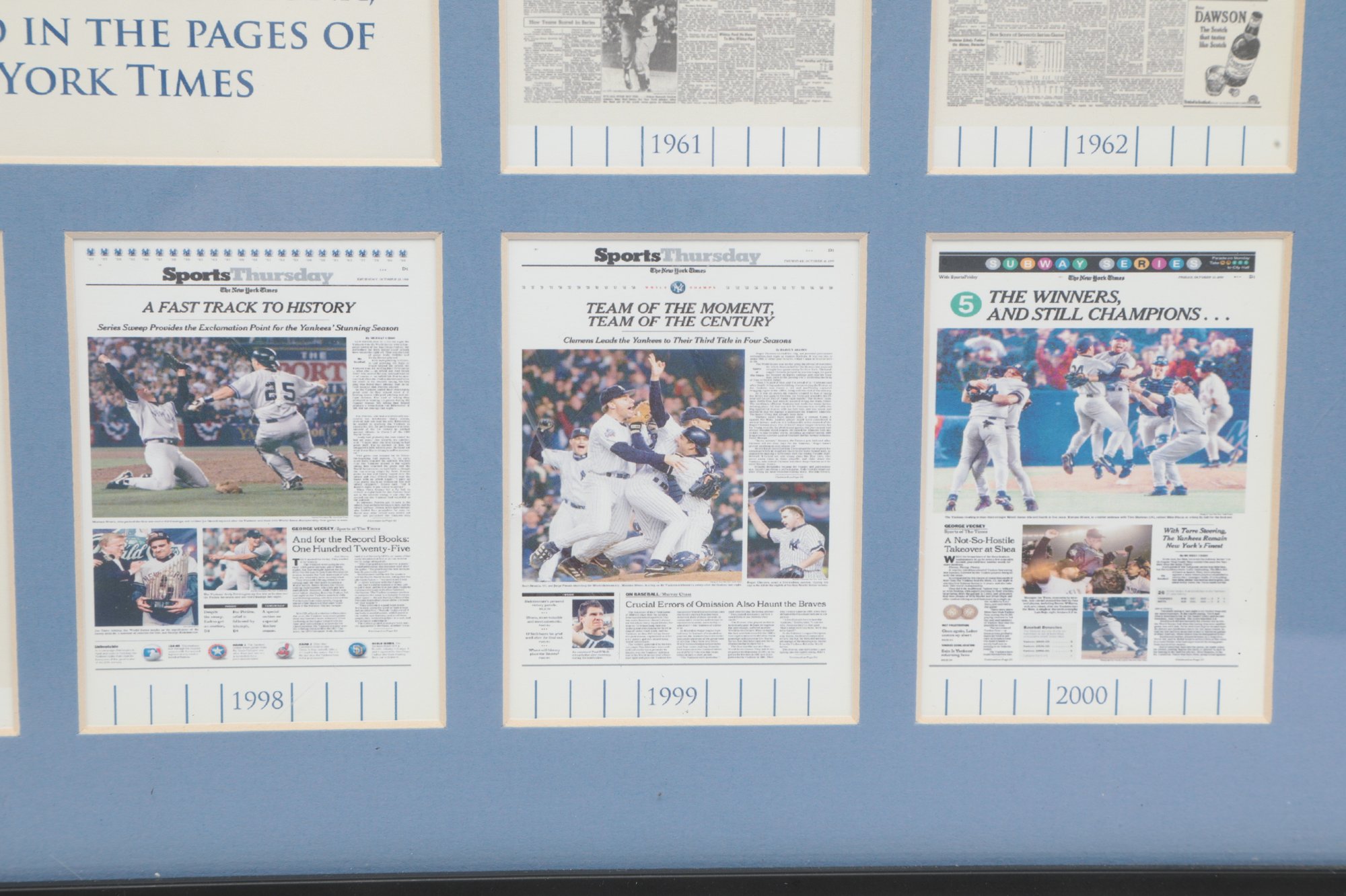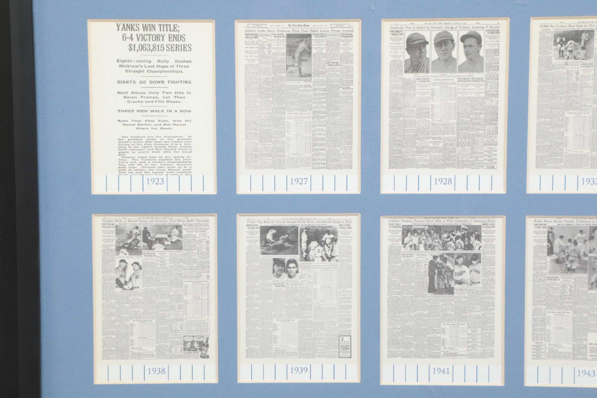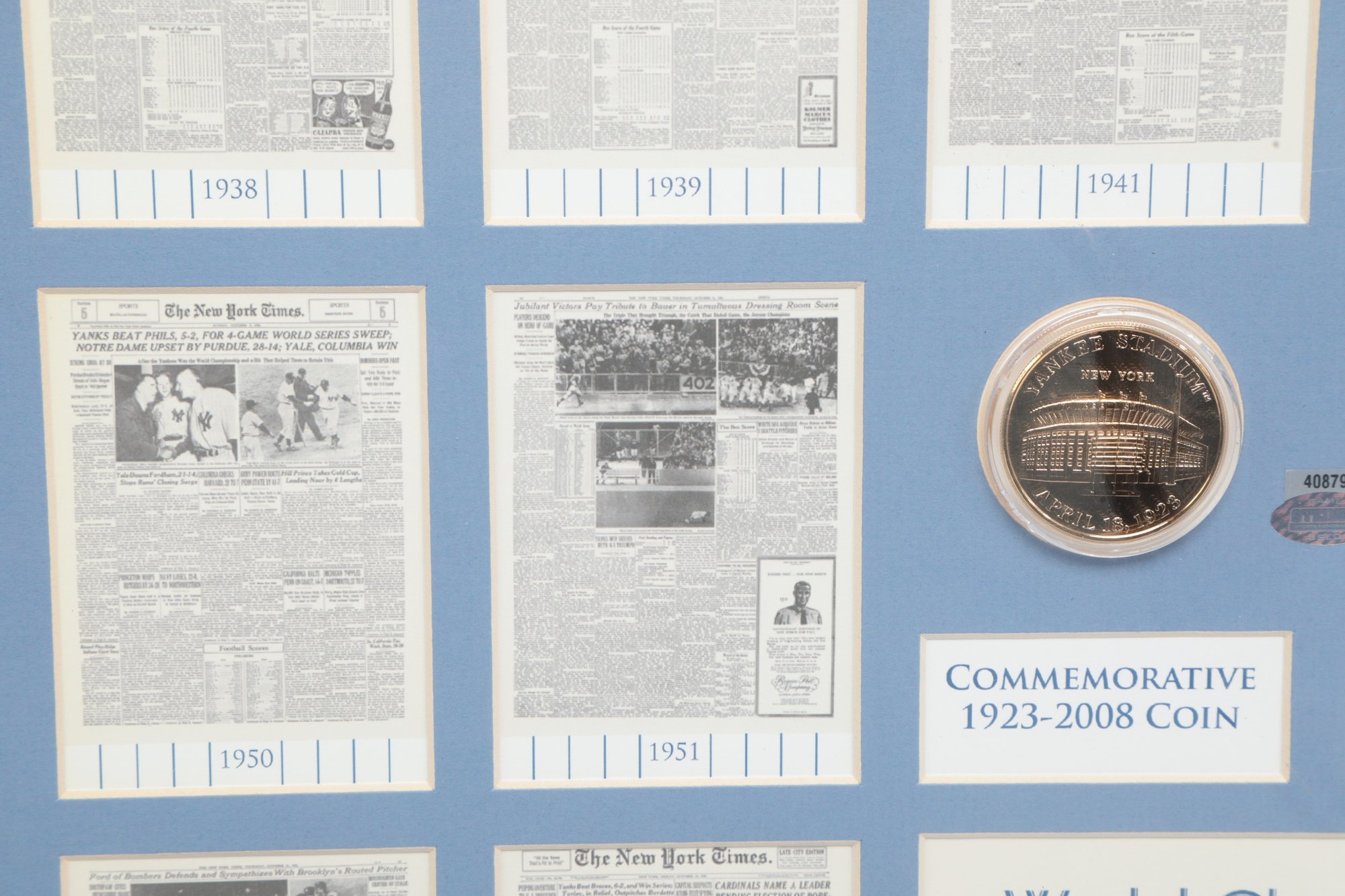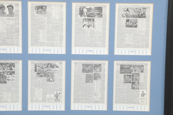 Multiple newspaper headline reproductions highlighting World Series wins with Center plaque reading “World Champions”. Includes Commemorative coin and stadium dirt mounted in the center. See pictures carefully for details on size and condition.