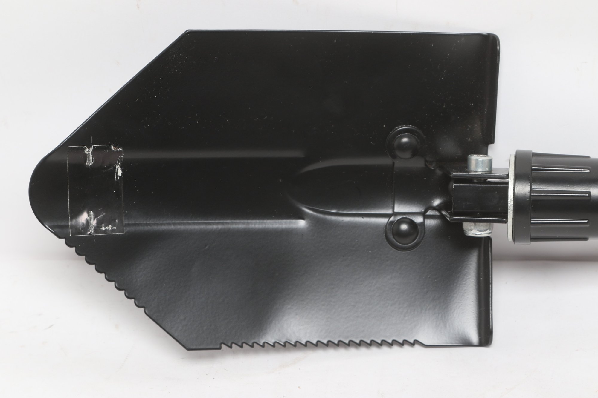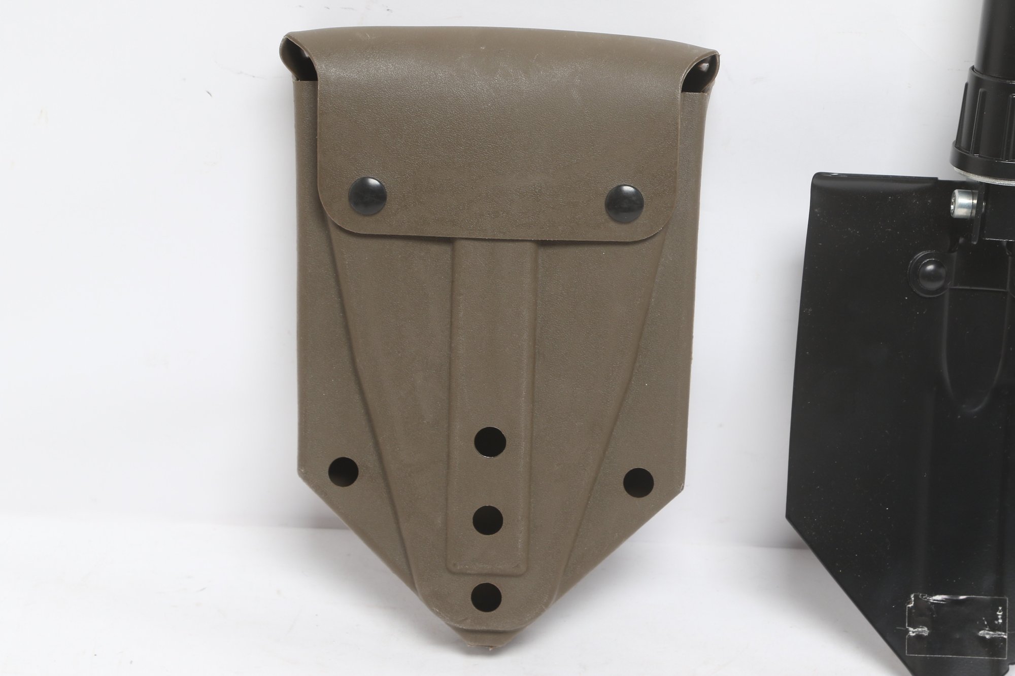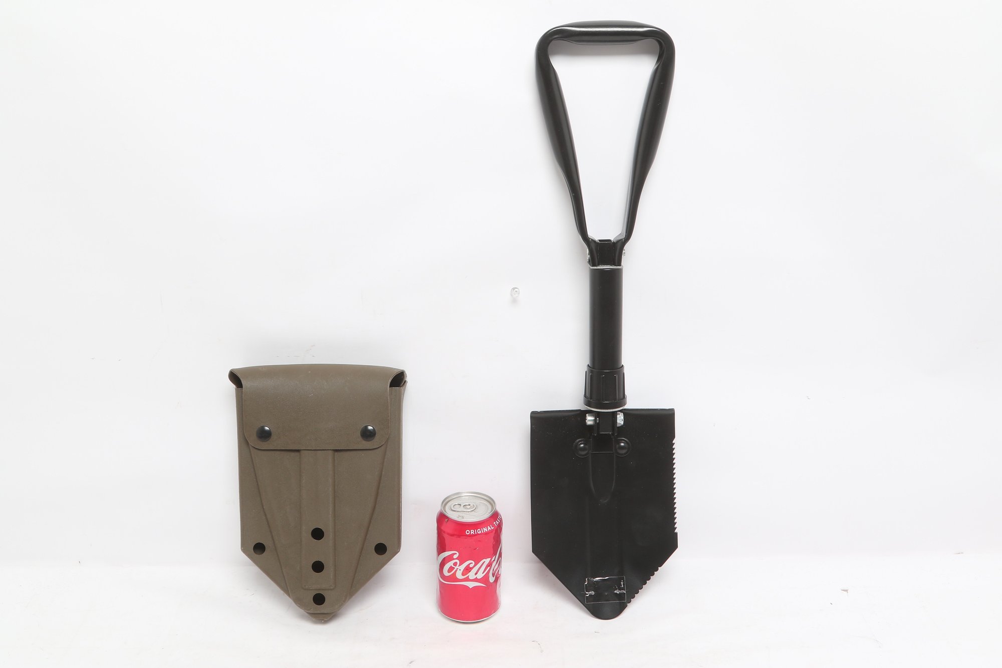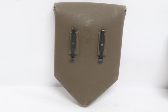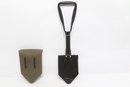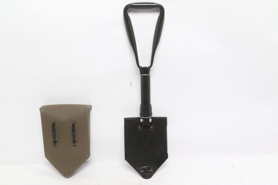 Compact folding entrenching tool featuring a durable metal shovel head with serrated edge and sturdy handle. Includes protective sheath for easy carrying and storage. Ideal for camping, hiking, or emergency use. New unused condition.