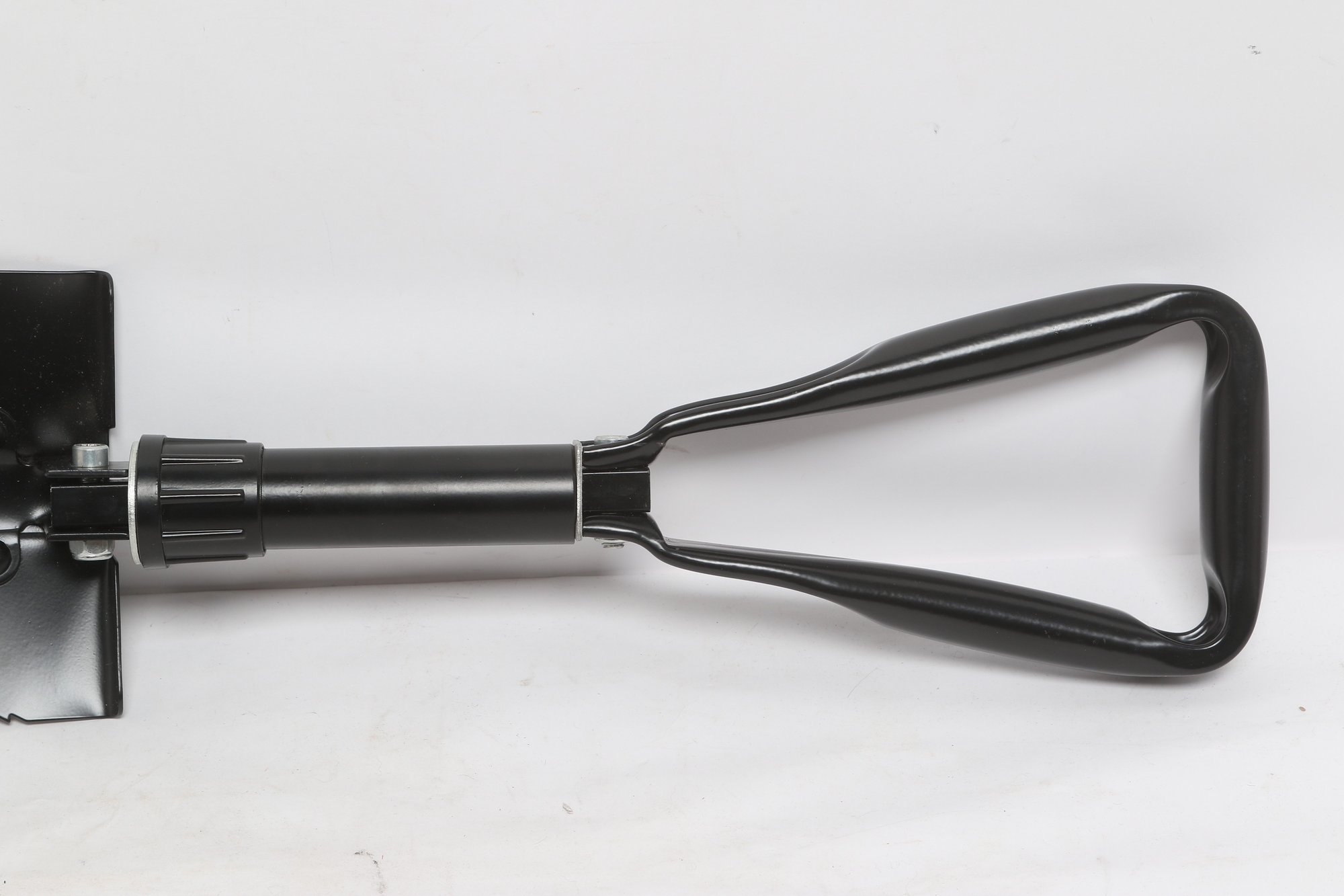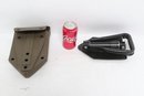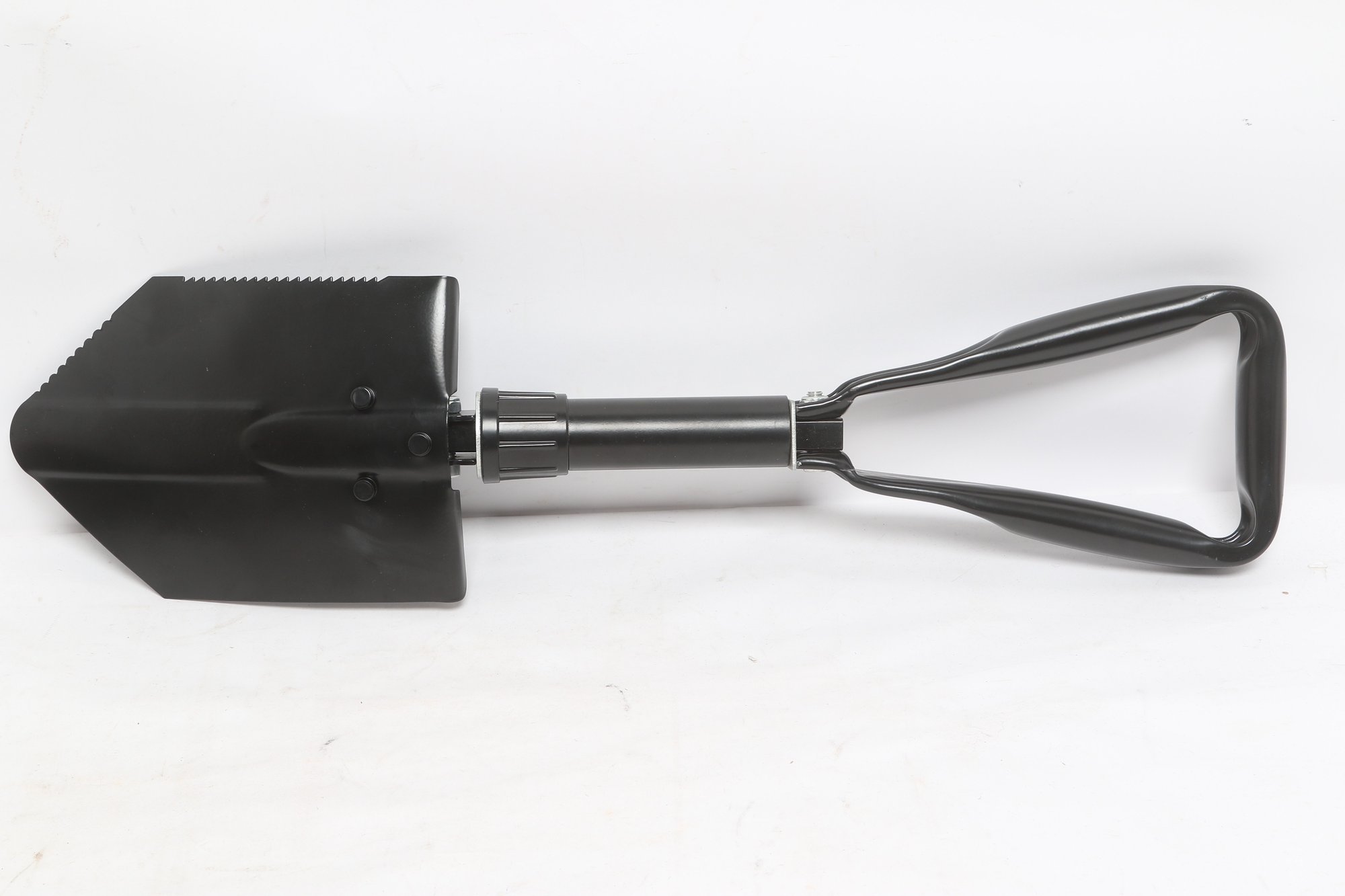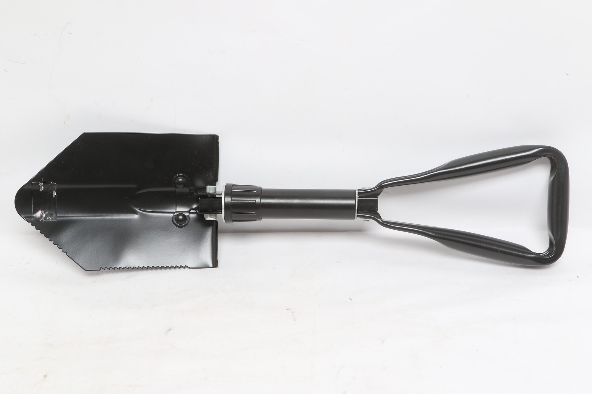 Compact folding entrenching tool featuring a durable metal shovel head with serrated edge and sturdy handle. Includes protective sheath for easy carrying and storage. Ideal for camping, hiking, or emergency use. New unused condition.
