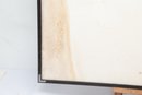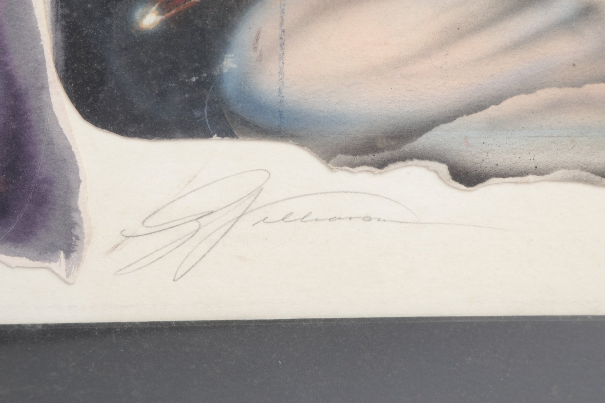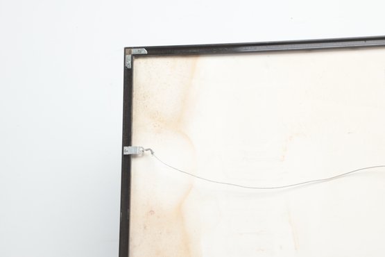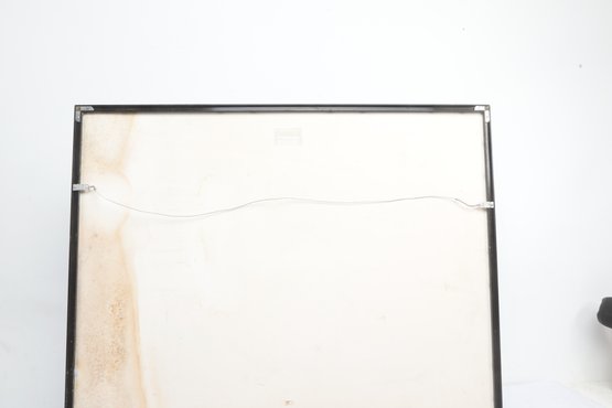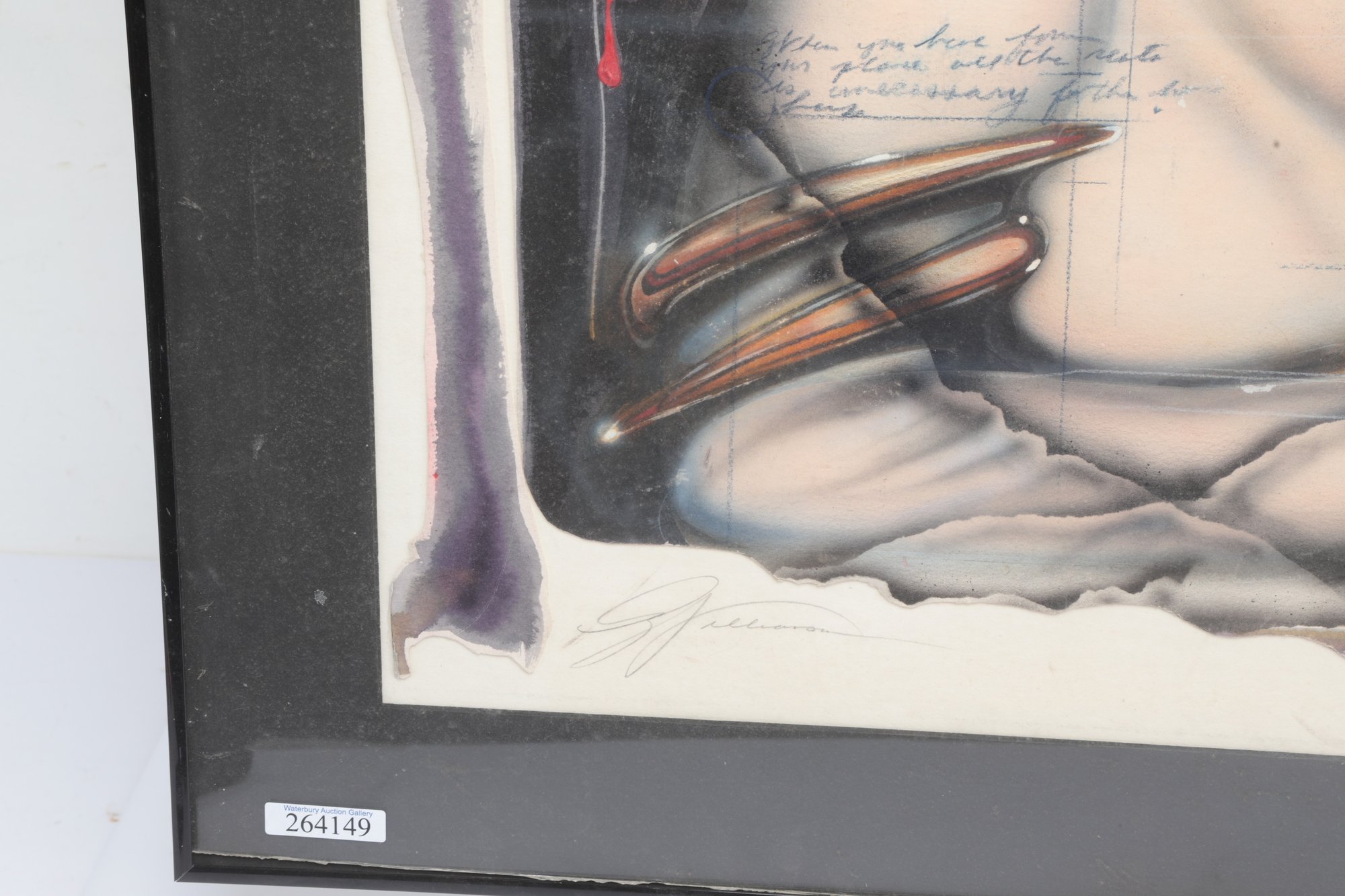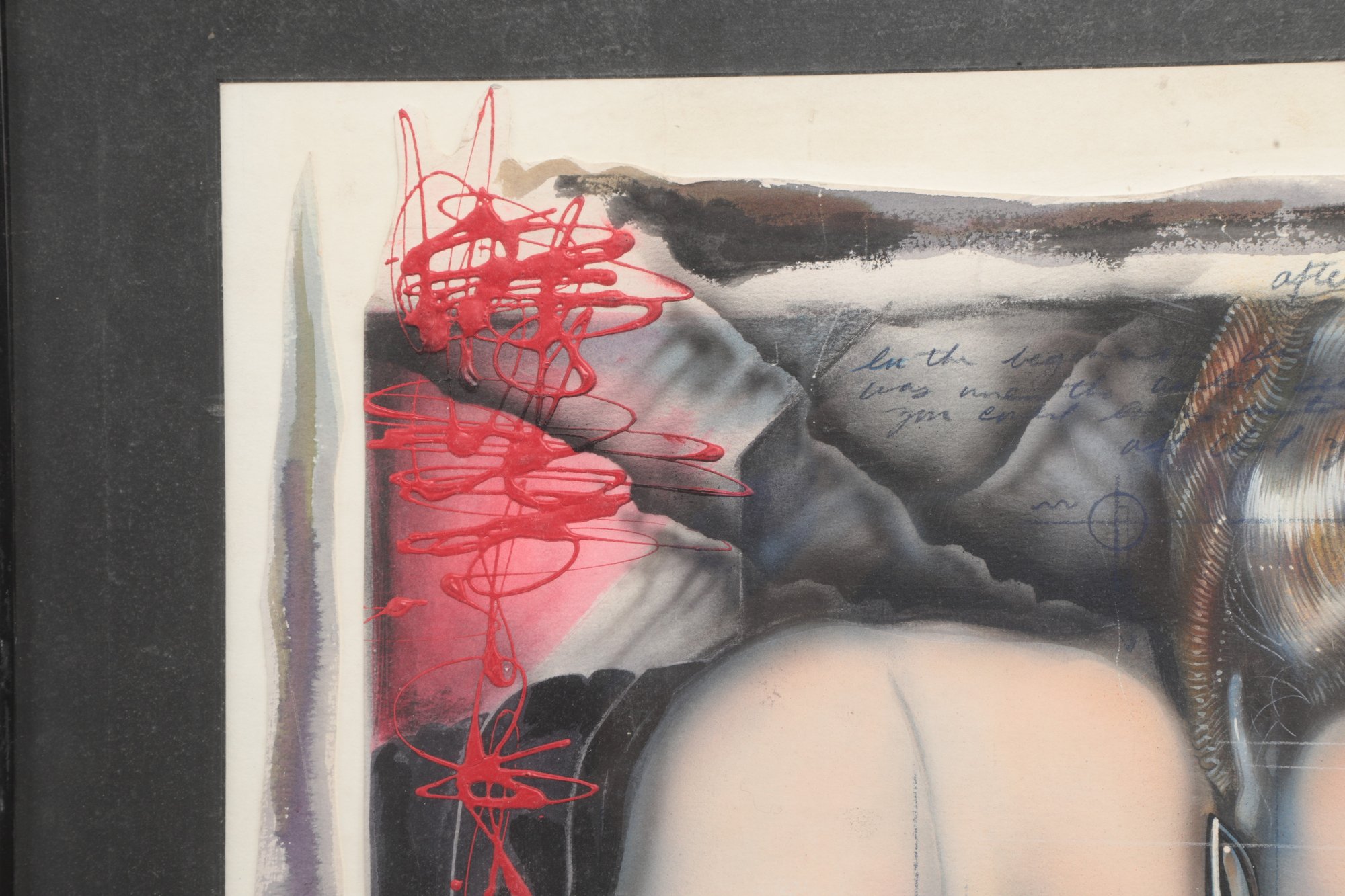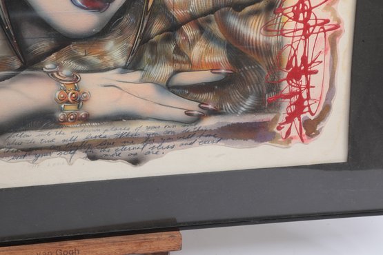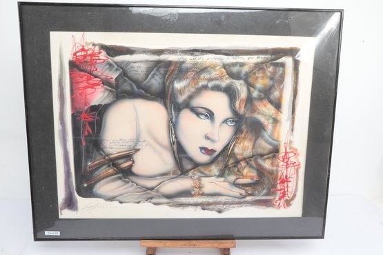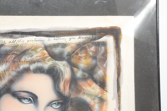 Surrealist style portrait artwork depicting a stylized woman surrounded by abstract forms and symbolic details. Signed along the lower edge. Presented under glass with matting in a modern frame. Light wear to frame consistent with age; a striking contemporary decorative piece.