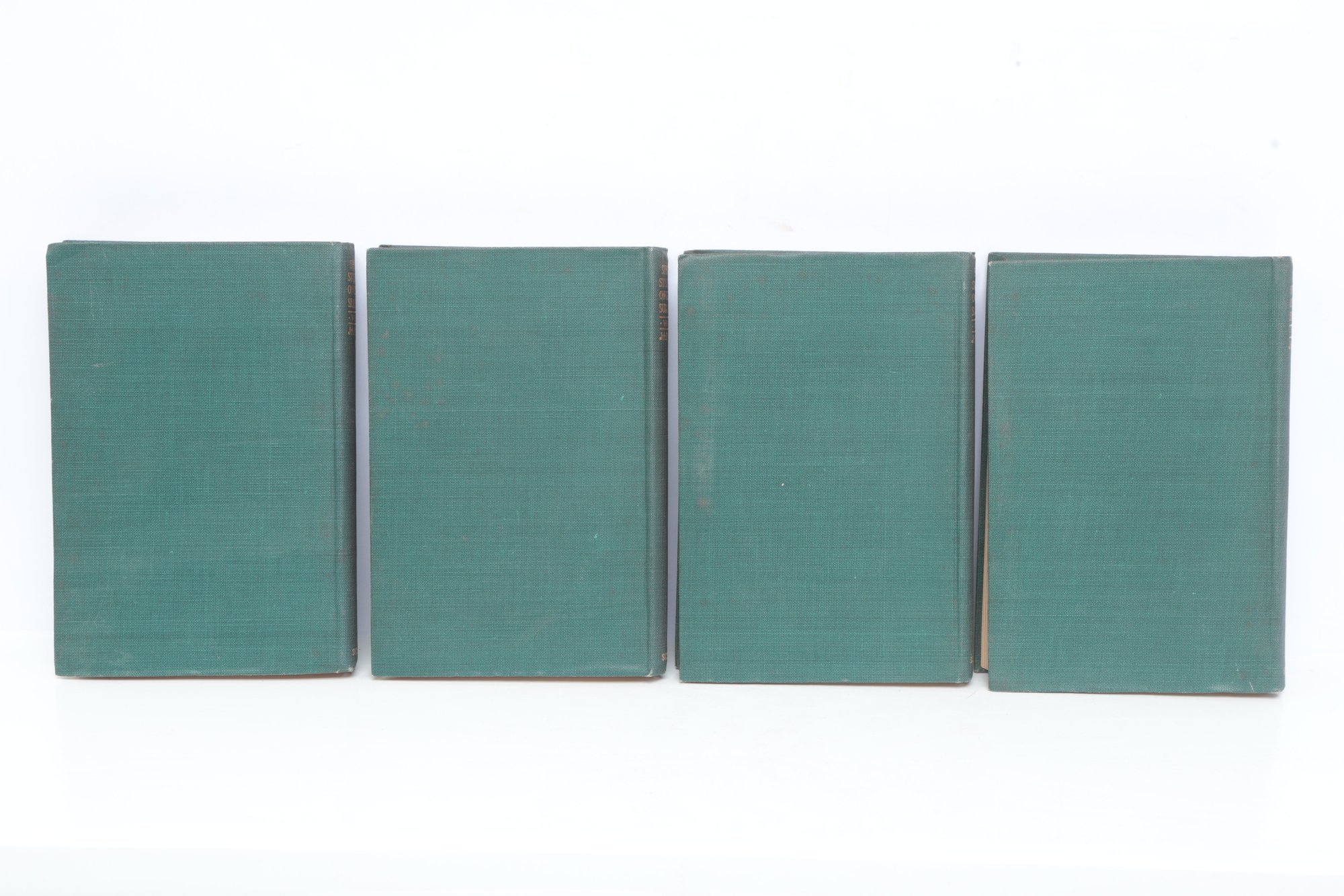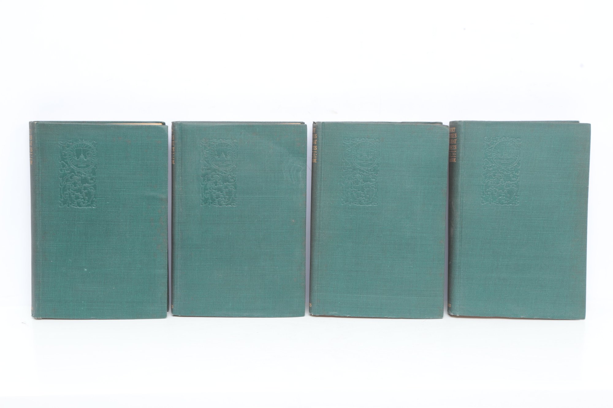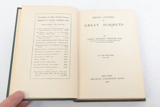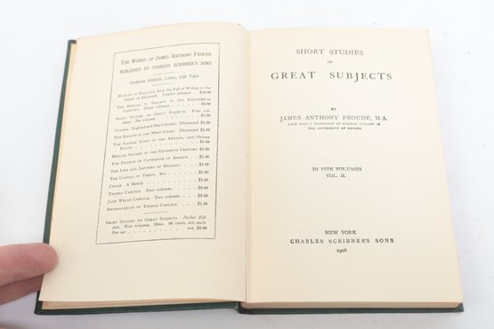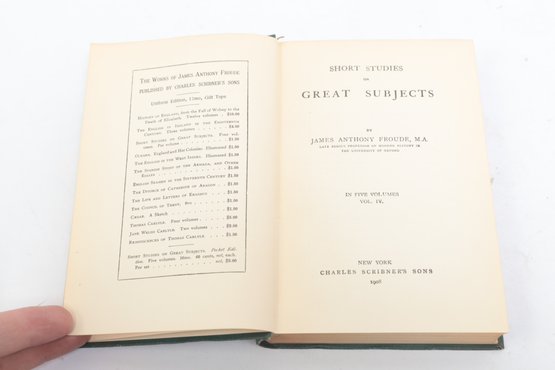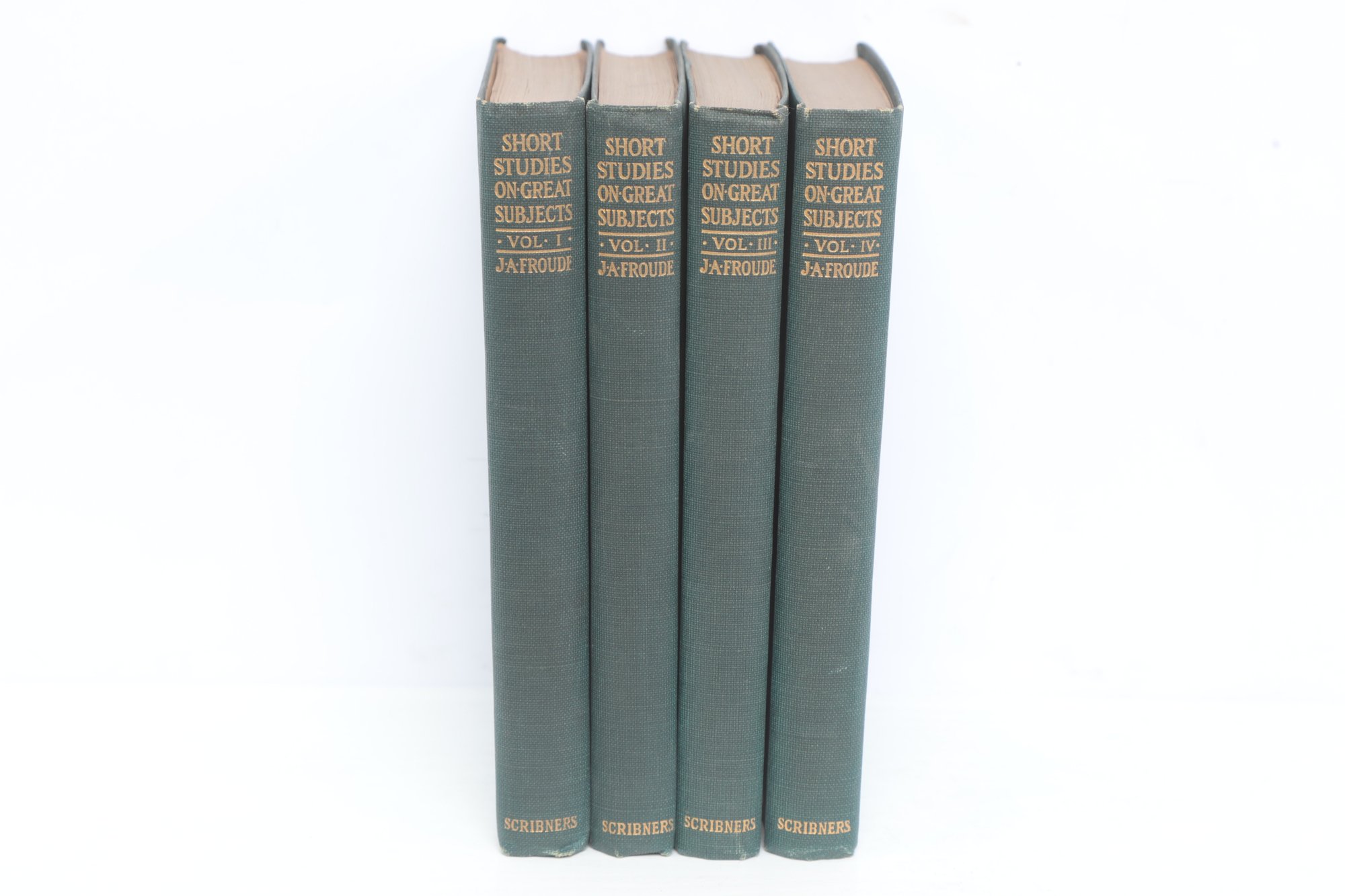 Short Studies on Great Subjects by James Anthony Froude, M.A., Late Regius Professor of Modern History in the University of Oxford, Volumes I, II, III, and IV (of five volume set), New York, Charles Scribner's Sons, 1908. Four matching volumes in original green cloth bindings with gilt spine lettering, publisher's advertisements present. Bookplate with heraldic coat of arms and motto "Per Fidem Et Constantiam" pasted to front pastedown. Essay collection on historical and literary topics by prominent Victorian historian and biographer. Bindings with light to moderate wear including edge rubbing, spine end fraying, corner bumps. Interior pages toned with scattered foxing, hinges intact.