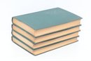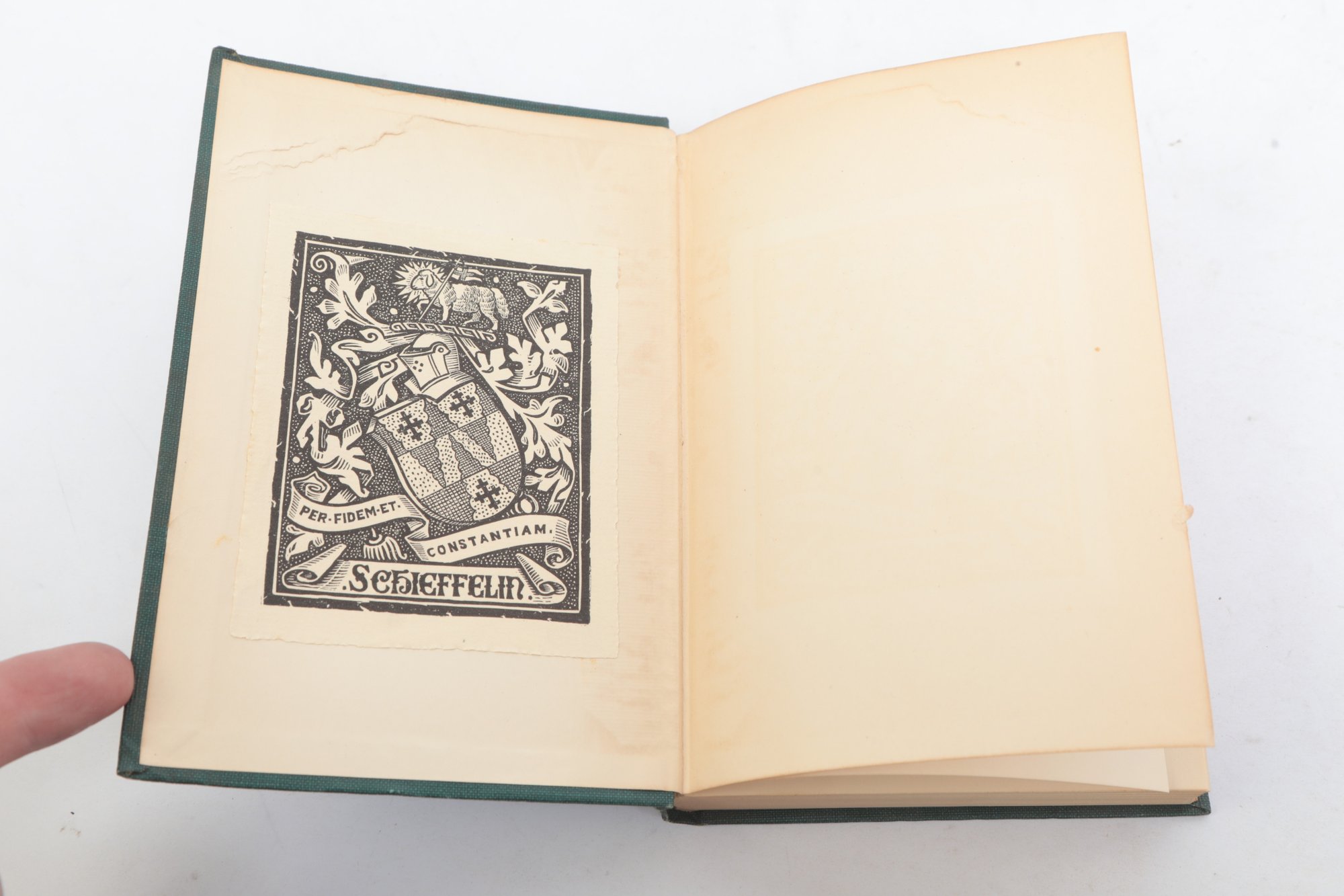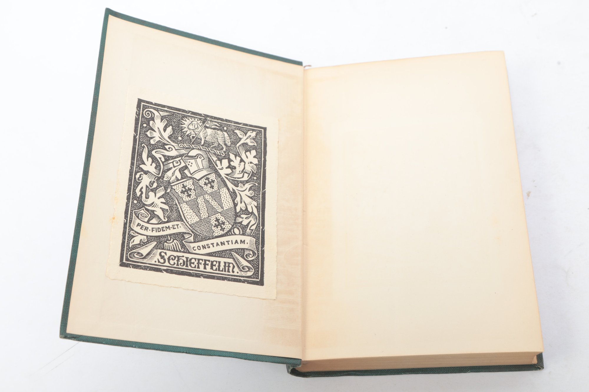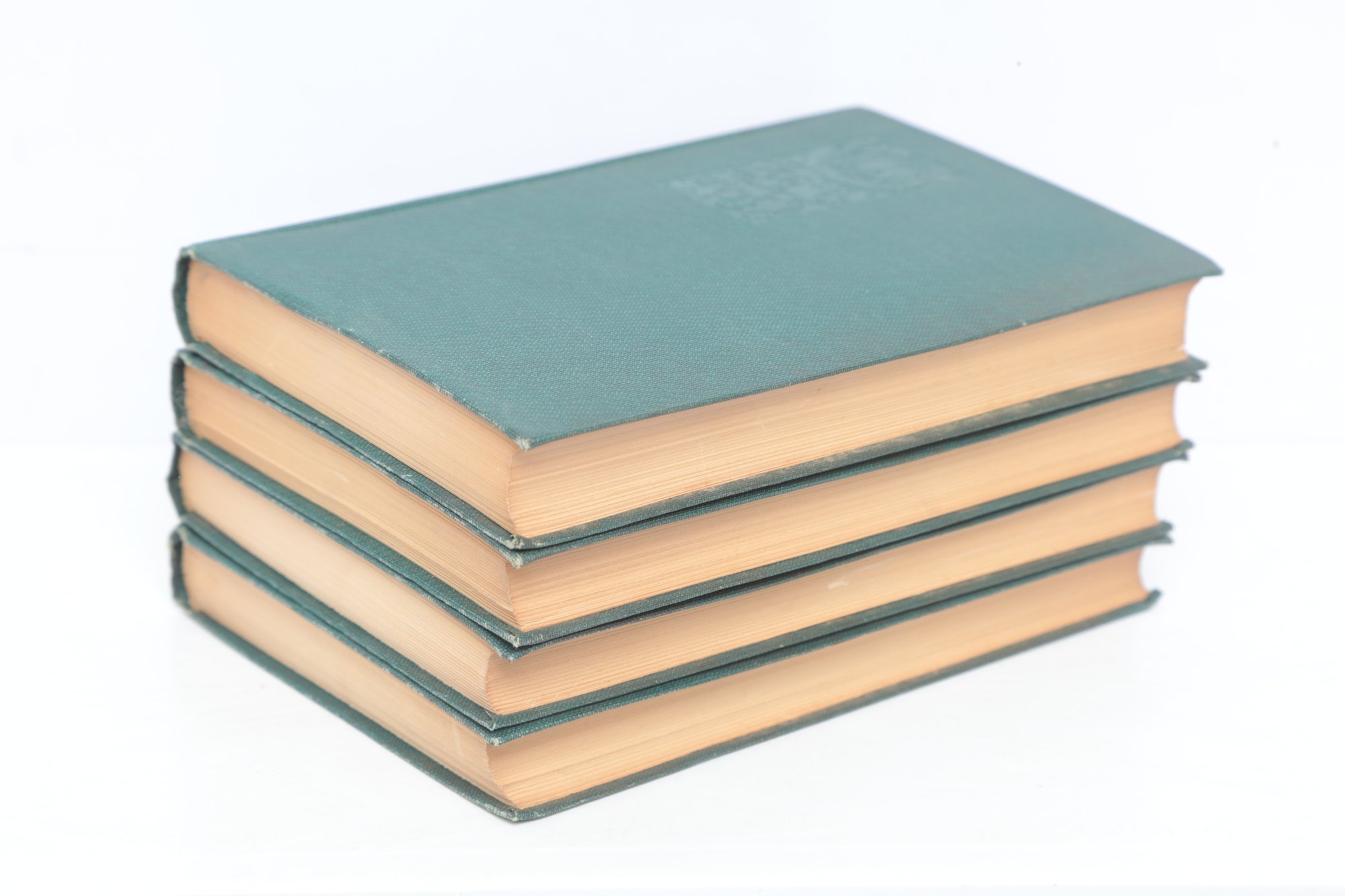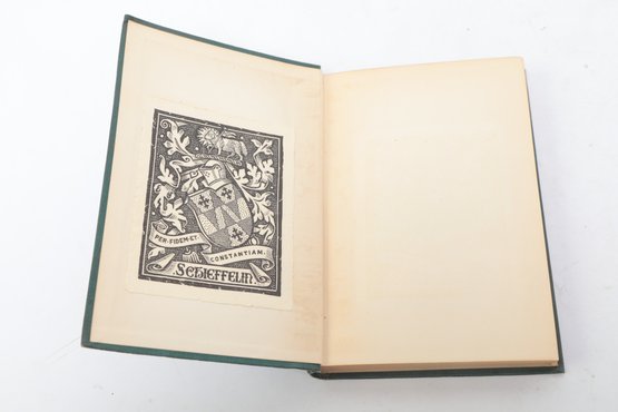 Short Studies on Great Subjects by James Anthony Froude, M.A., Late Regius Professor of Modern History in the University of Oxford, Volumes I, II, III, and IV (of five volume set), New York, Charles Scribner's Sons, 1908. Four matching volumes in original green cloth bindings with gilt spine lettering, publisher's advertisements present. Bookplate with heraldic coat of arms and motto "Per Fidem Et Constantiam" pasted to front pastedown. Essay collection on historical and literary topics by prominent Victorian historian and biographer. Bindings with light to moderate wear including edge rubbing, spine end fraying, corner bumps. Interior pages toned with scattered foxing, hinges intact.