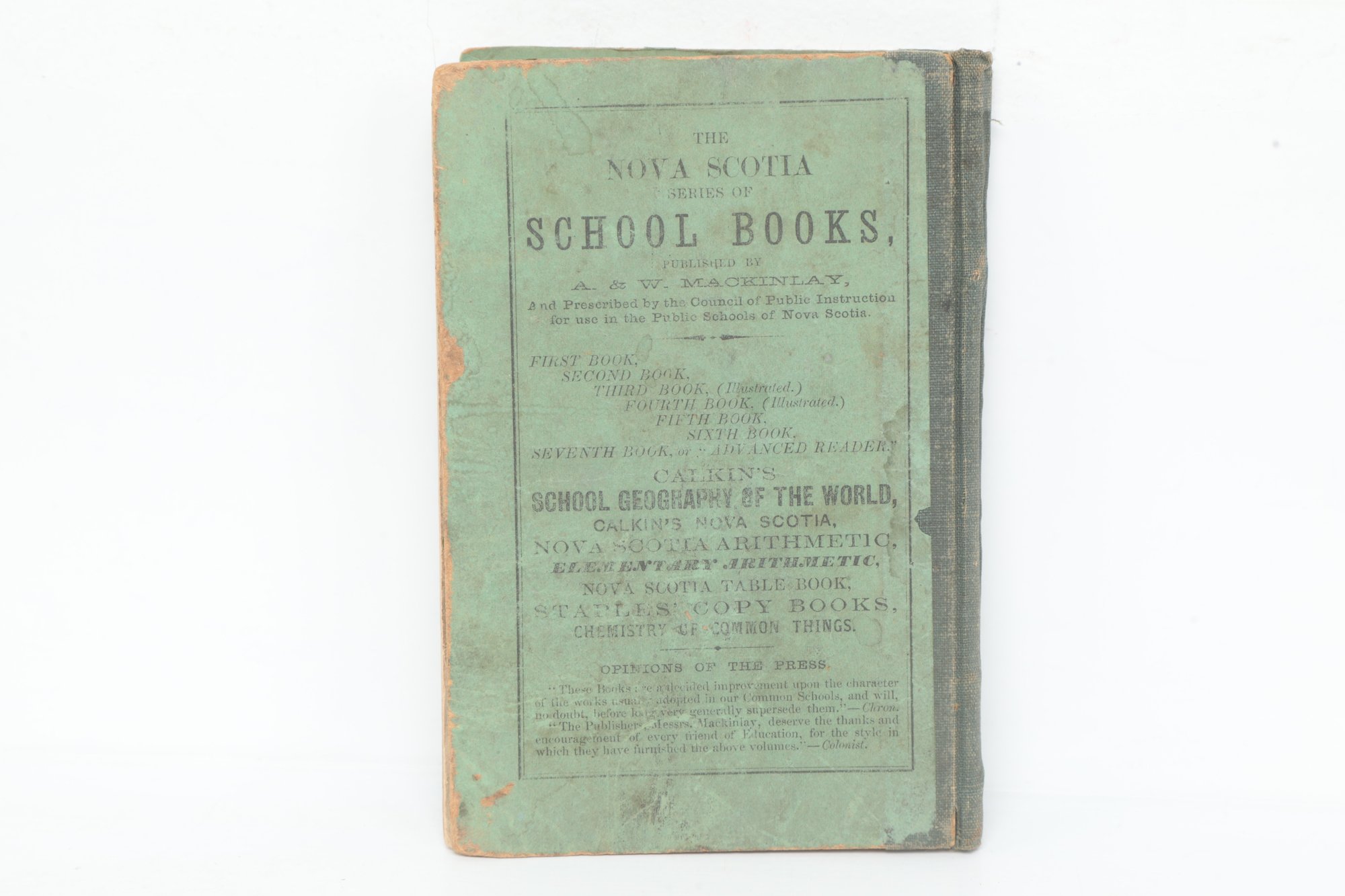 12mo. Original printed paper-covered boards, worn with loss to spine and corners, cover toned and soiled; contents toned throughout, with use consistent with a schoolbook. A scarce Halifax imprint. The title page bears the date 1864, while the printed paper wrapper reads 1869– likely a reissue of unsold sheets. By the Head Master of the Provincial Model School, Truro, Nova Scotia, and authorized for use by the Council of Public Instruction. With manuscript ownership inscription on the front pastedown, dated September 14th [18–], recording the name of A. Nelson, Tompkinsville, Staten Island, New York