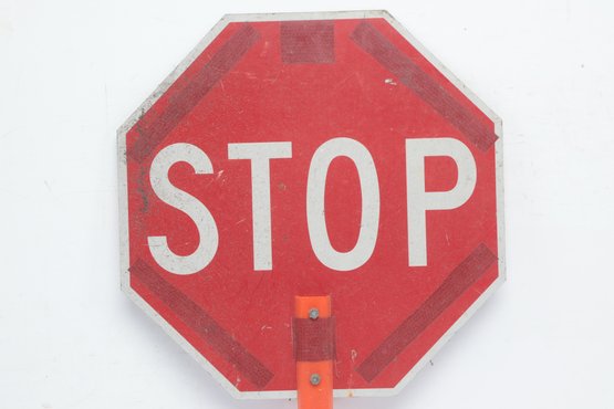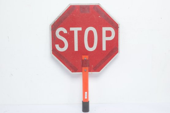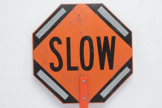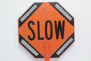 Handheld Reversible Stop Slow Paddle Traffic Sign. Could use cleaning, have some wear from use. Can also be mounted on poles. See pictures carefully for details on size and condition.