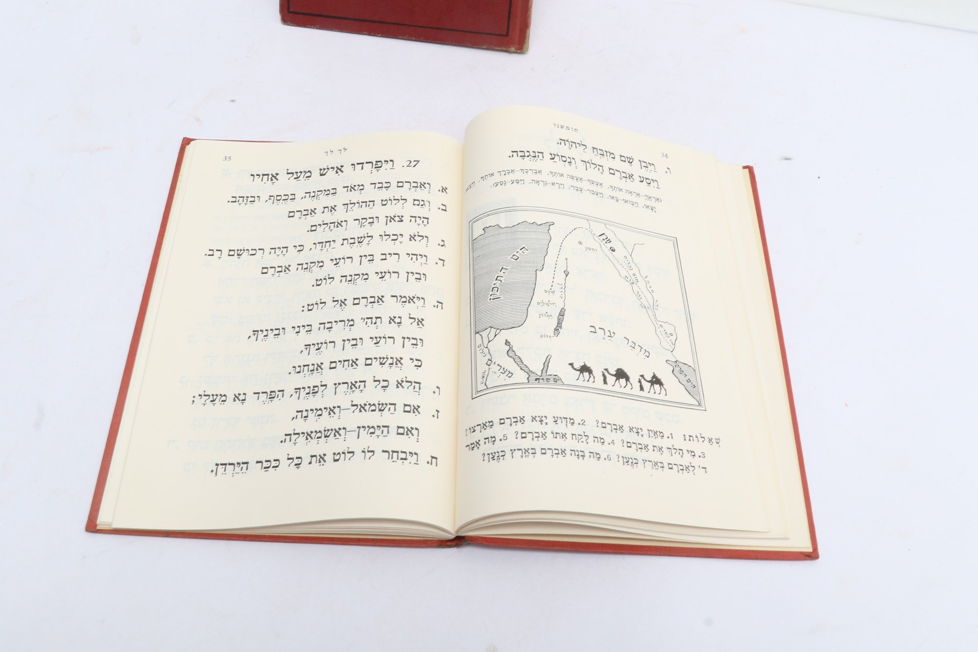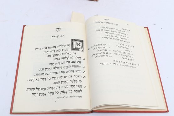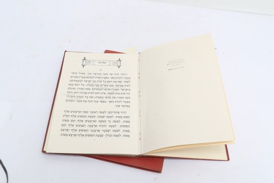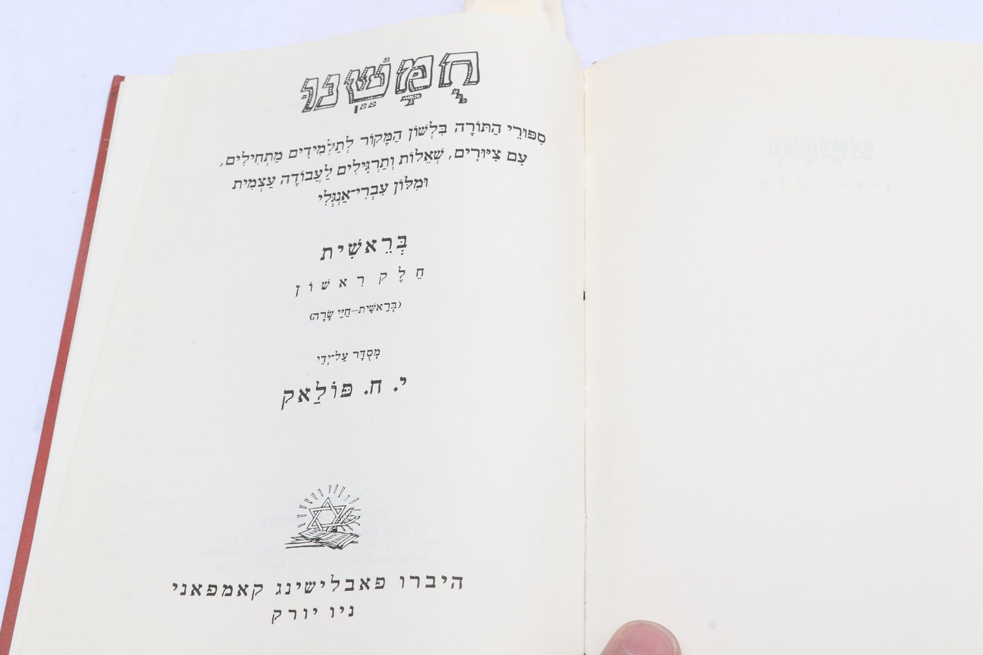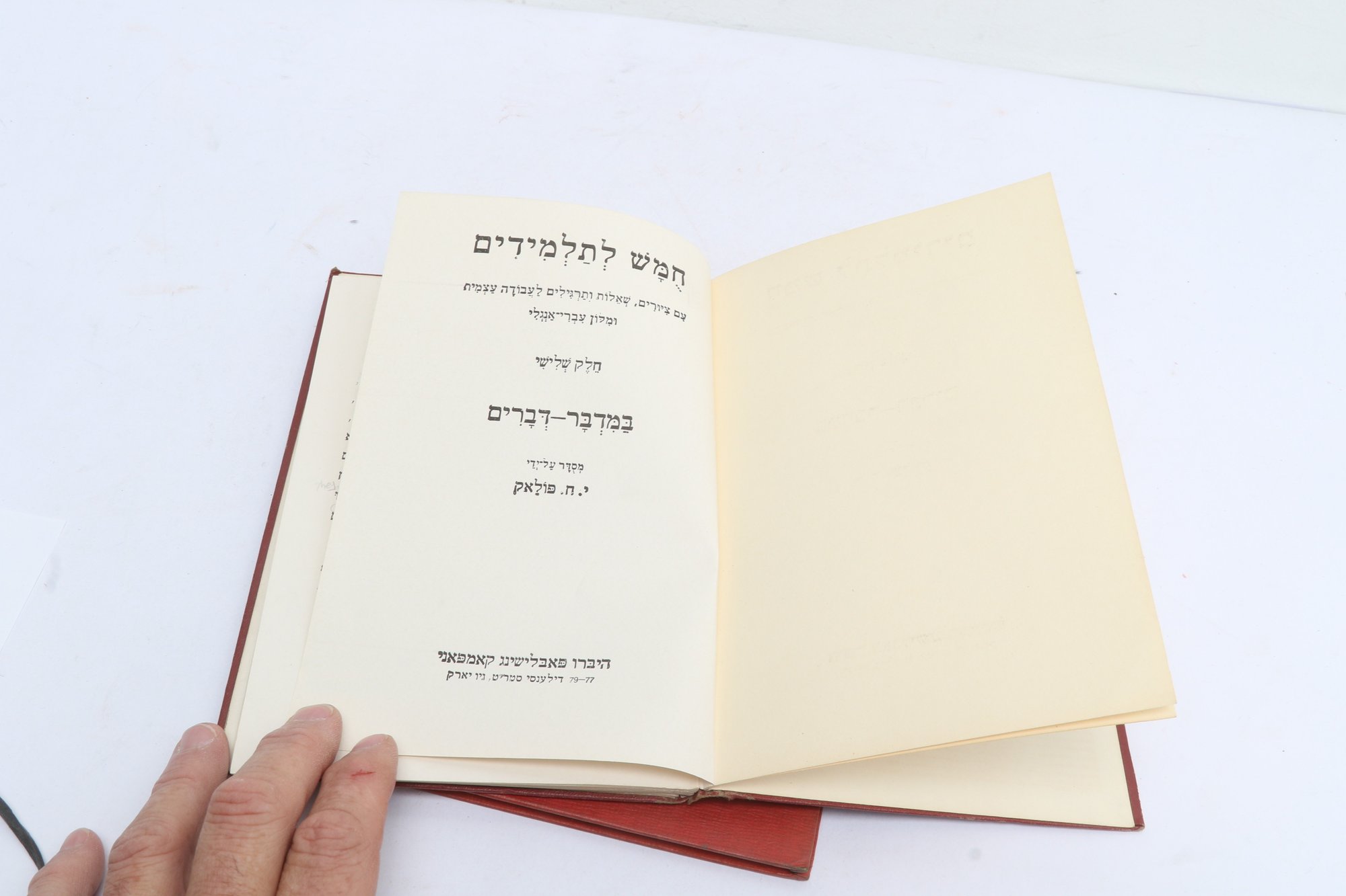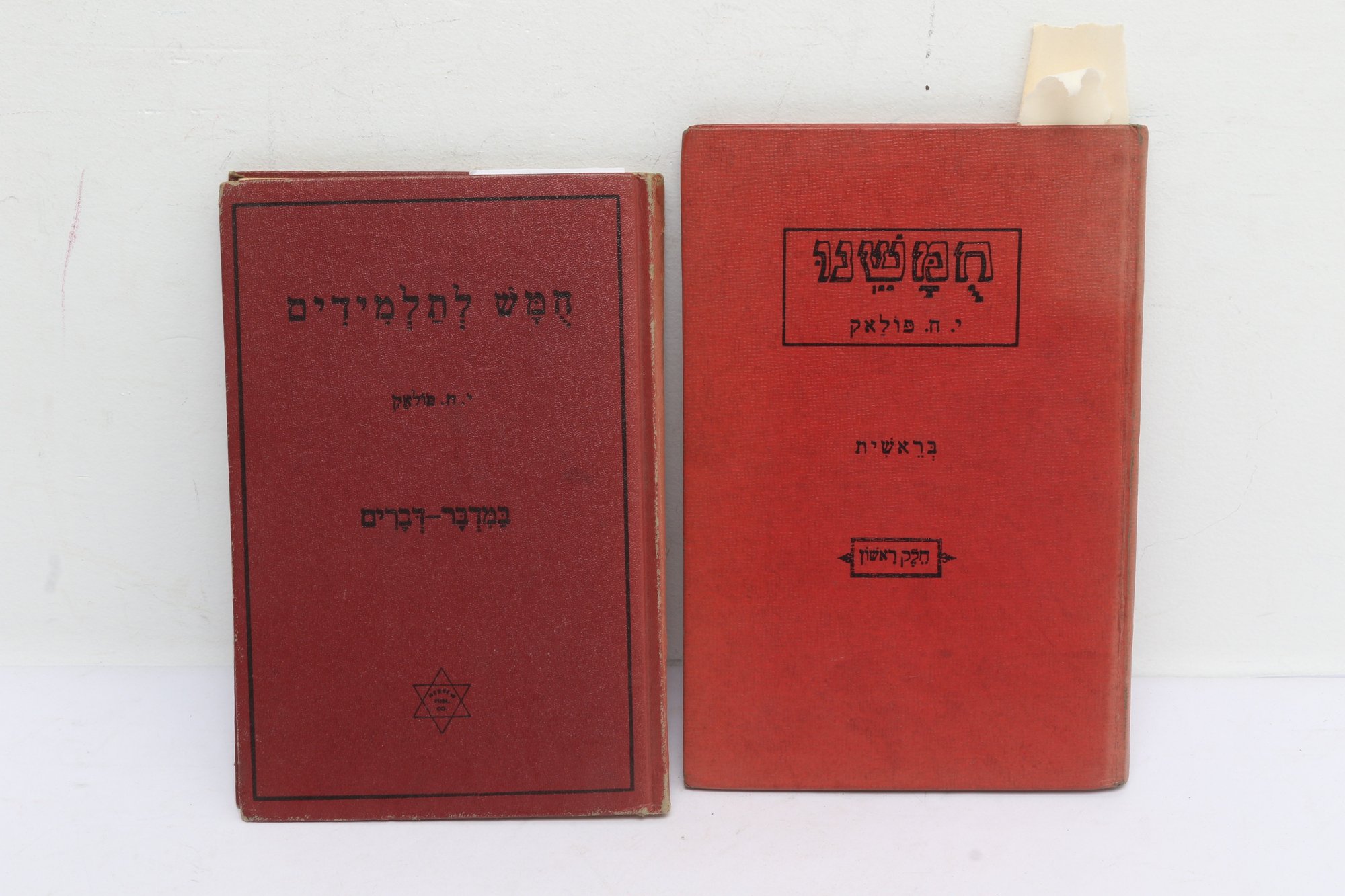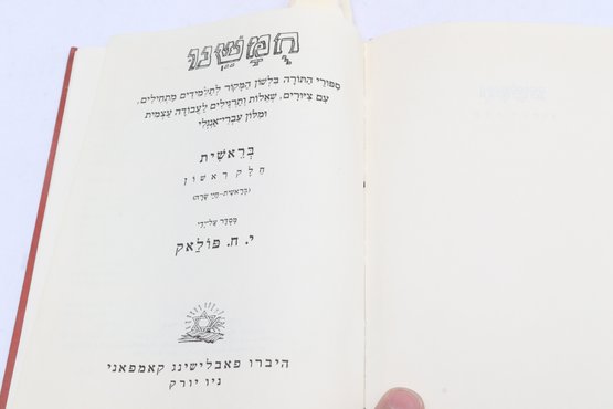POLAK, Y.H. Two Hebrew educational texts published by Hebrew Publishing Company, New York. Includes Bereshit (Genesis) volume described as story of Torah in language accessible to students, featuring questions, problems, and exercises for independent study with Hebrew-English dictionary, constituting first part of pedagogical series. Also includes Chamesh L'Talmidim (Five for Students), third volume covering Bamidbar-Devarim (Numbers-Deuteronomy), containing biblical narrative with accompanying exercises, questions, and independent study materials designed for Hebrew language instruction. These texts represent early 20th-century American Jewish educational materials produced for teaching Torah to immigrant and native-born students adapting traditional religious study to modern pedagogical methods.