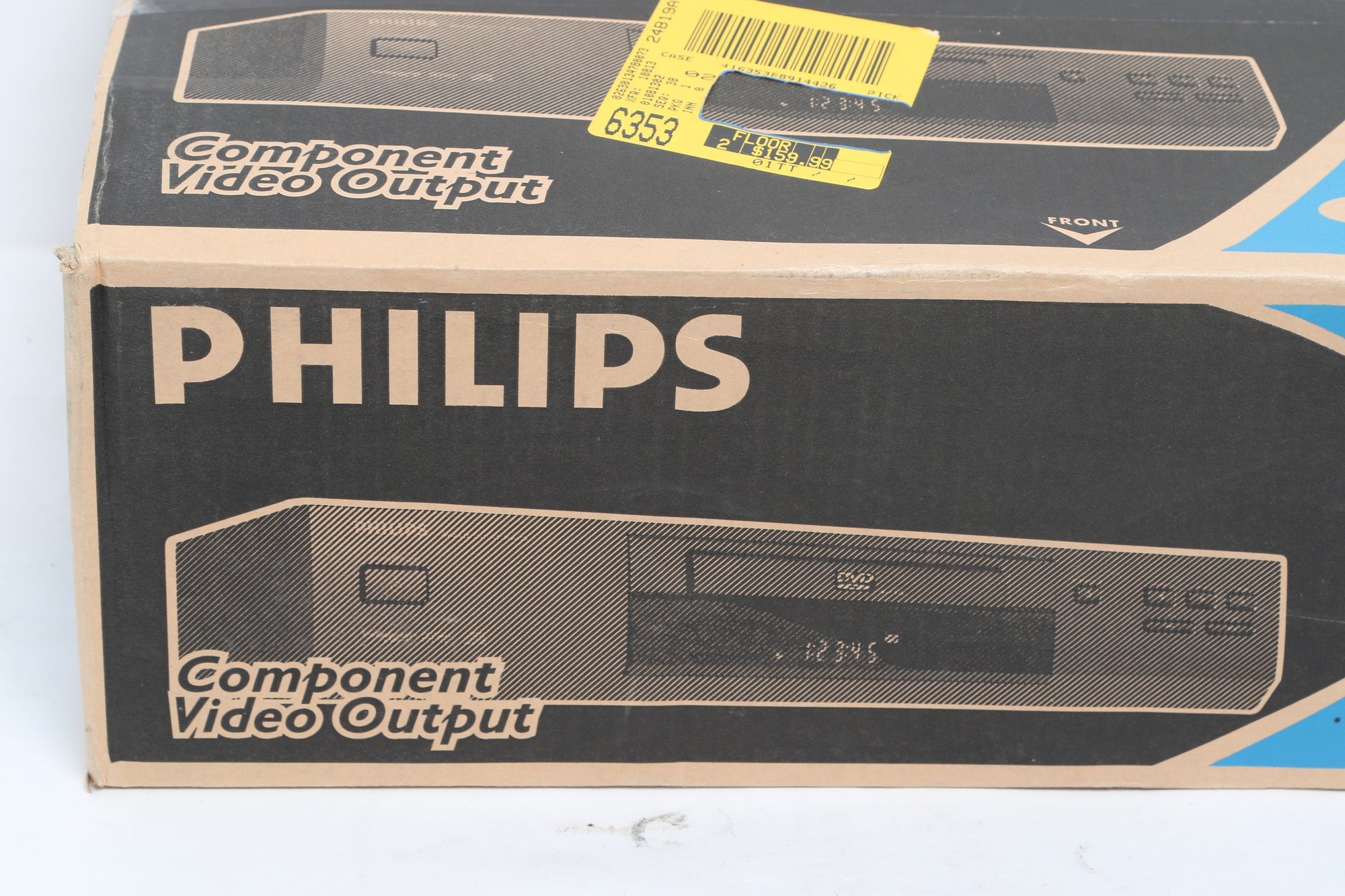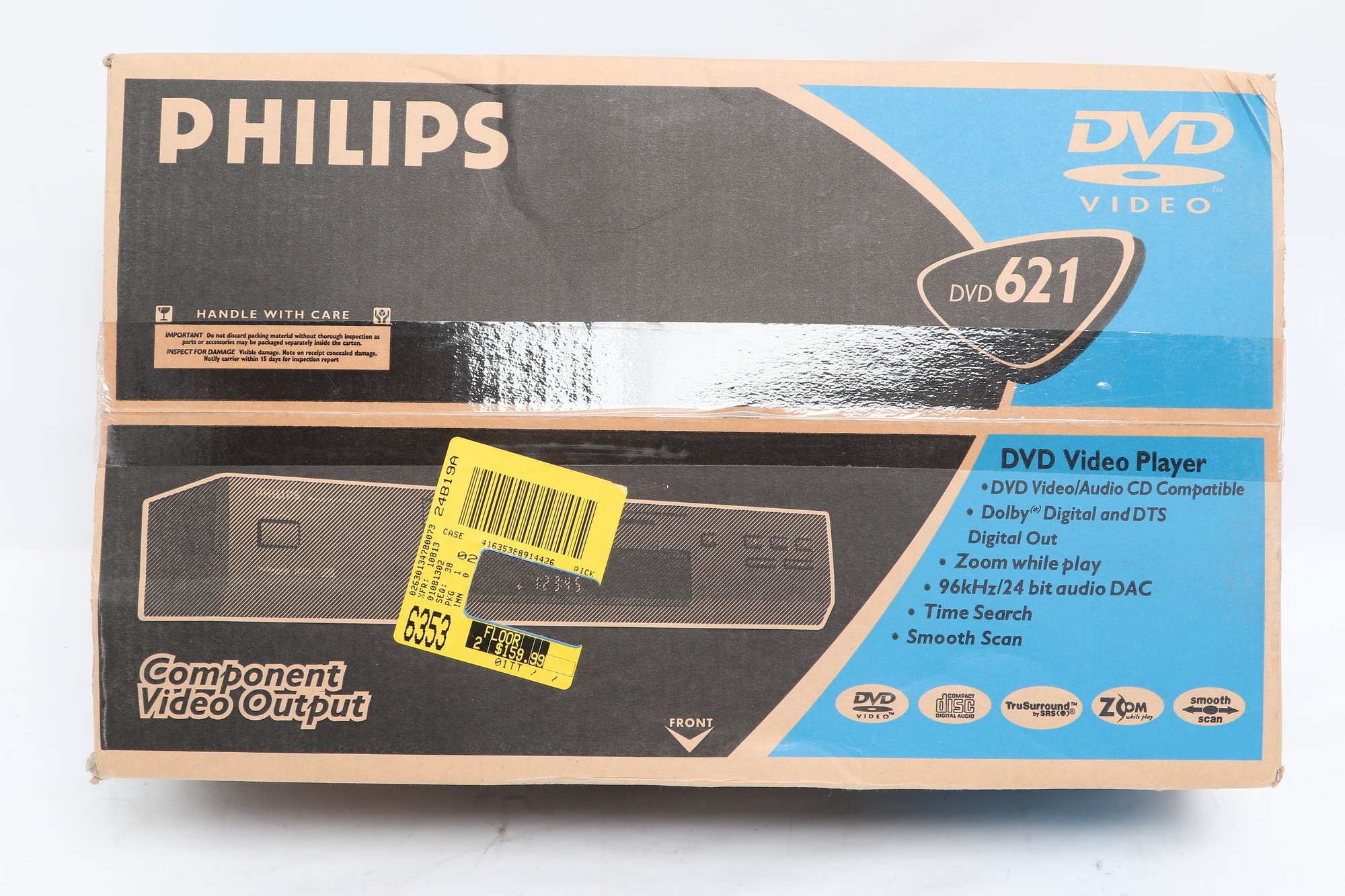 New old stock Philips DVD621 DVD video player, new in original packaging. Features component video output, Dolby Digital and DTS digital out, zoom/multi-angle playback, and time search functionality.