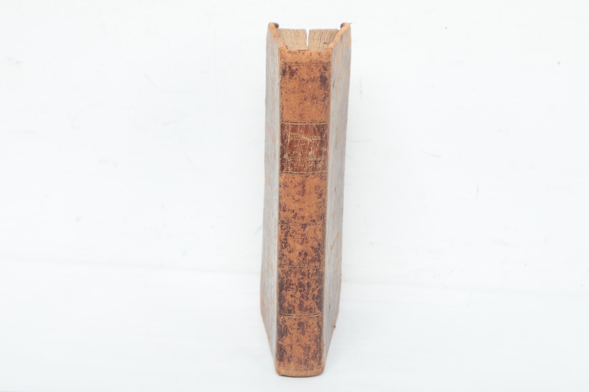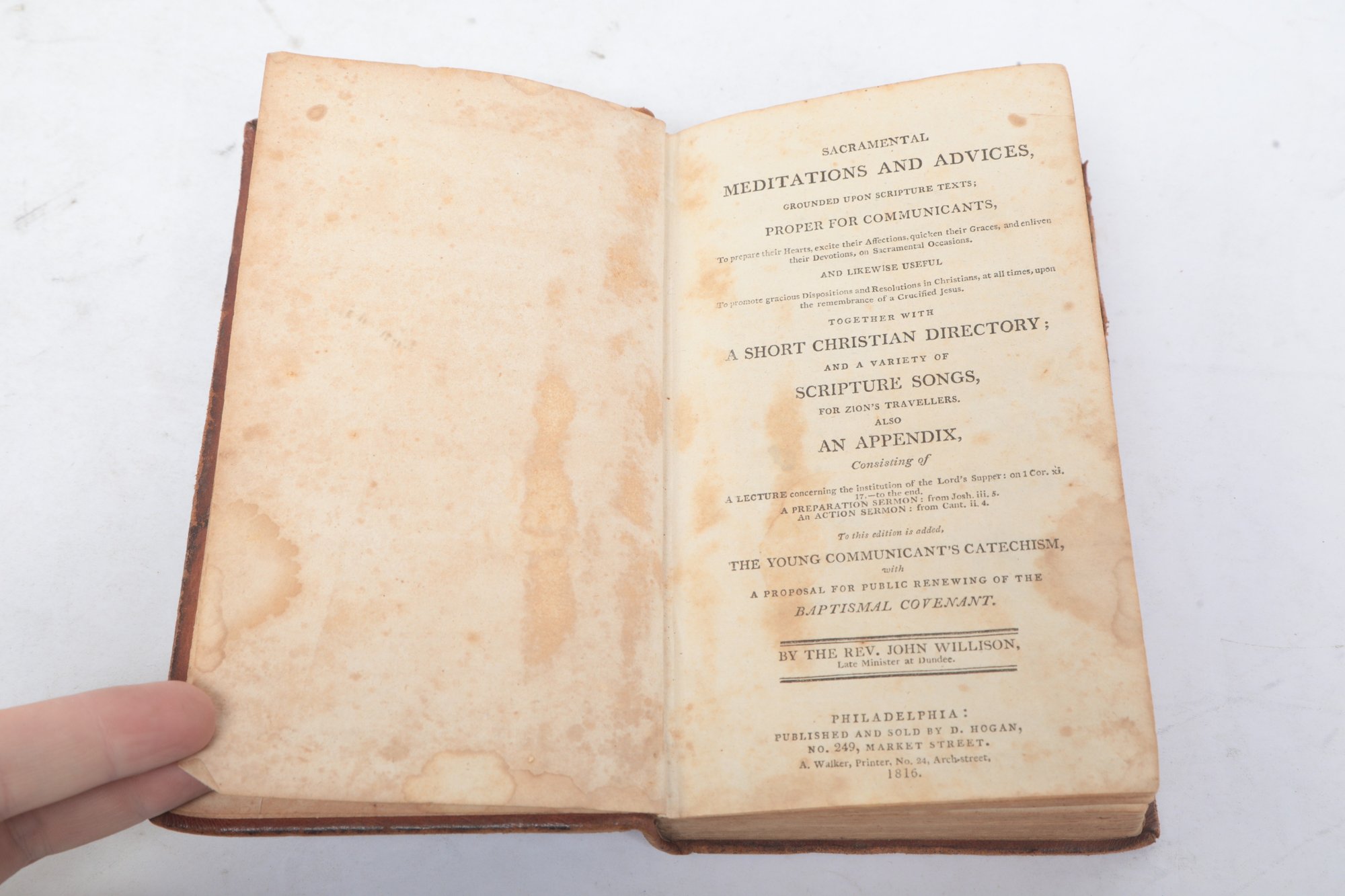 Philadelphia: Published and sold by D. Hogan, No. 249 Market Street; A. Walker, Printer, No. 24 Arch-Street, 1816. Early American edition of Sacramental Meditations and Advices, Grounded upon Scripture Texts; Proper for Communicants, together with A Short Christian Directory; and a Variety of Scripture Songs, and an appendix including The Young Communicant’s Catechism and a proposal for renewing the baptismal covenant. By the Rev. John Willison, late minister at Dundee. Small octavo in contemporary sheep, red morocco spine label (worn), covers heavily rubbed and scuffed, spine dry with surface cracking but holding. Title and preliminary leaves heavily foxed and dampstained as shown, with staining diminishing through the text. A well-used early nineteenth-century devotional volume in original binding.