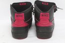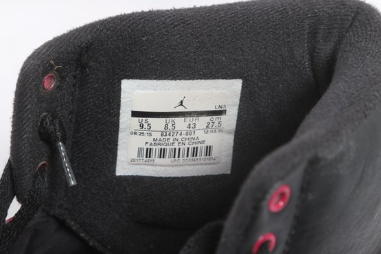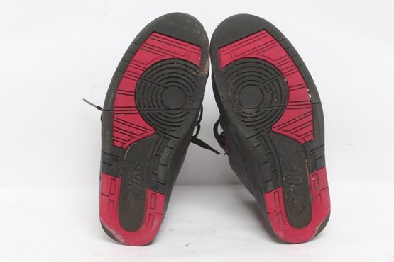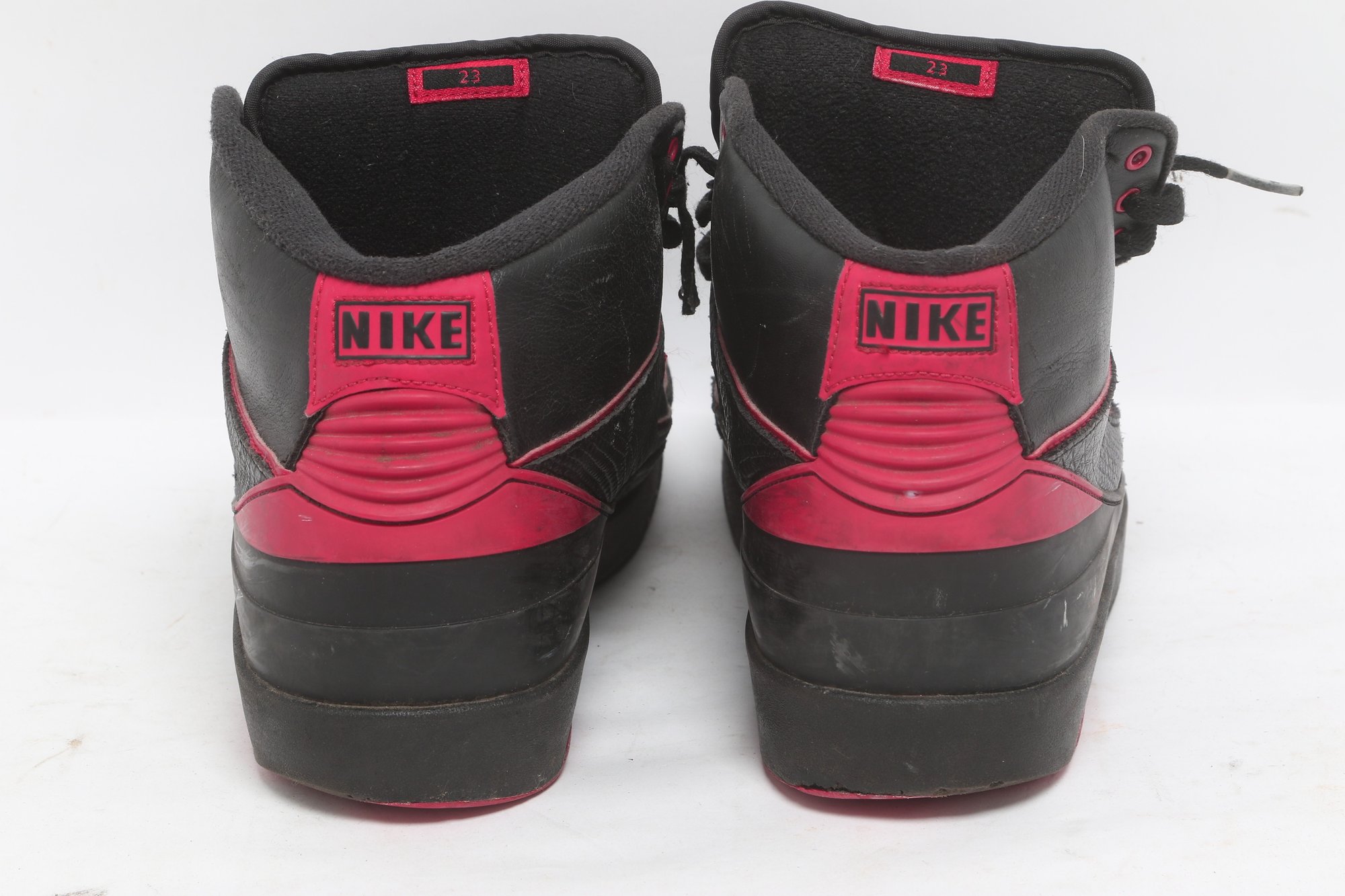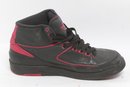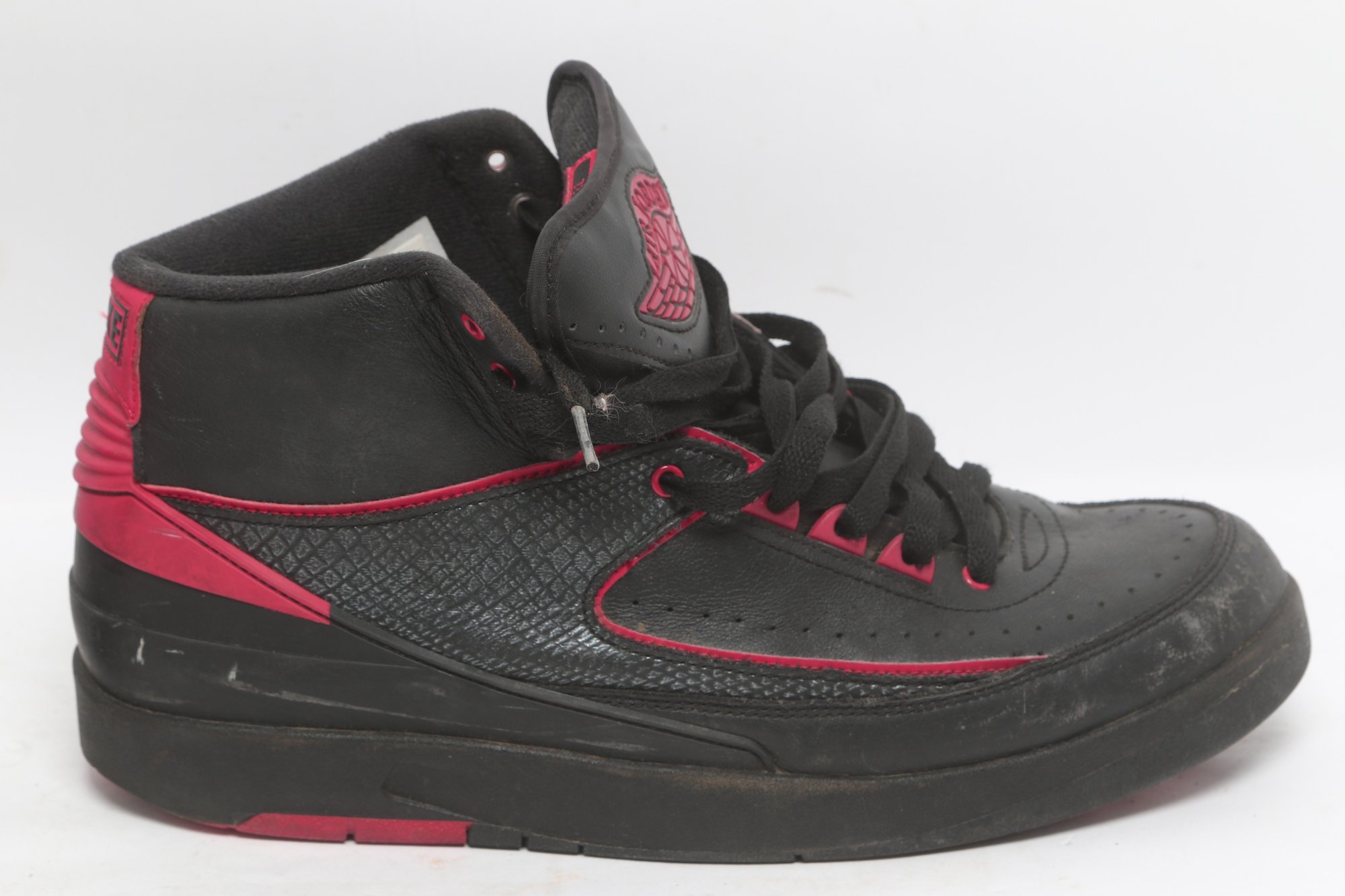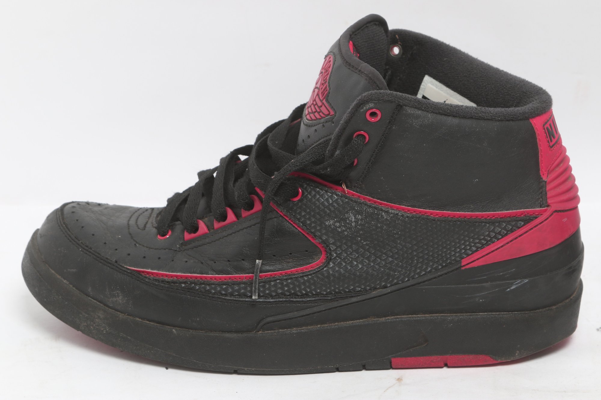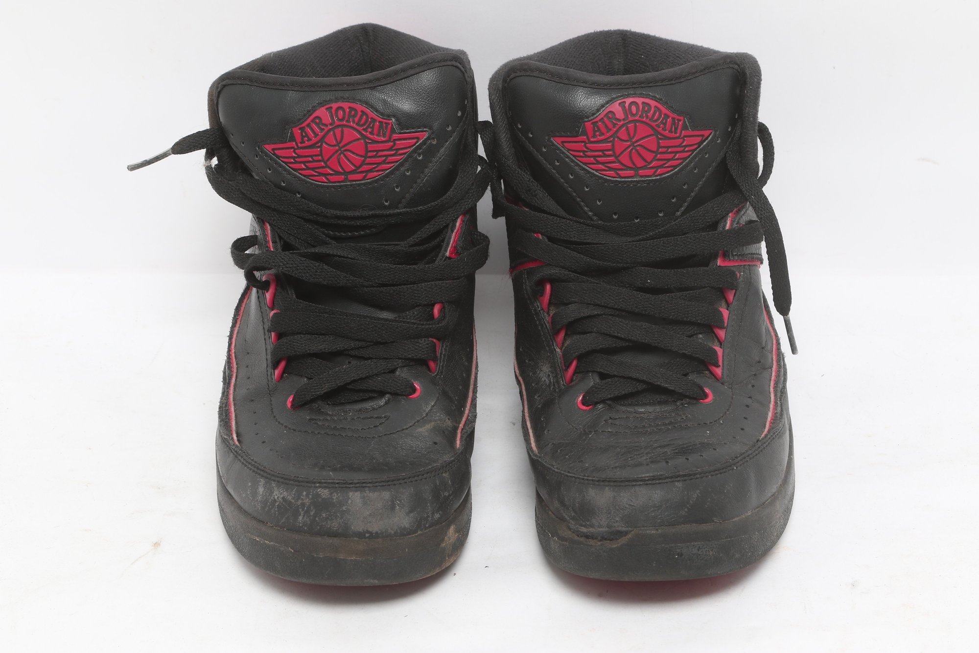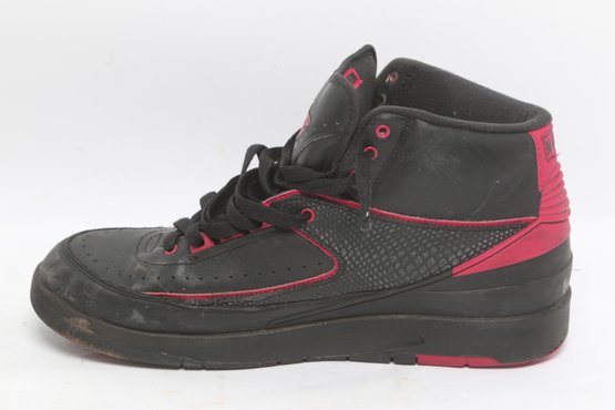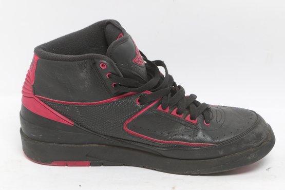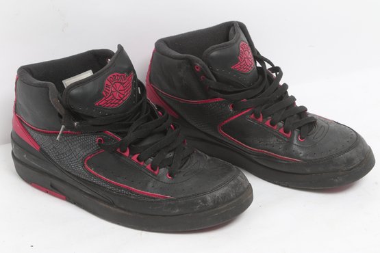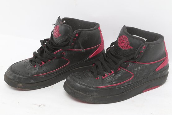 Pair of Nike Air Jordan 2 Retro sneakers in black with red accents, men’s size 9.5. Shoes show visible wear including creasing, scuffing, and dirt from use; soles have moderate wear but retain tread. Overall fair pre-owned condition, sold as-is.