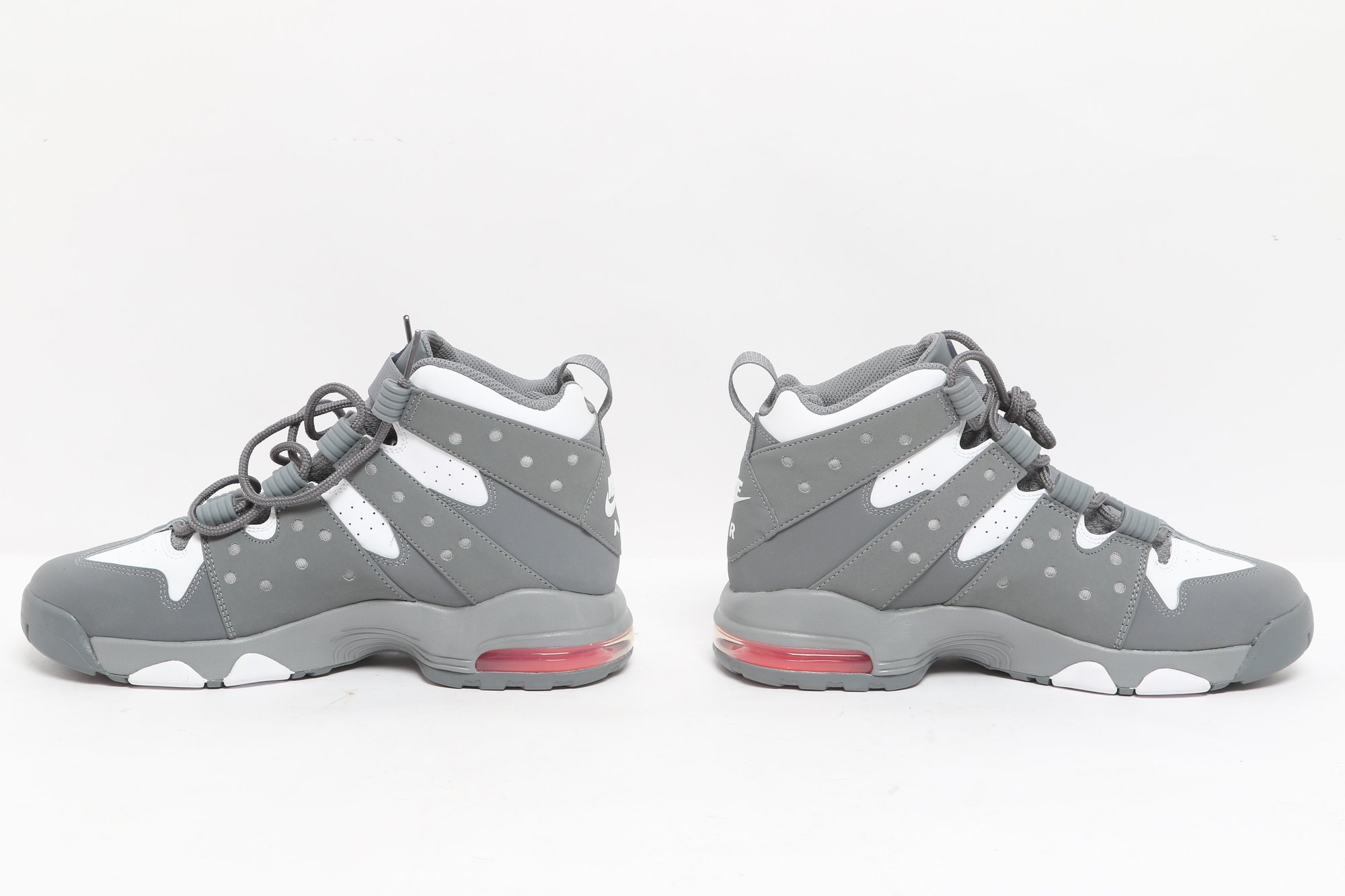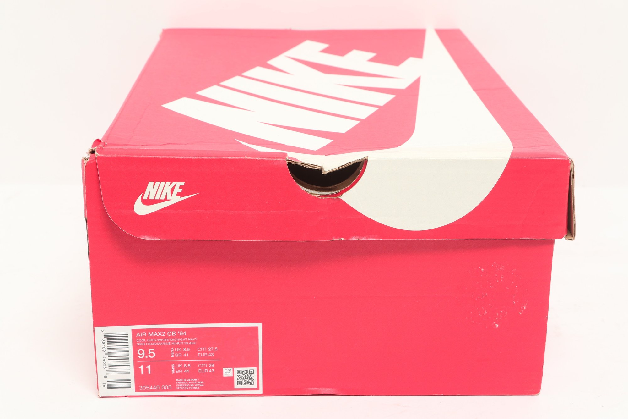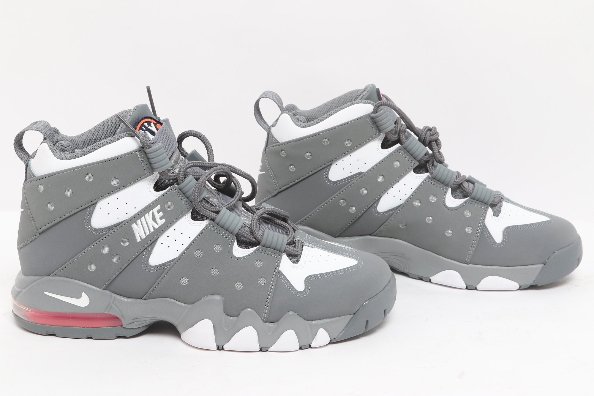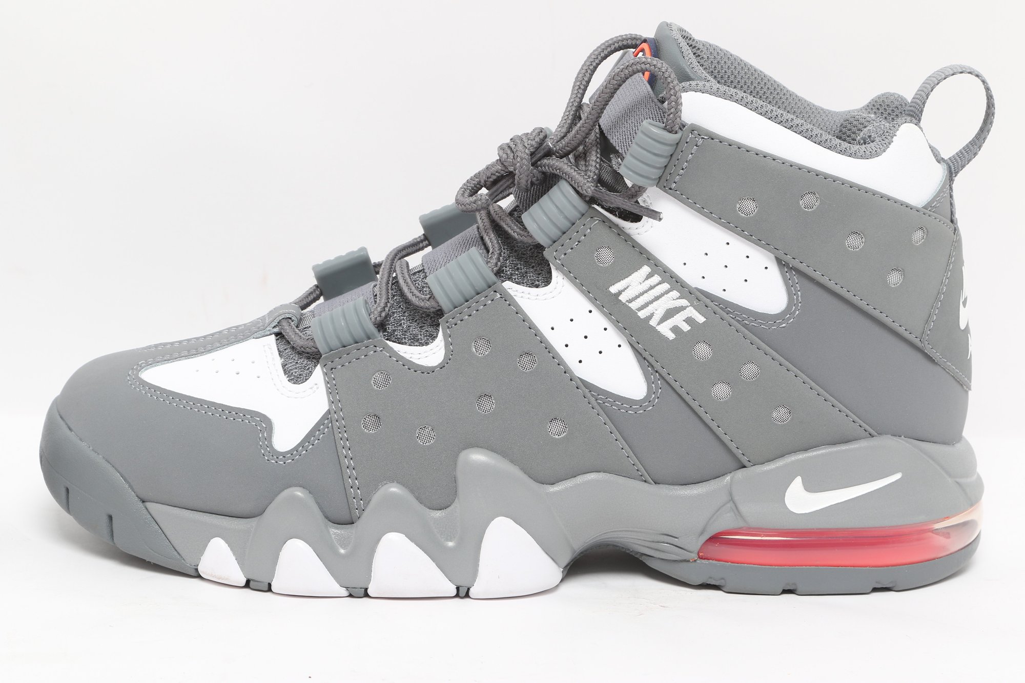 Nike Air Max CB 94 GS sneakers in gray and white colorway with visible Air cushioning and rugged outsole design. Includes original Nike box; pre-owned with light wear, great for casual or athletic use.