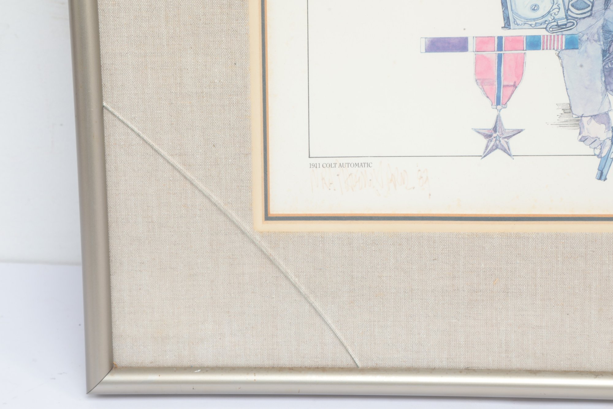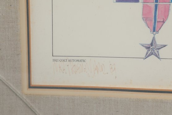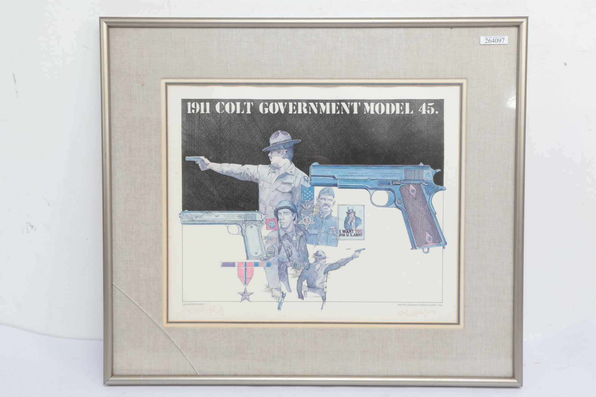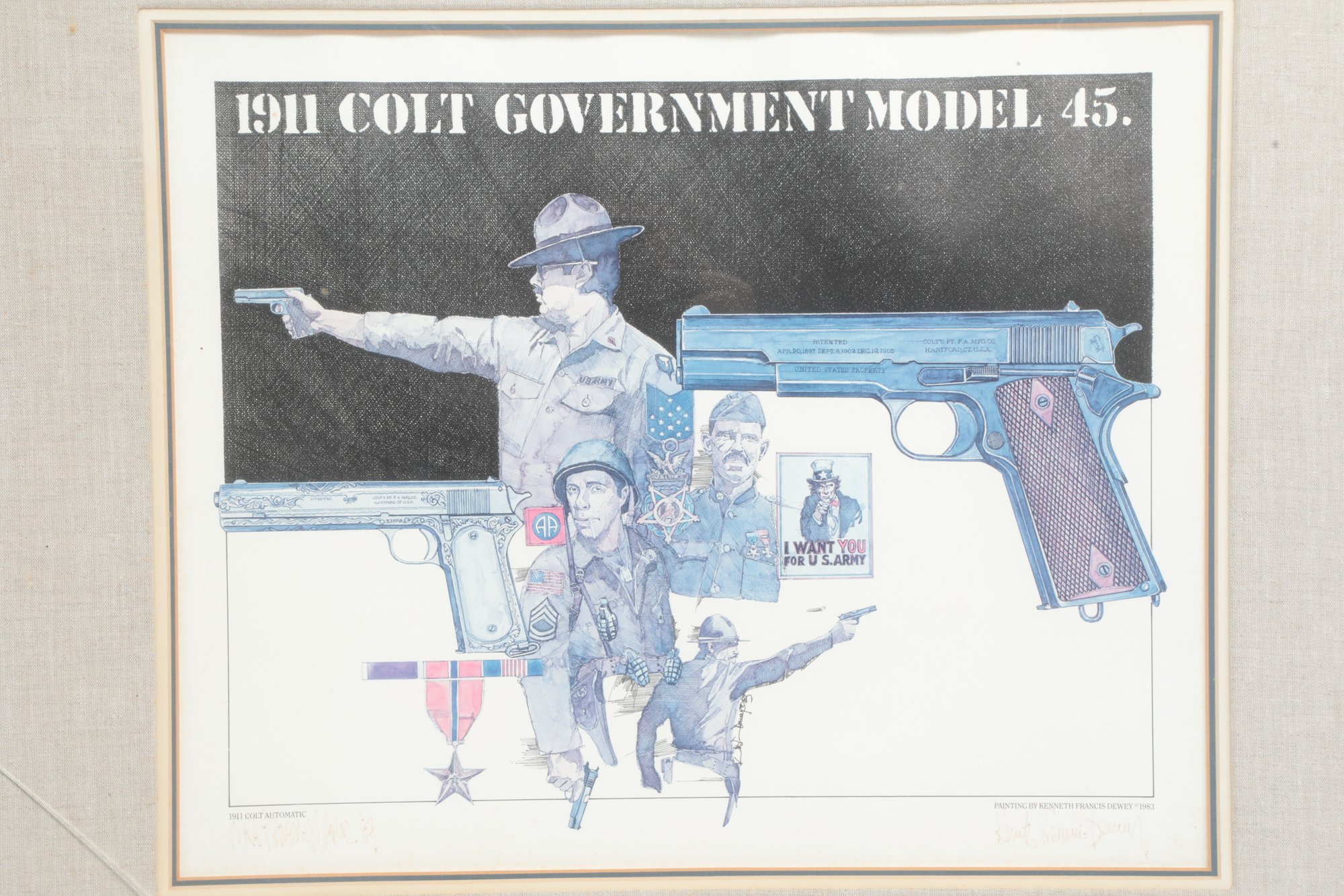 Kenneth Francis Dewey Framed 1911 Cold Automatic Pistol Print. Print 1C-A of series. See pictures carefully for details on size and condition. Frame measures approximately 27" x 23". Glass is broken in corner.