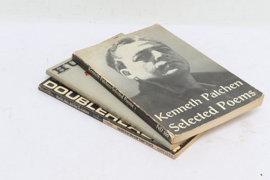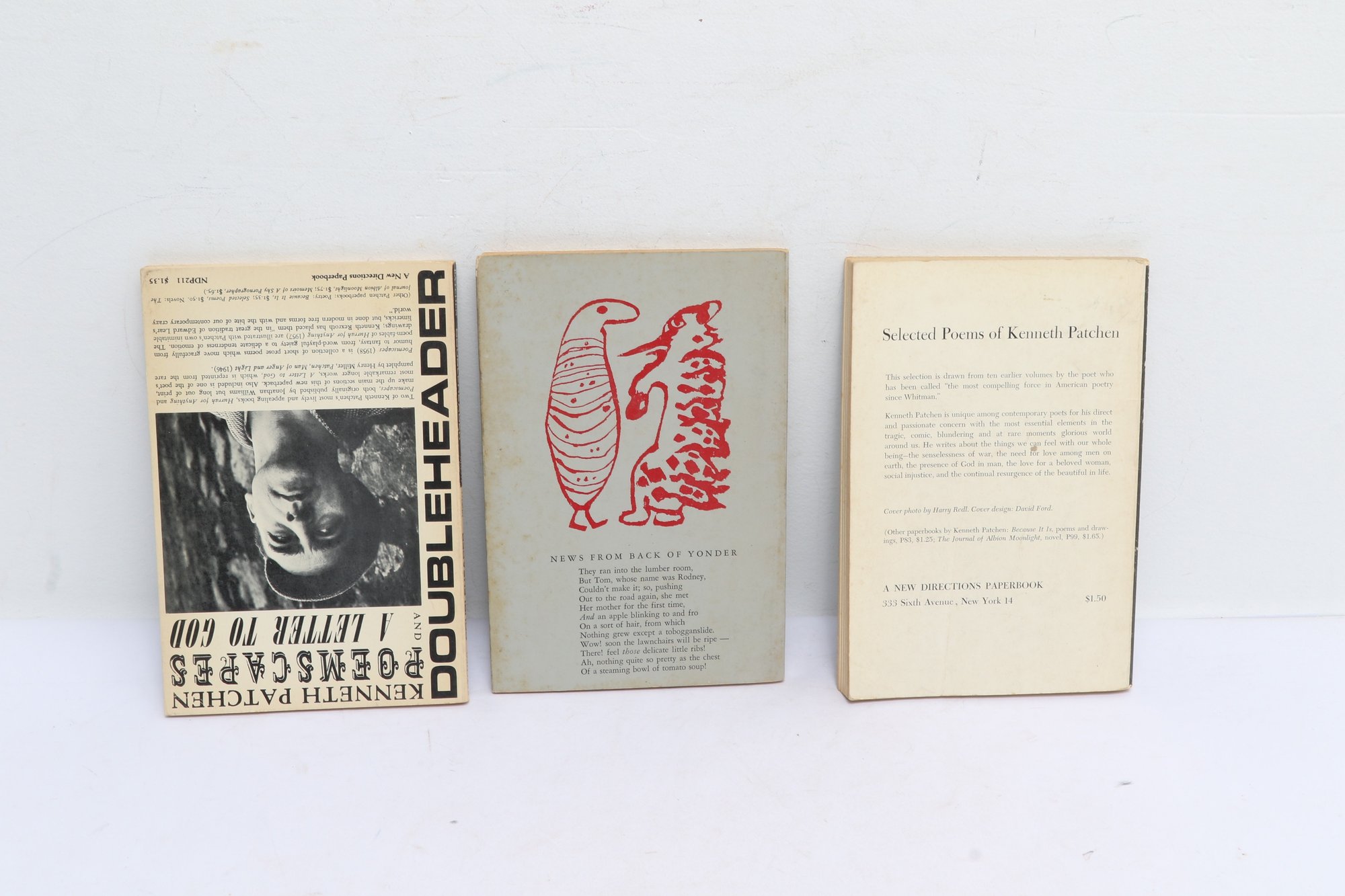 Three volumes by experimental poet Kenneth Patchen documenting his fusion of poetry and visual art. "Doubleheader" published by New Directions paperback features Patchen's characteristic whimsical figure illustration on black cover. "Hurrah for Anything" presents poems and drawings by Kenneth Patchen in cream wrappers with cartoon figure illustration. "Kenneth Patchen Selected Poems" includes photographic portrait of the author on cover. Patchen bridged Beat Generation poetry with visual experimentation, creating "poem-paintings" that integrated text and image in innovative ways during the mid-20th century avant-garde movement.