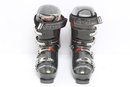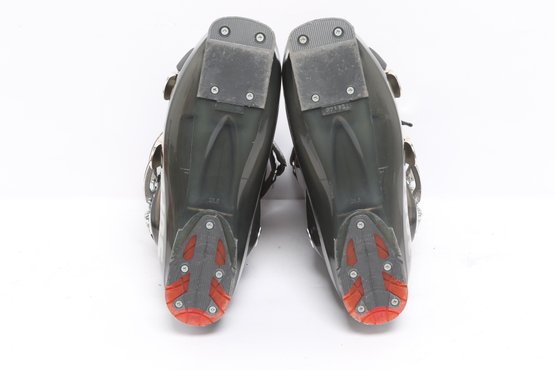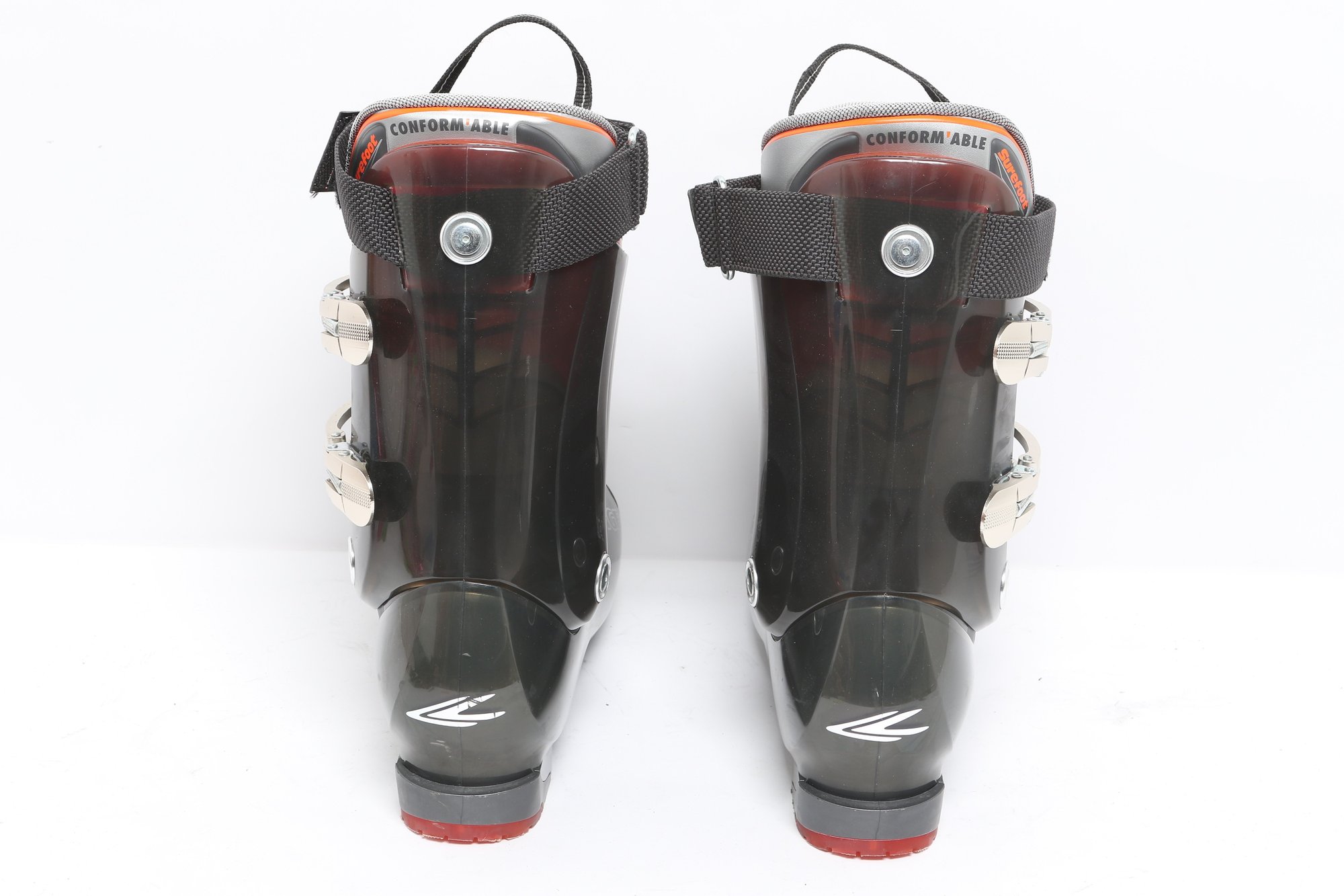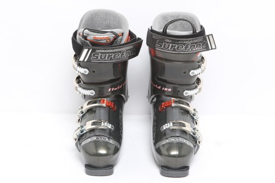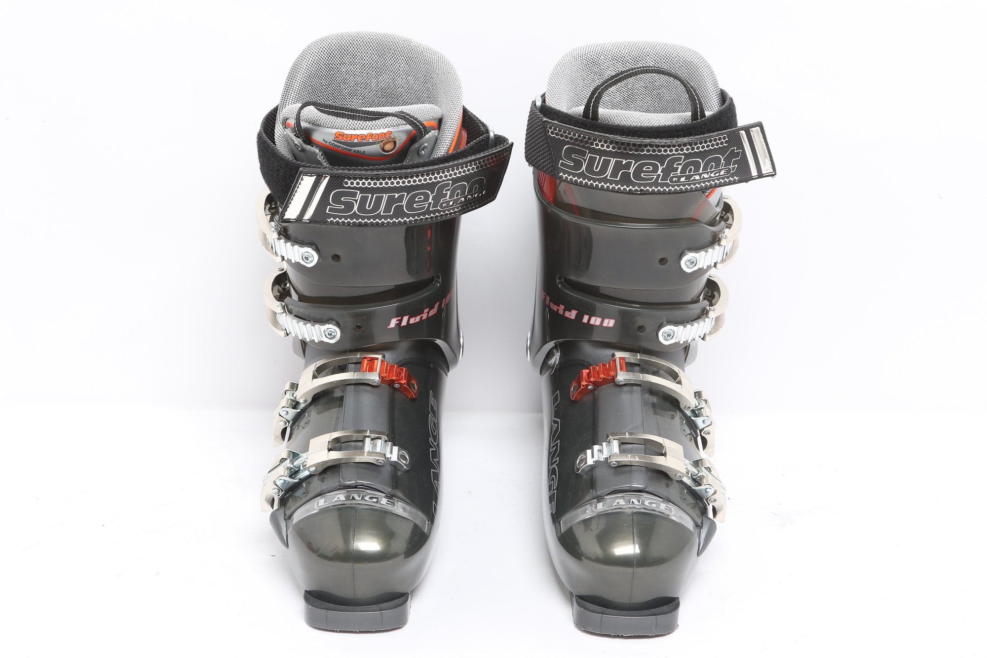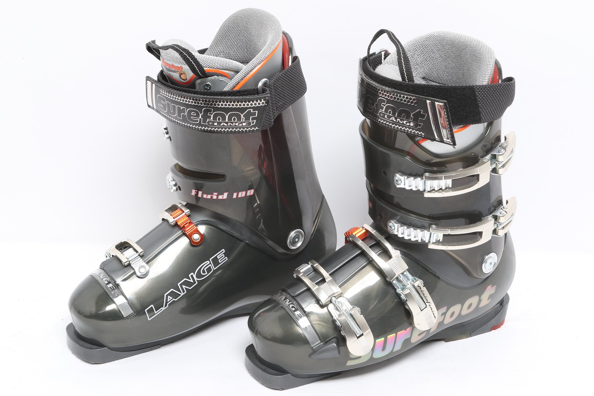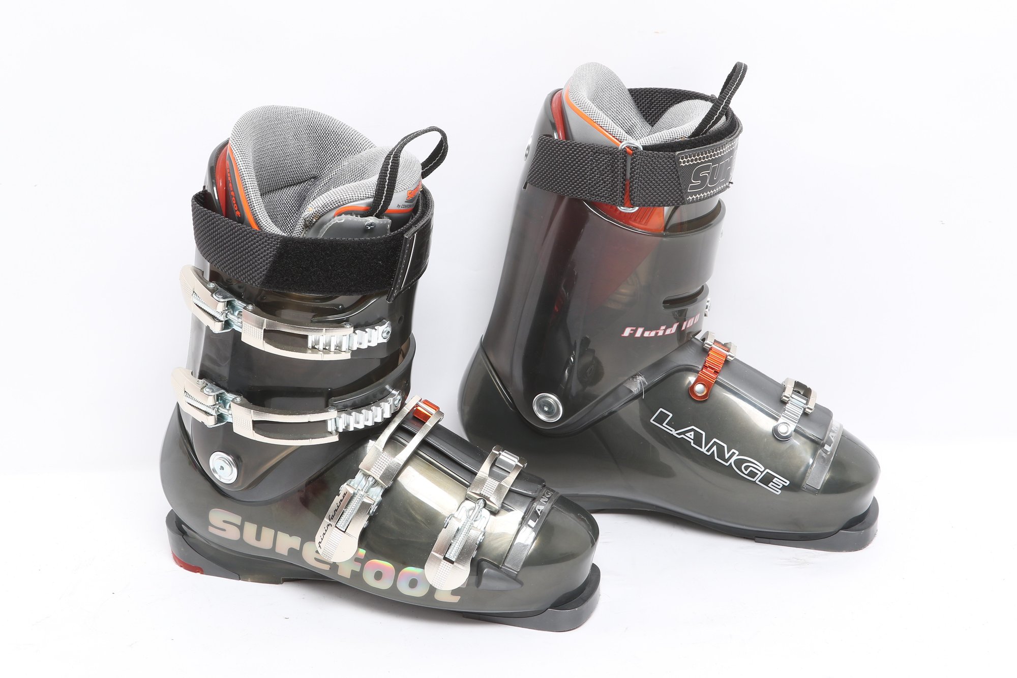 Lange Surefoot Fluid 100 ski boots featuring durable hard shell construction with adjustable buckles and secure strap closures. Designed for alpine skiing performance; pre-owned with visible wear from use.