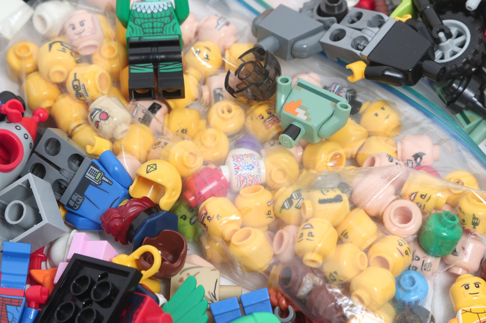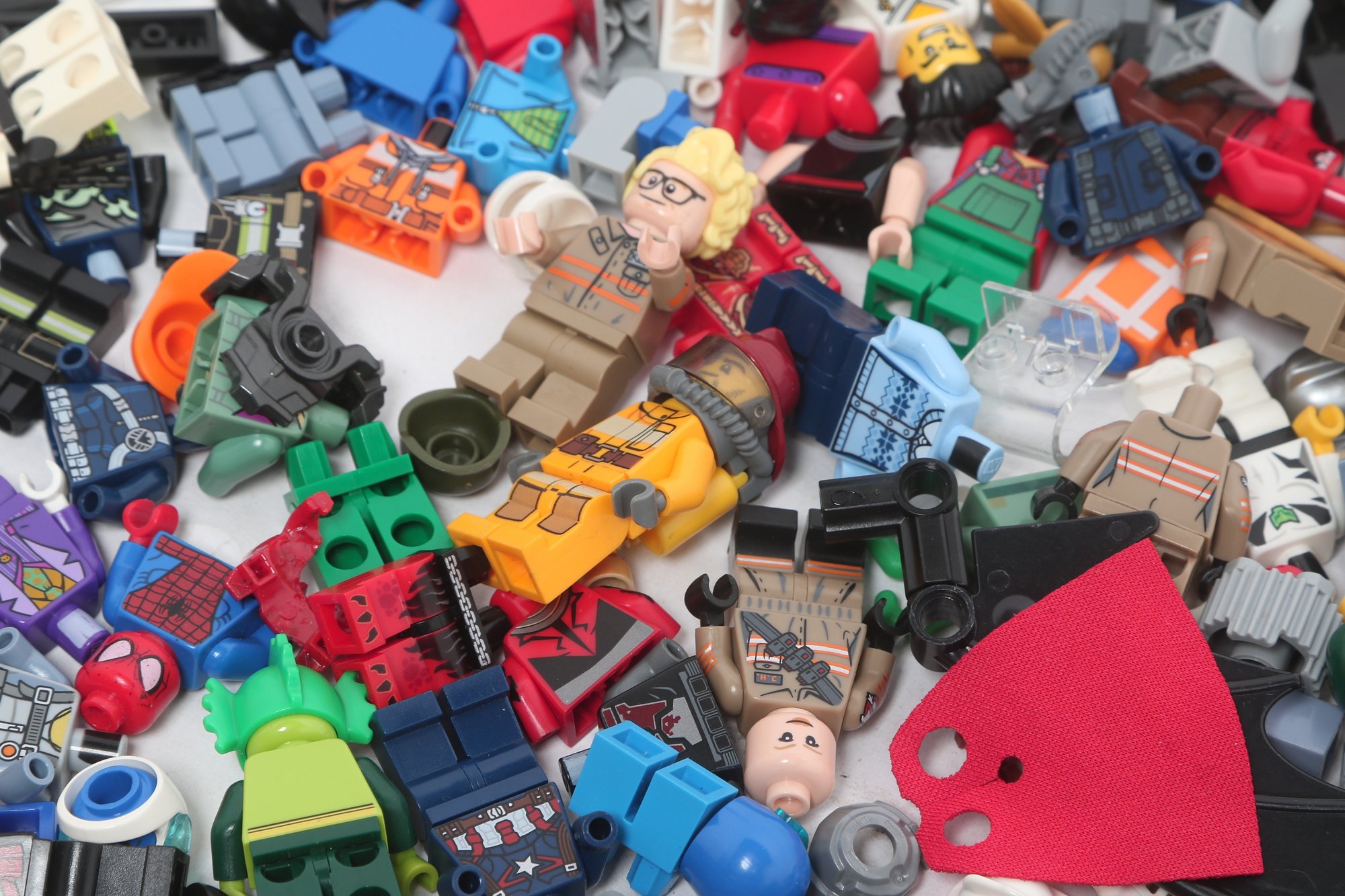 Large assorted lot of LEGO minifigures and parts weighing approximately 2.5 pounds. Includes a wide variety of characters, accessories, and mixed pieces from different sets. Ideal for collectors, builders, or resale. Pre-owned with typical play wear.