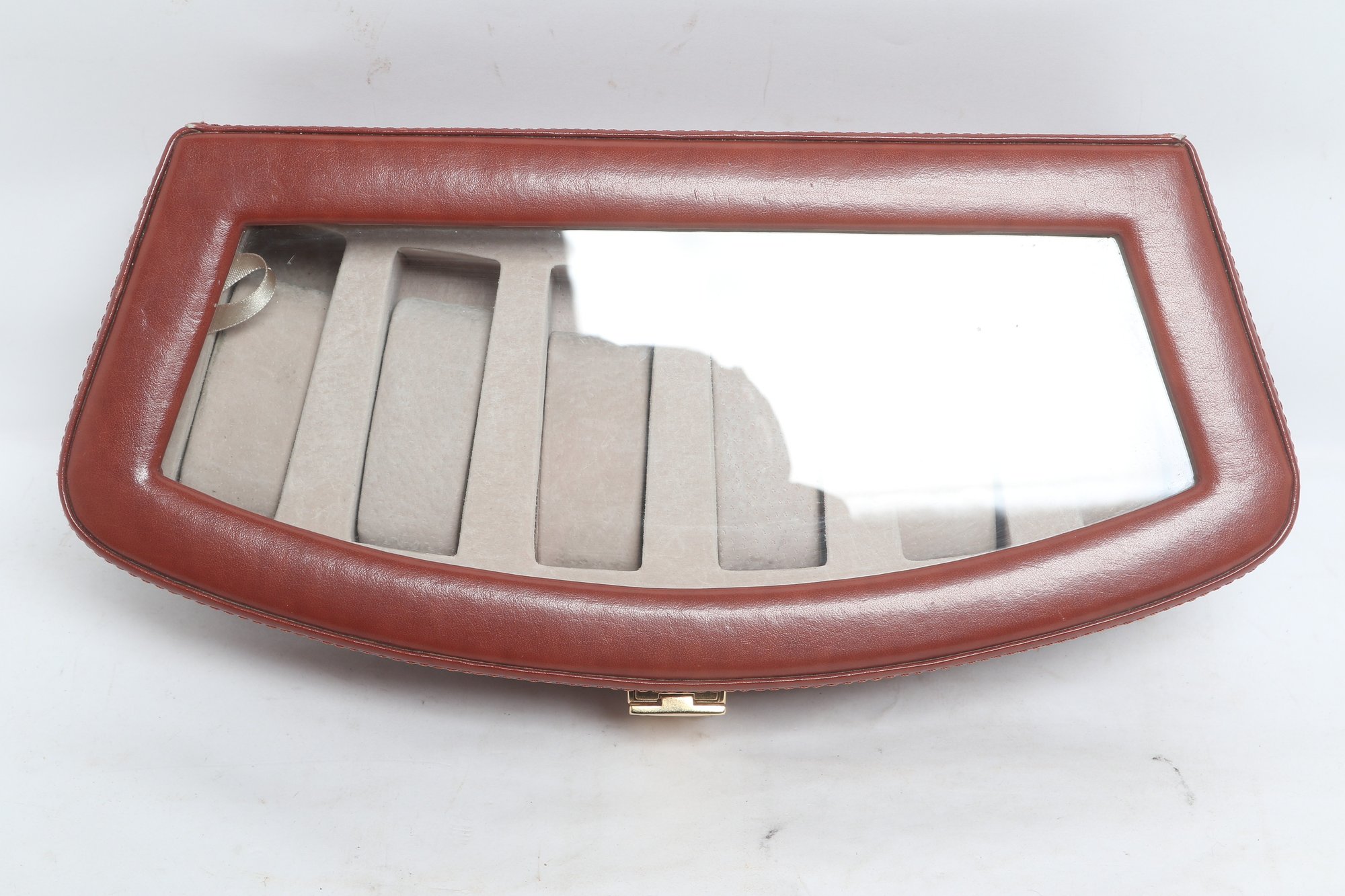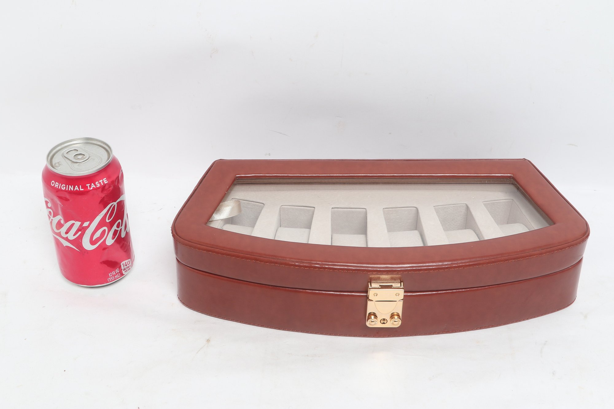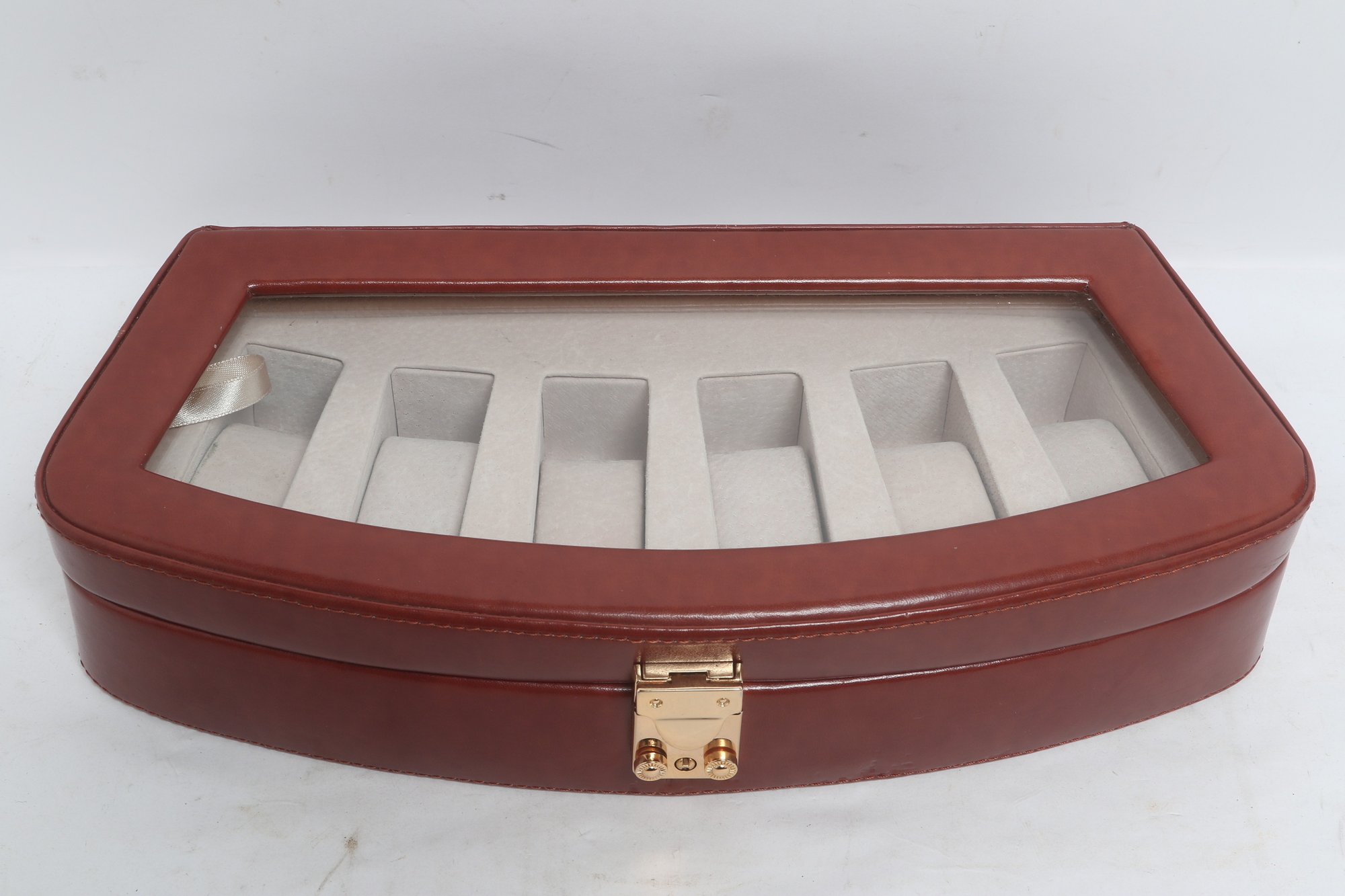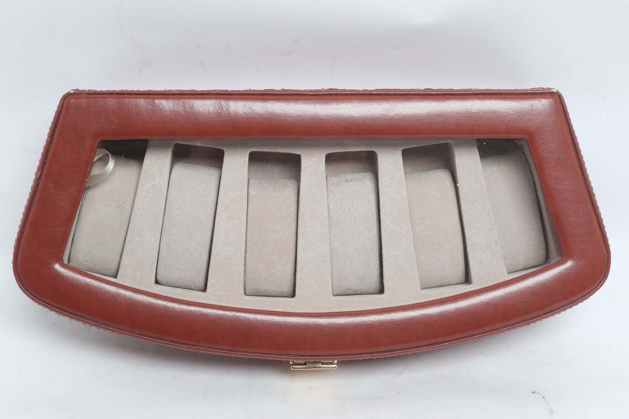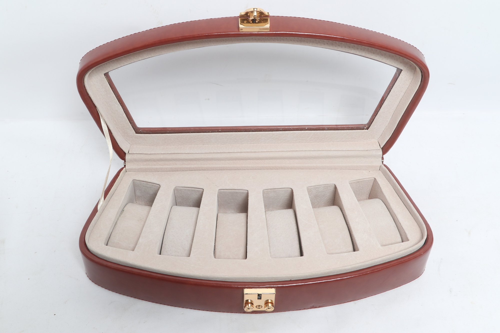 Elegant leather watch display case featuring a glass top lid and soft interior compartments for up to six watches. Designed for secure storage and easy viewing, with a latch closure and neutral lining. Pre-owned with light wear, overall in good condition.