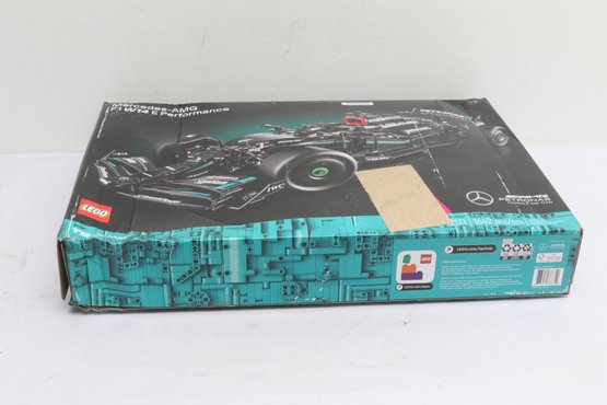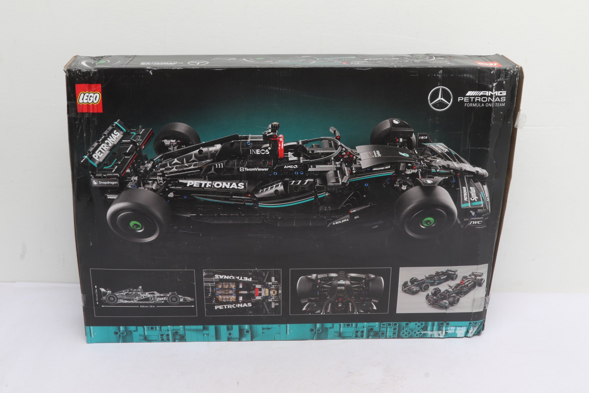 The original box is included and shows heavy shelf wear, creasing, scuffing, and tape residue from storage and handling.