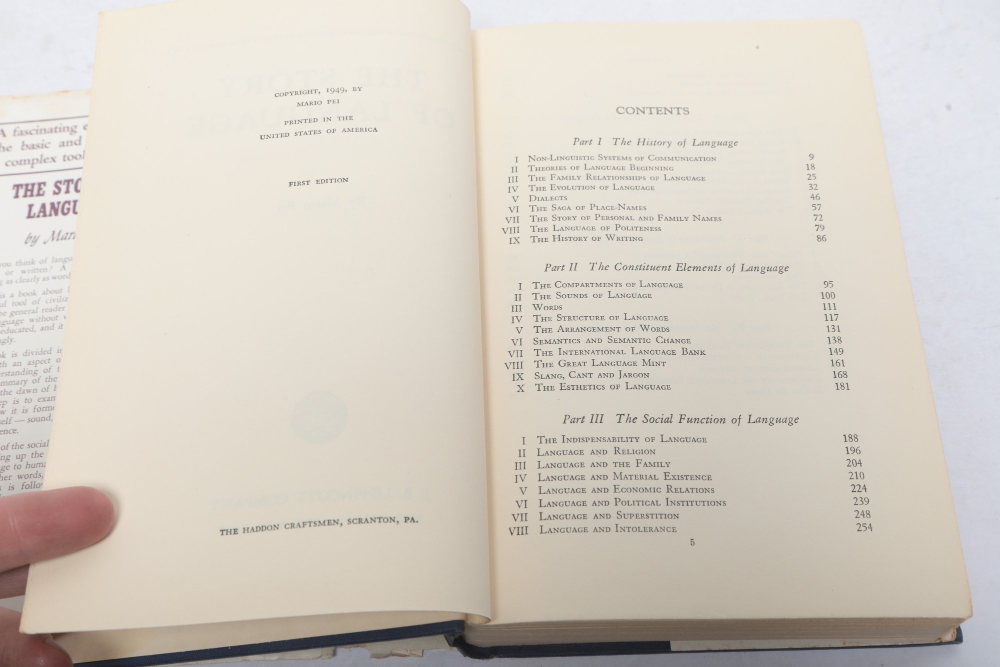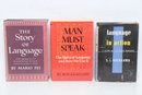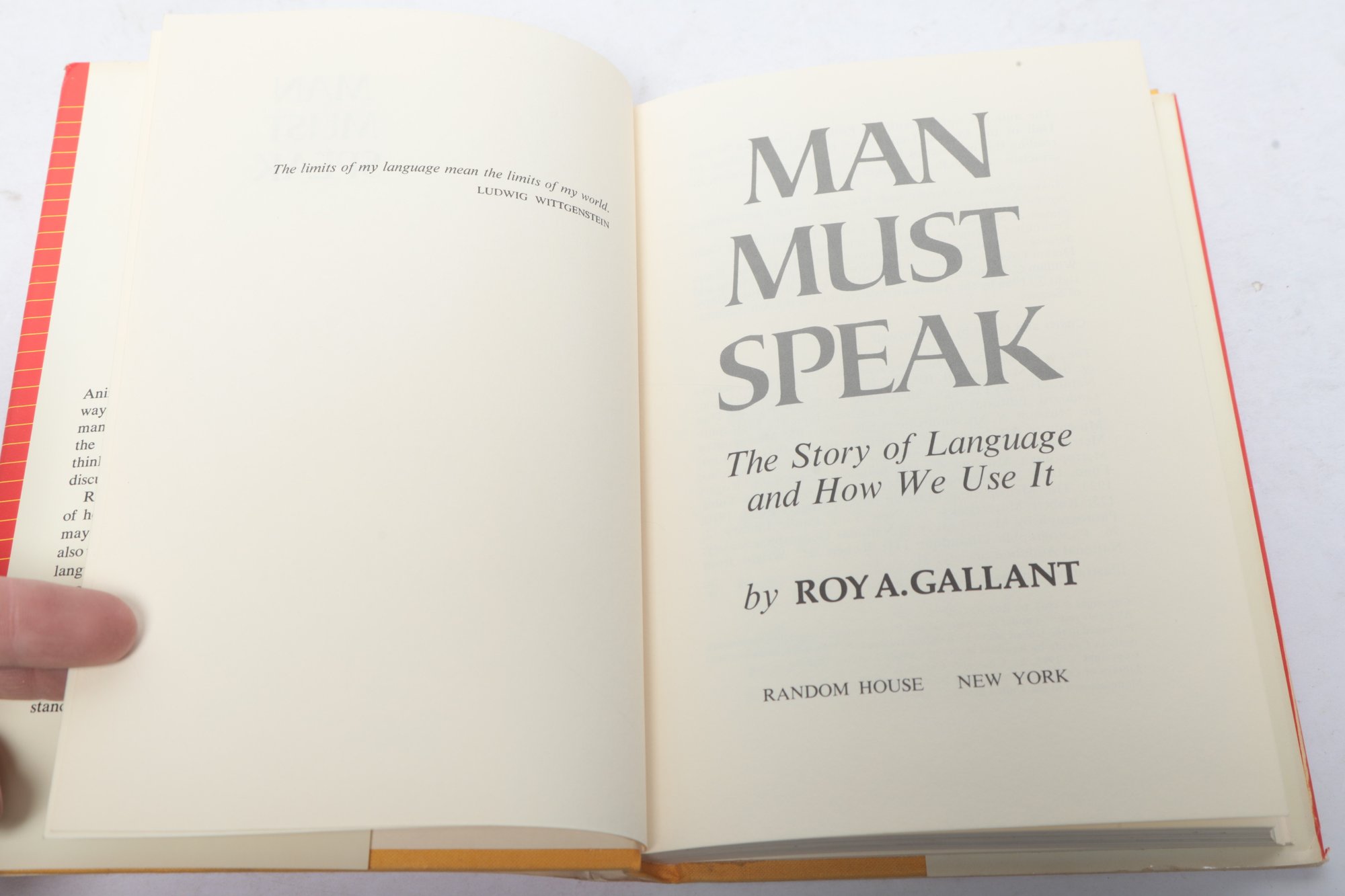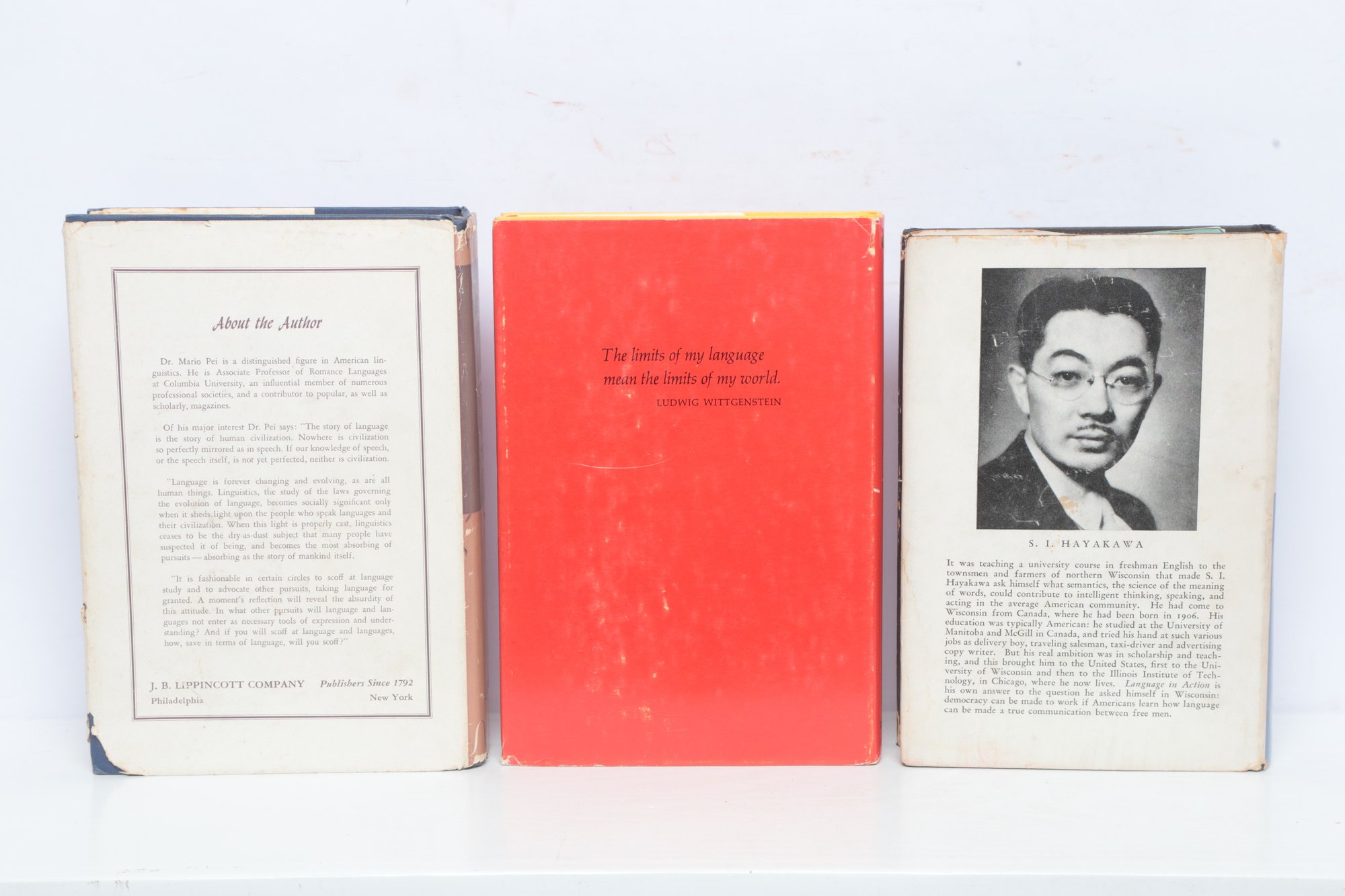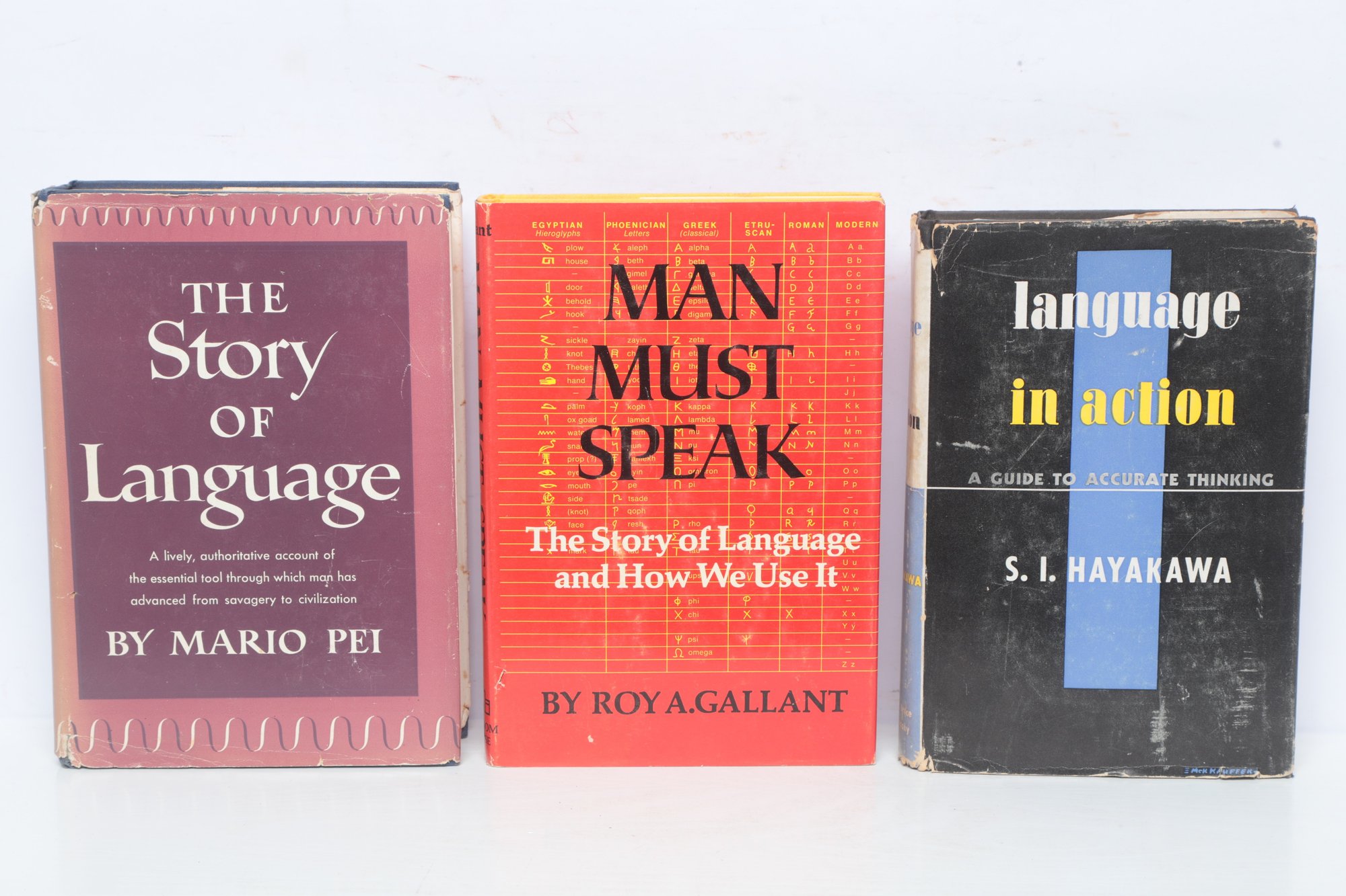 A trio of mid-century hardcover volumes exploring the history and mechanics of communication. Includes The Story of Language by Mario Pei, Man Must Speak by Roy A. Gallant, and S. I. Hayakawa’s seminal work Language in Action. These scholarly titles feature original dust jackets and cover a range of linguistic history and general semantics.