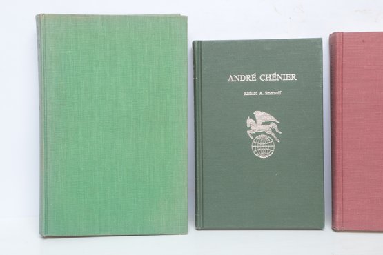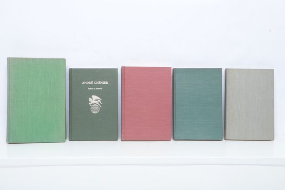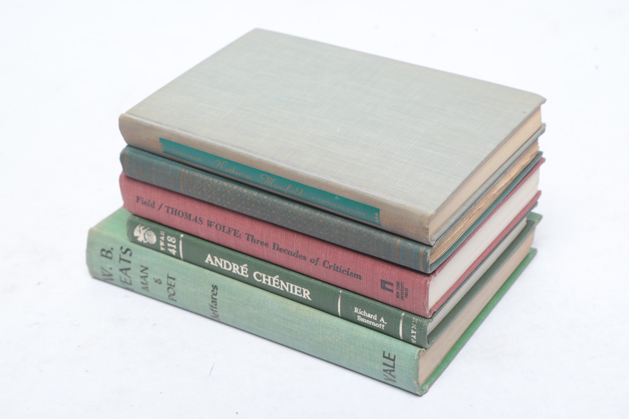 Scholarly Literary History: Five hardcover volumes in cloth bindings. New Haven/New York/Boston: Yale University Press, Oxford University Press, NYU Press, and Twayne Publishers, 1939–1971. Includes titles on Katherine Mansfield, W.B. Yeats, Thomas Wolfe, Andre Chénier, and Oliver Wendell Holmes. Bindings show light shelf wear and spine sunning.