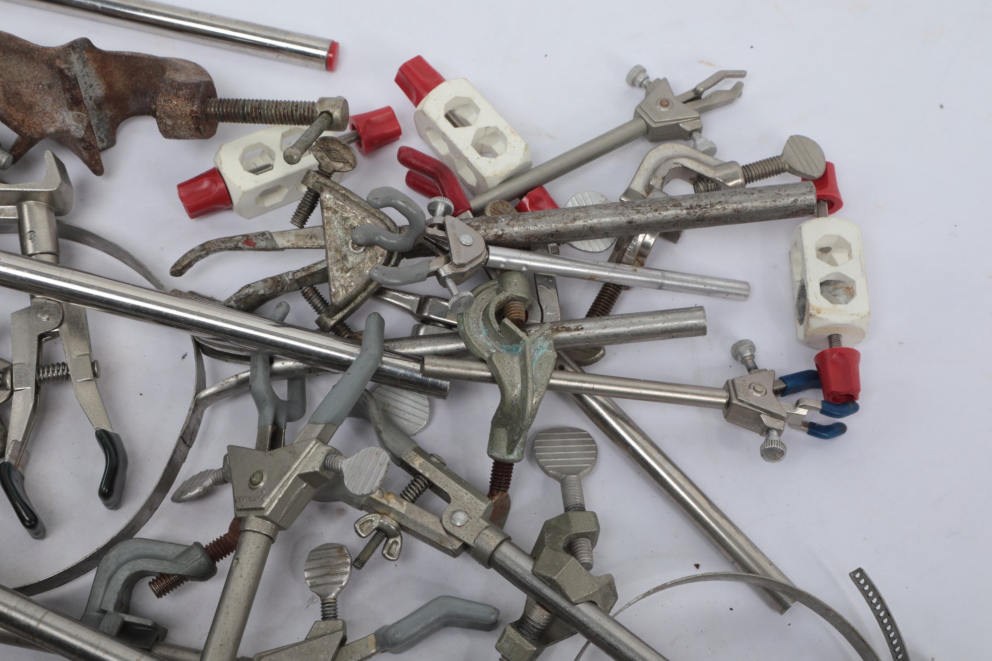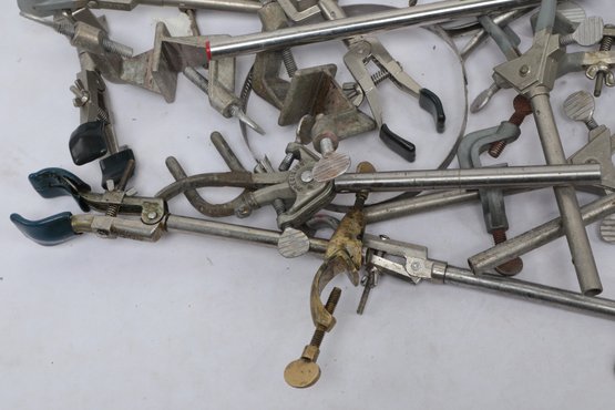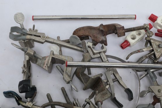 Lot Of Assorted Metal Laboratory Stands, Clamps And Supports. See pictures carefully for details on contents included with lot and condition.