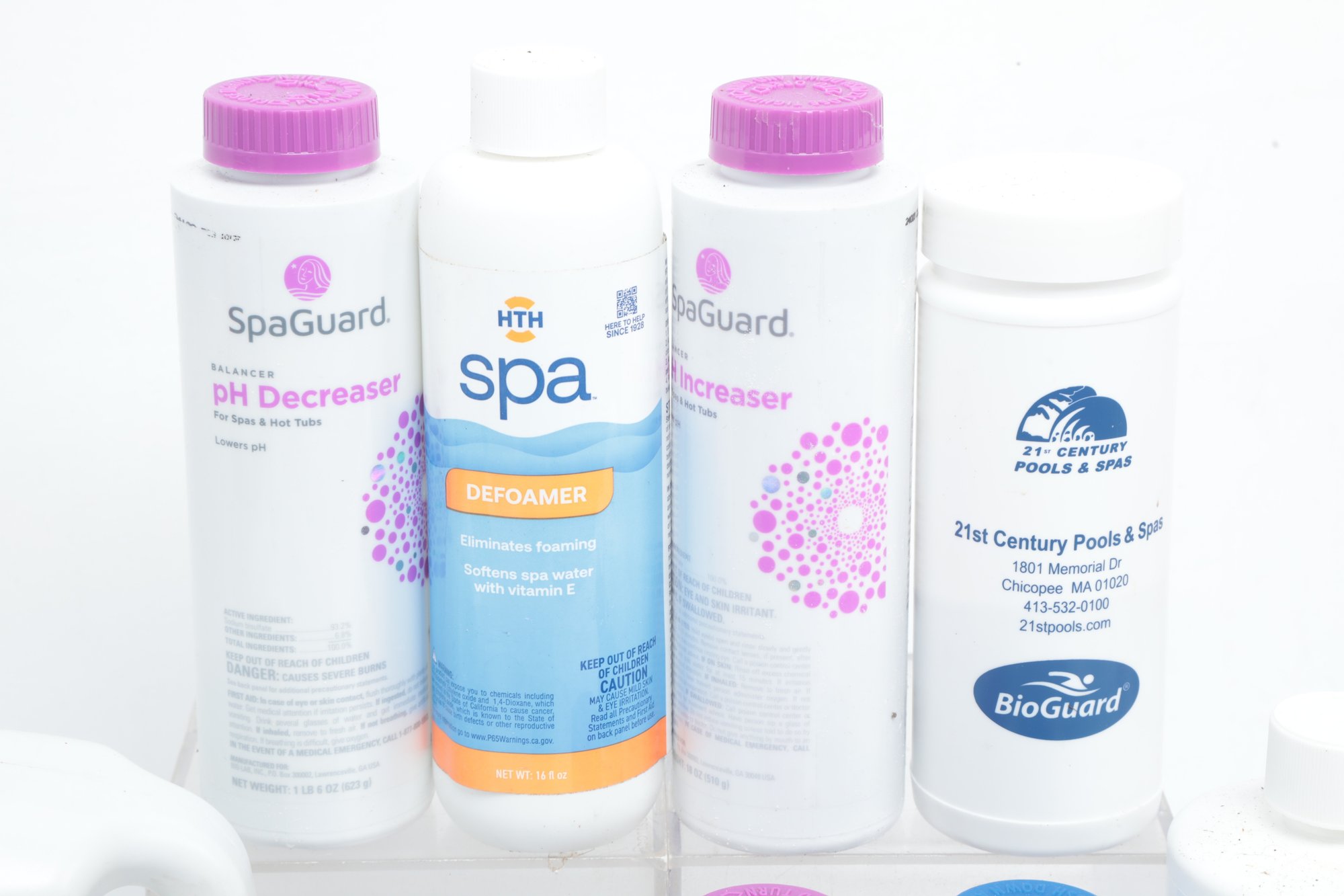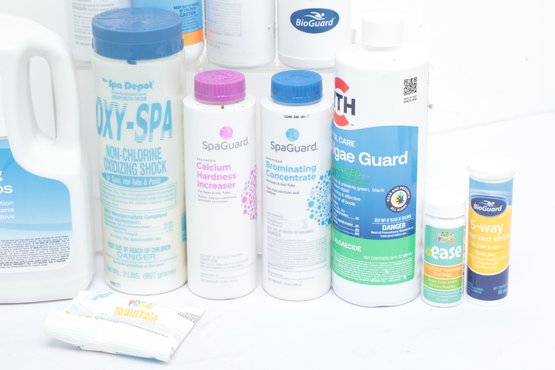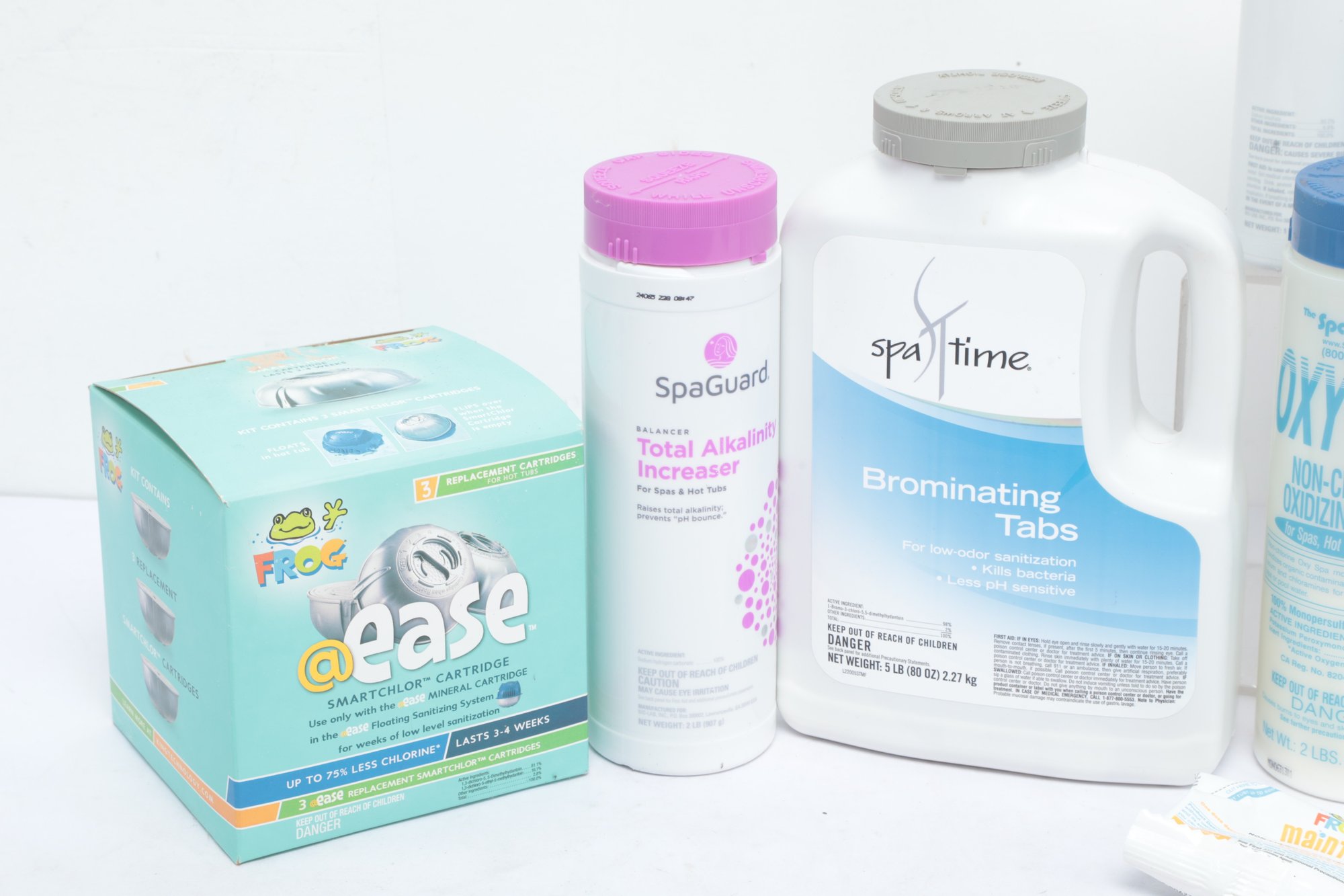 Lot Of Assorted Pool And Hot Tub Chemicals. See pictures carefully for details on contents included with lot and condition. Items sold as is.