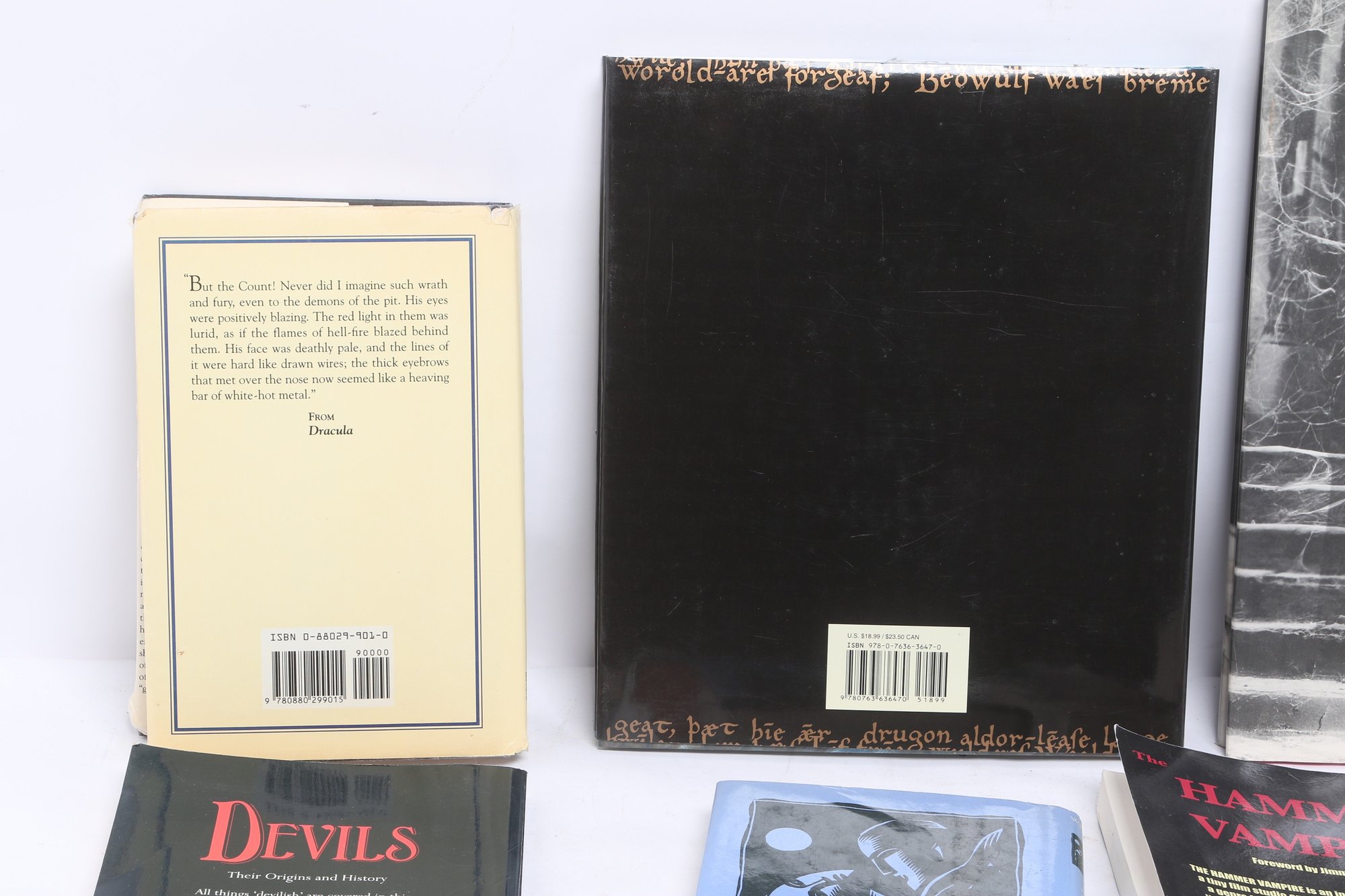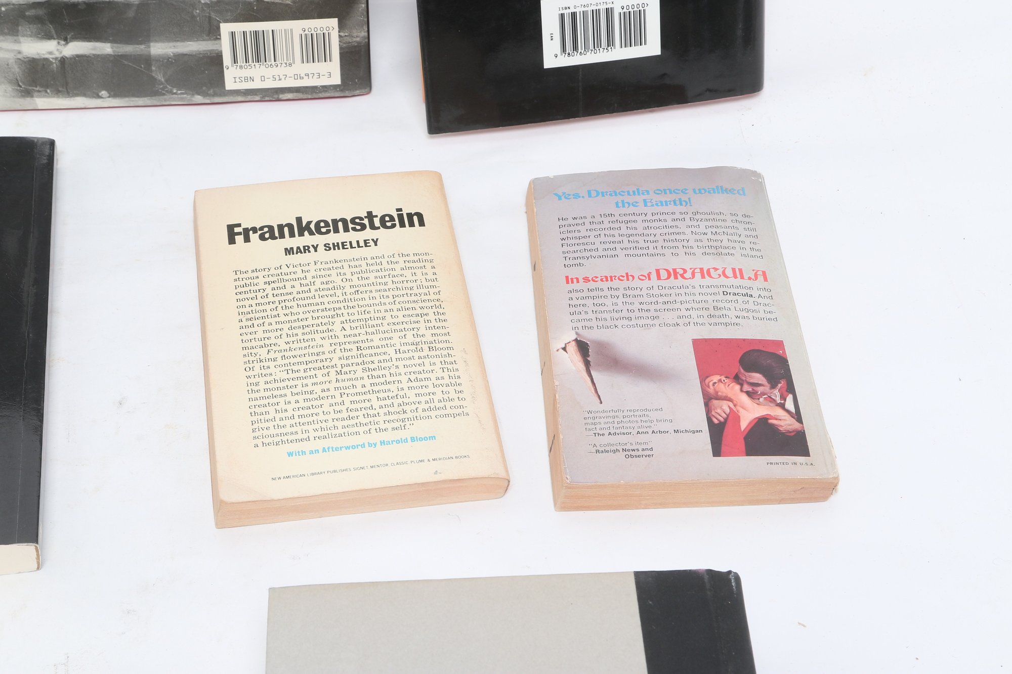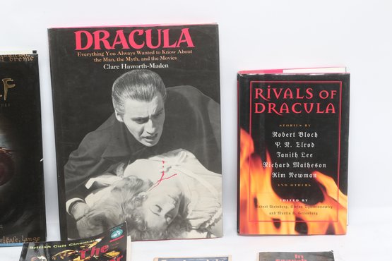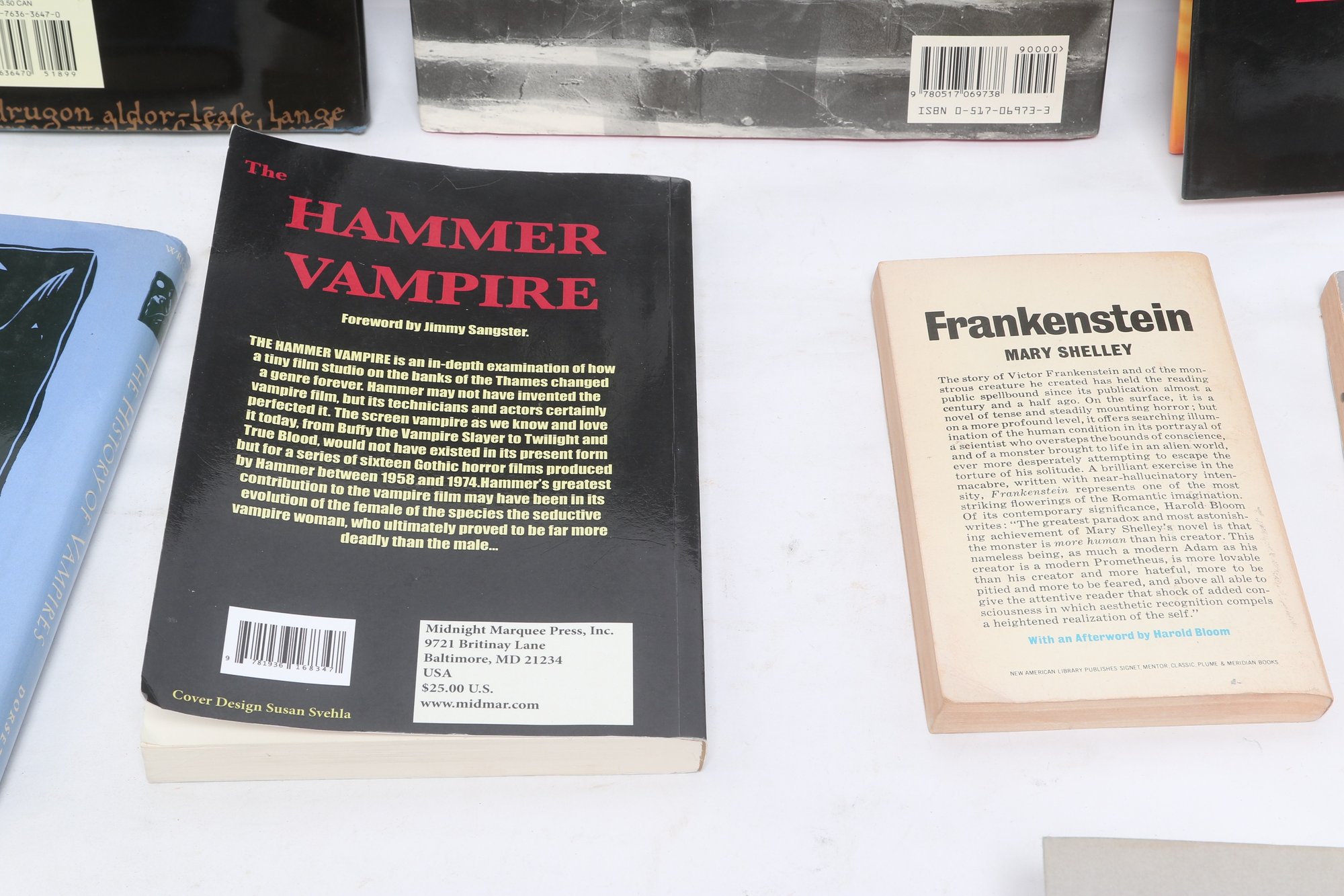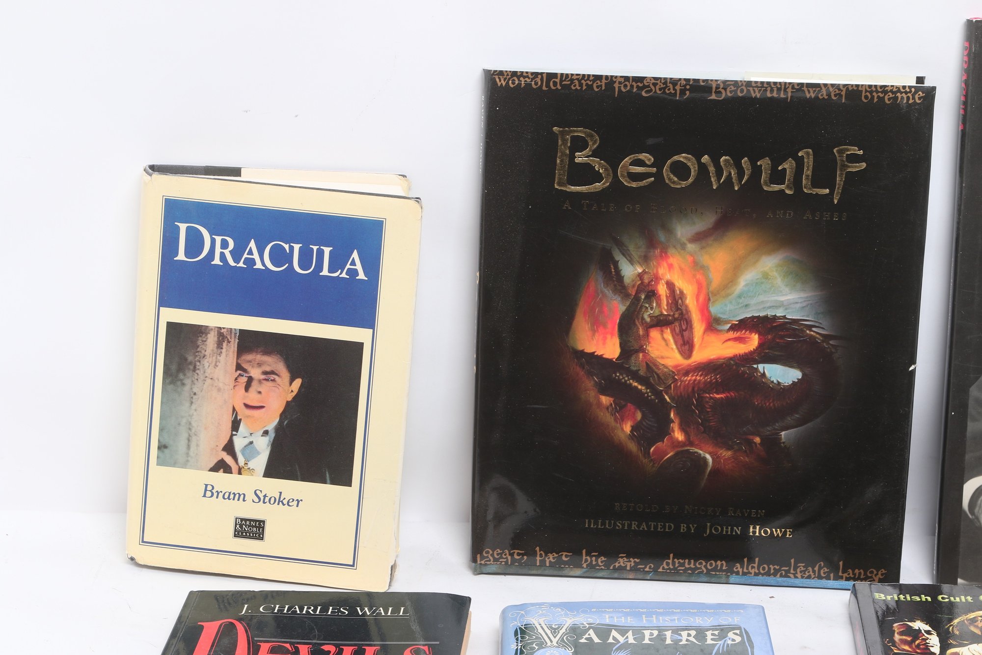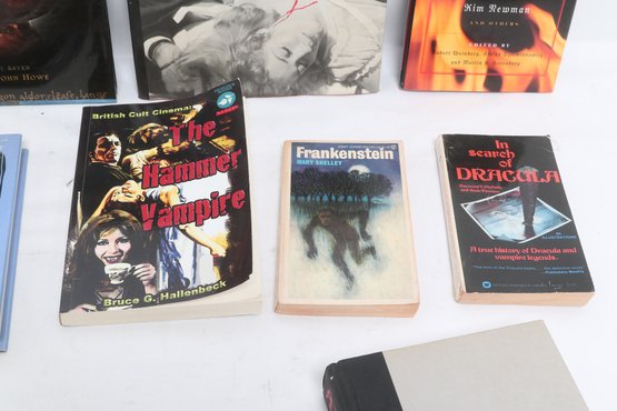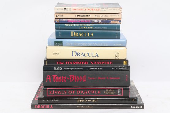 Mixed lot of horror and gothic literature books featuring titles related to Dracula, vampires, and Beowulf. Includes paperbacks and hardcovers with classic and modern editions. Books show typical pre-owned wear with some edge and cover wear; overall a solid reading or collector’s lot.