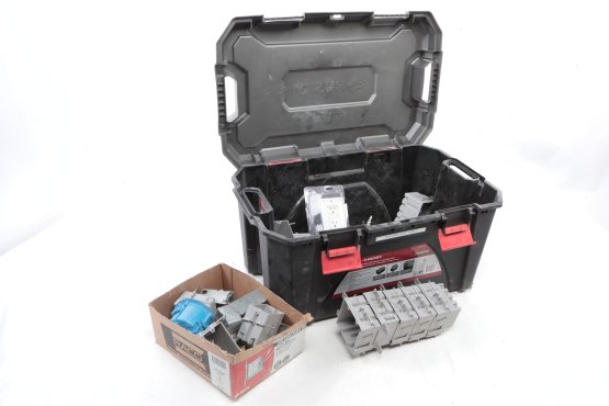 The electrical boxes are new. The Husky storage tote shows some wear consistent with use & storage.
