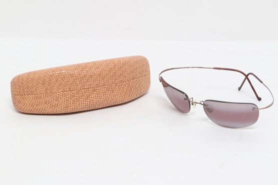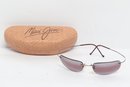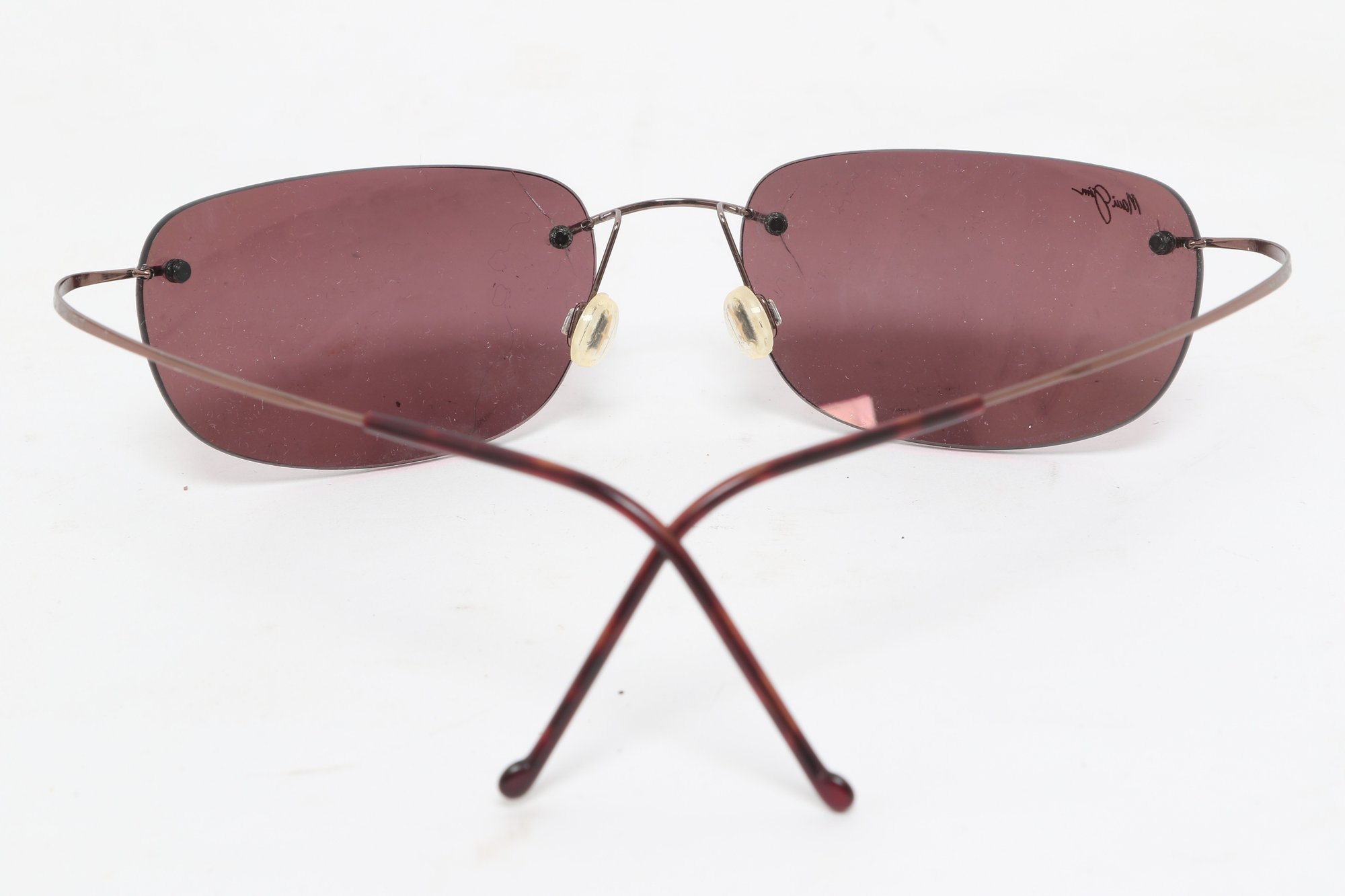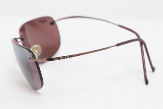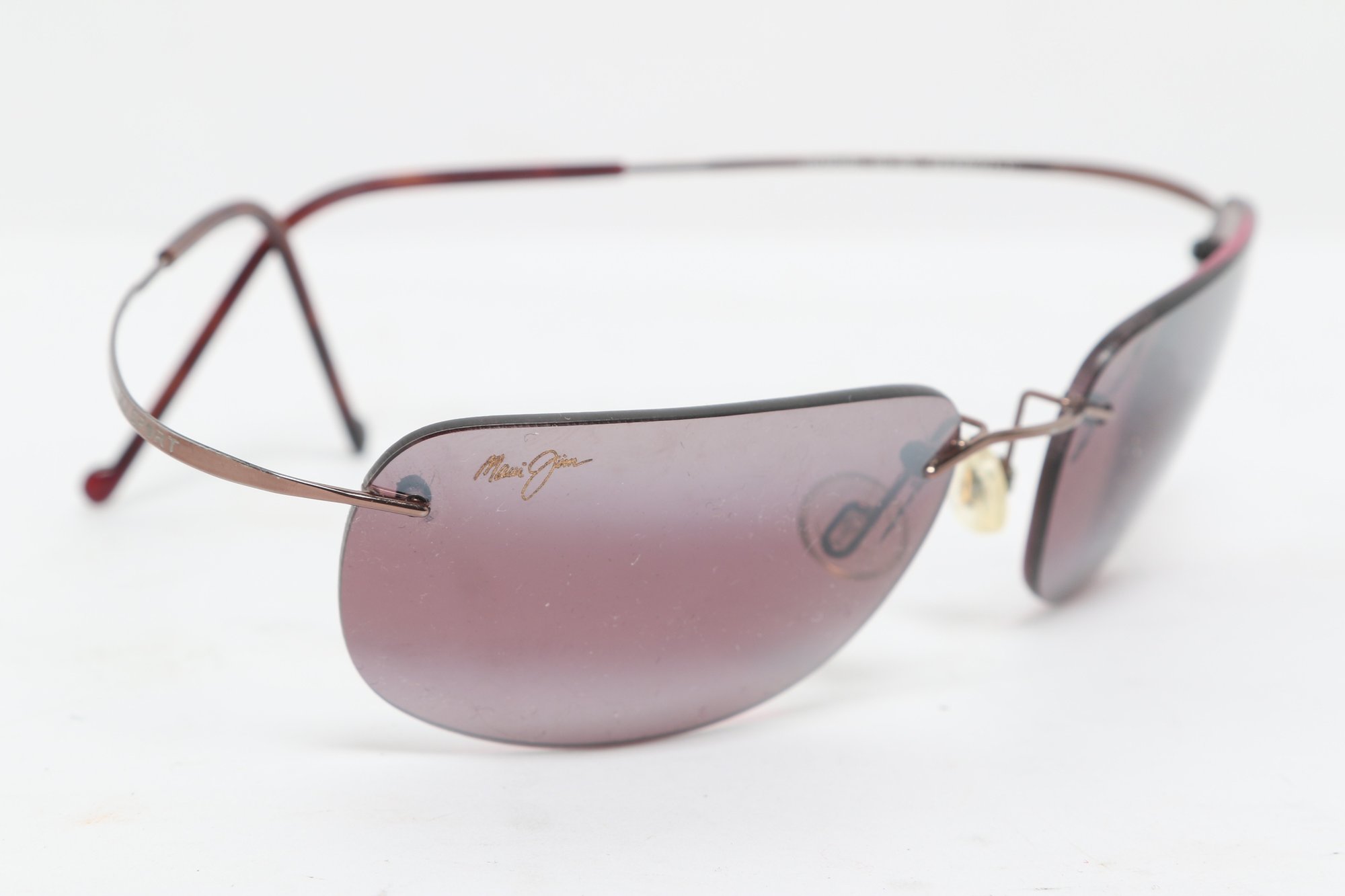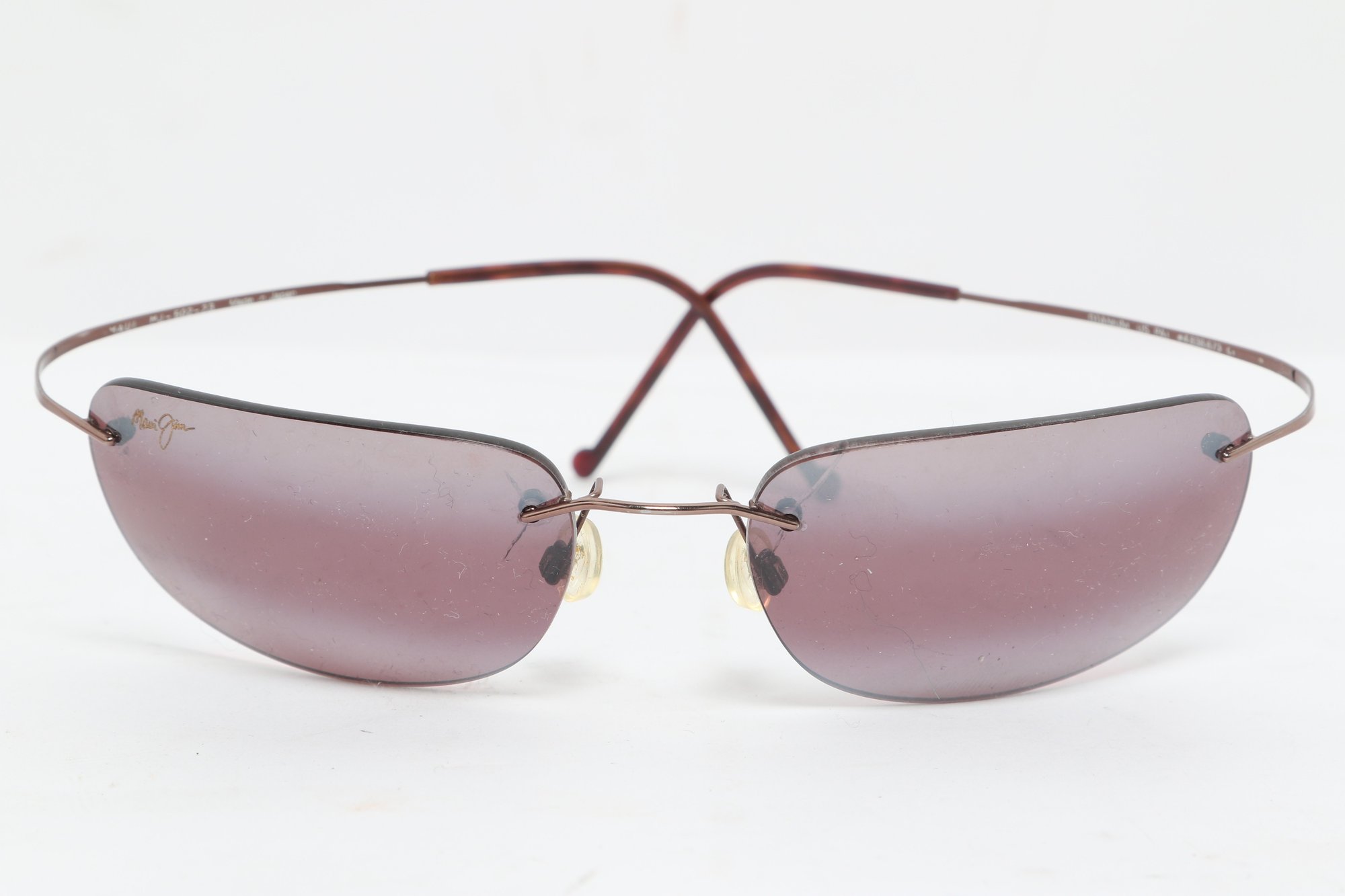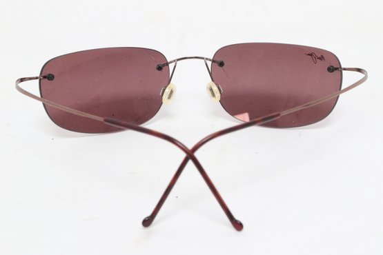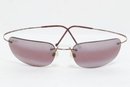 Maui Jim rimless sunglasses with lightweight titanium frames and pink-tinted lenses, includes original Maui Jim case. Lenses show damage and should be replaced; frames in good overall condition with light wear.