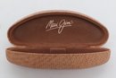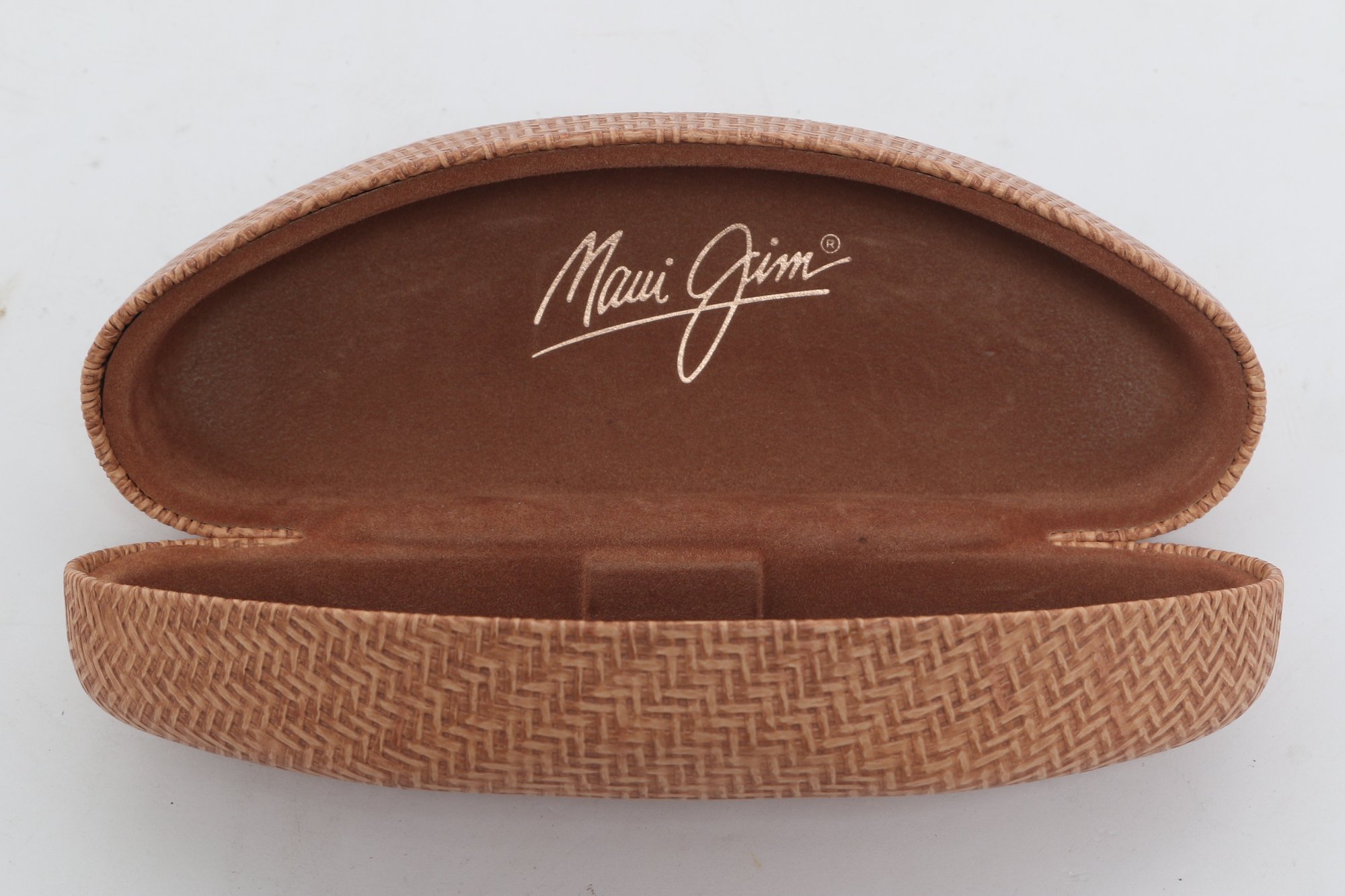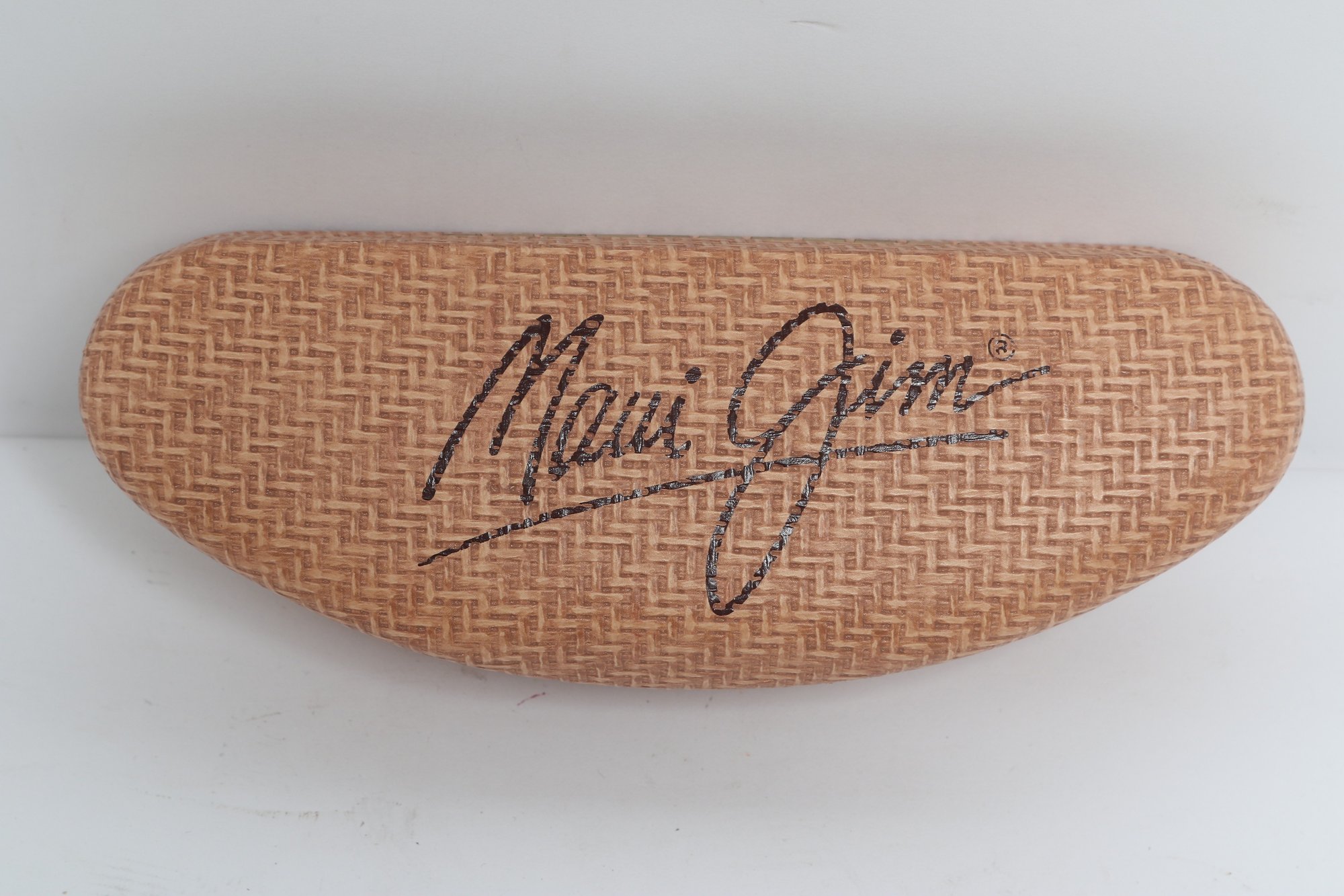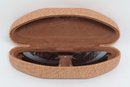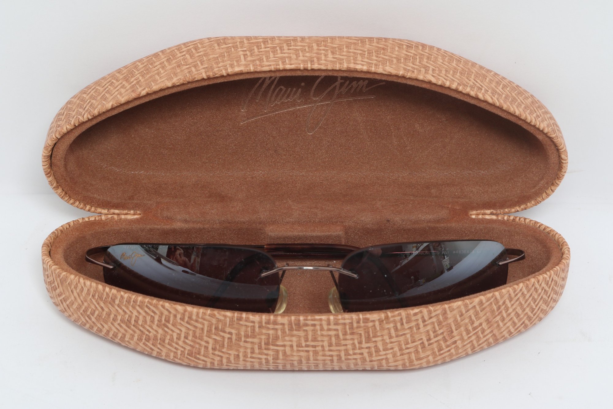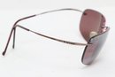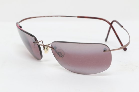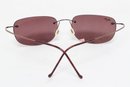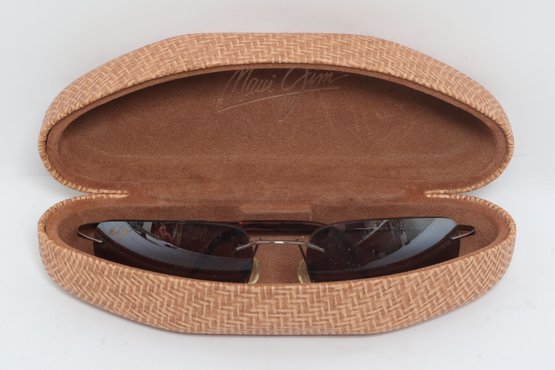 Maui Jim rimless sunglasses with lightweight titanium frames and pink-tinted lenses, includes original Maui Jim case. Lenses show damage and should be replaced; frames in good overall condition with light wear.