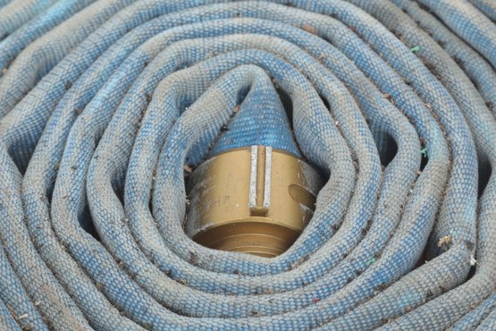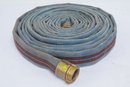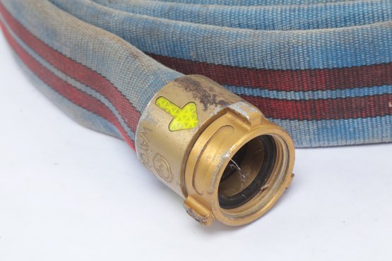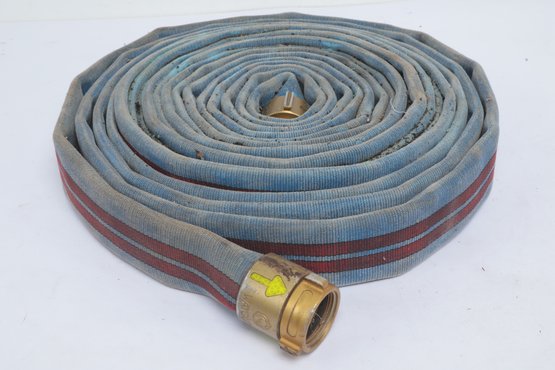 Mercedes Textiles Vintage Blue Fire Hose W/ Red Stripes. Hose is untested sold for collecting or display. See pictures carefully for details on size and condition.