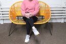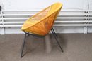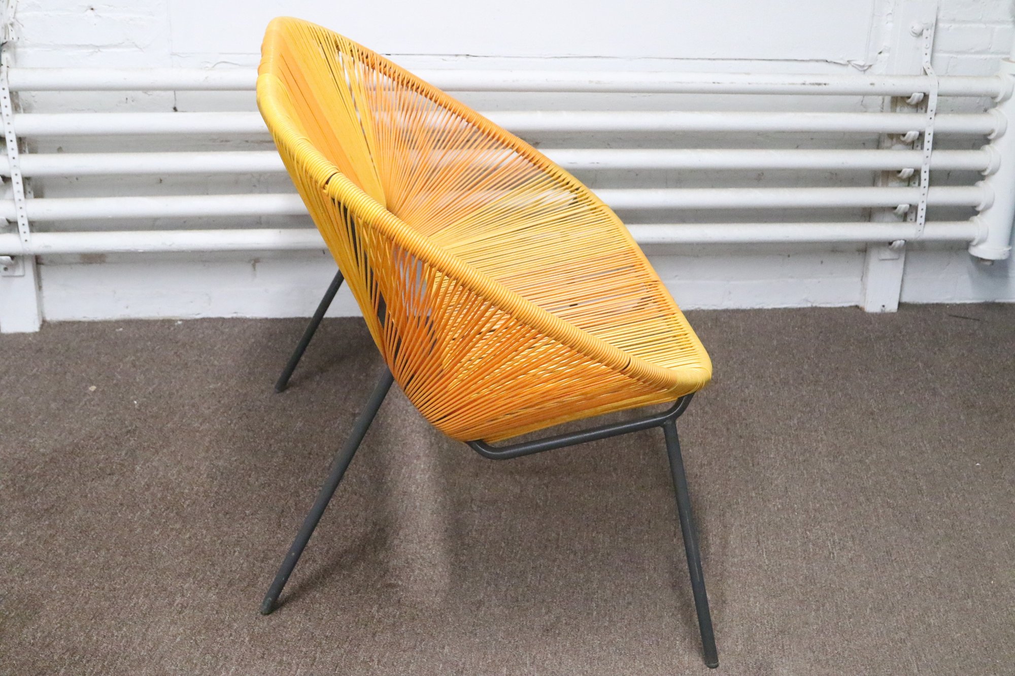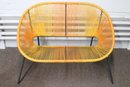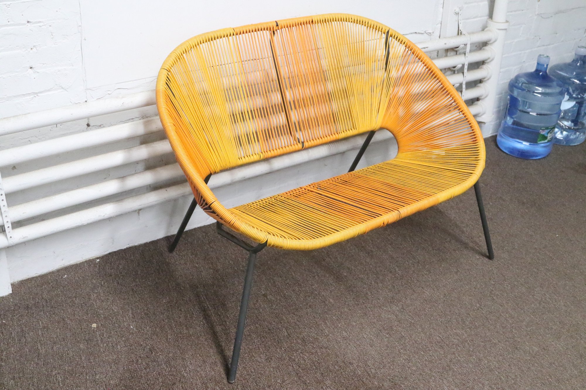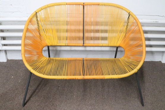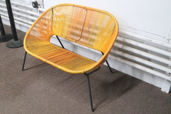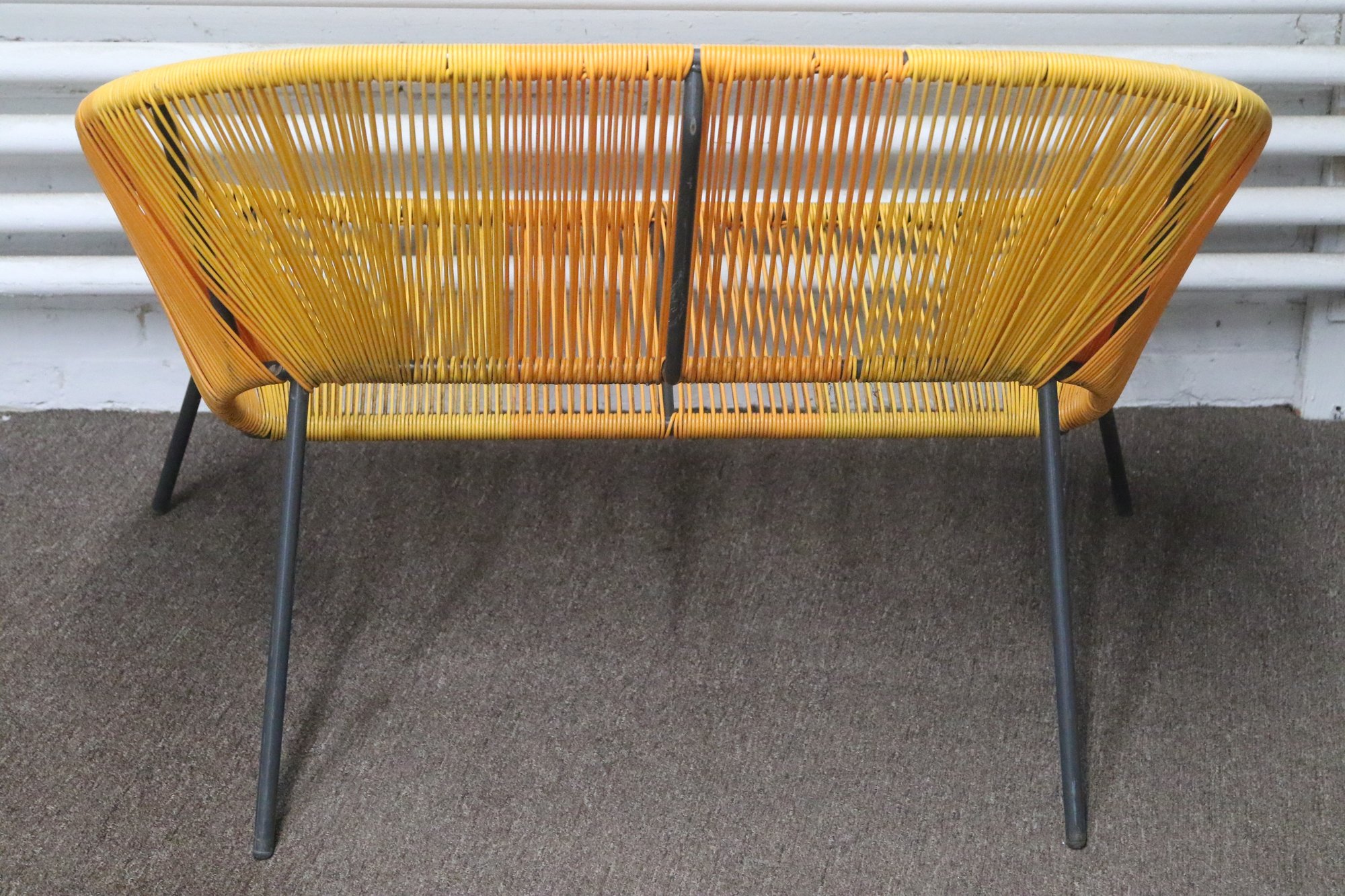Mid-century modern style woven bench or loveseat featuring a vibrant yellow cord seat with curved back and black metal hairpin legs. Lightweight yet sturdy design, ideal for indoor or patio seating. Pre-owned with light wear consistent with use, overall in good condition.
