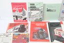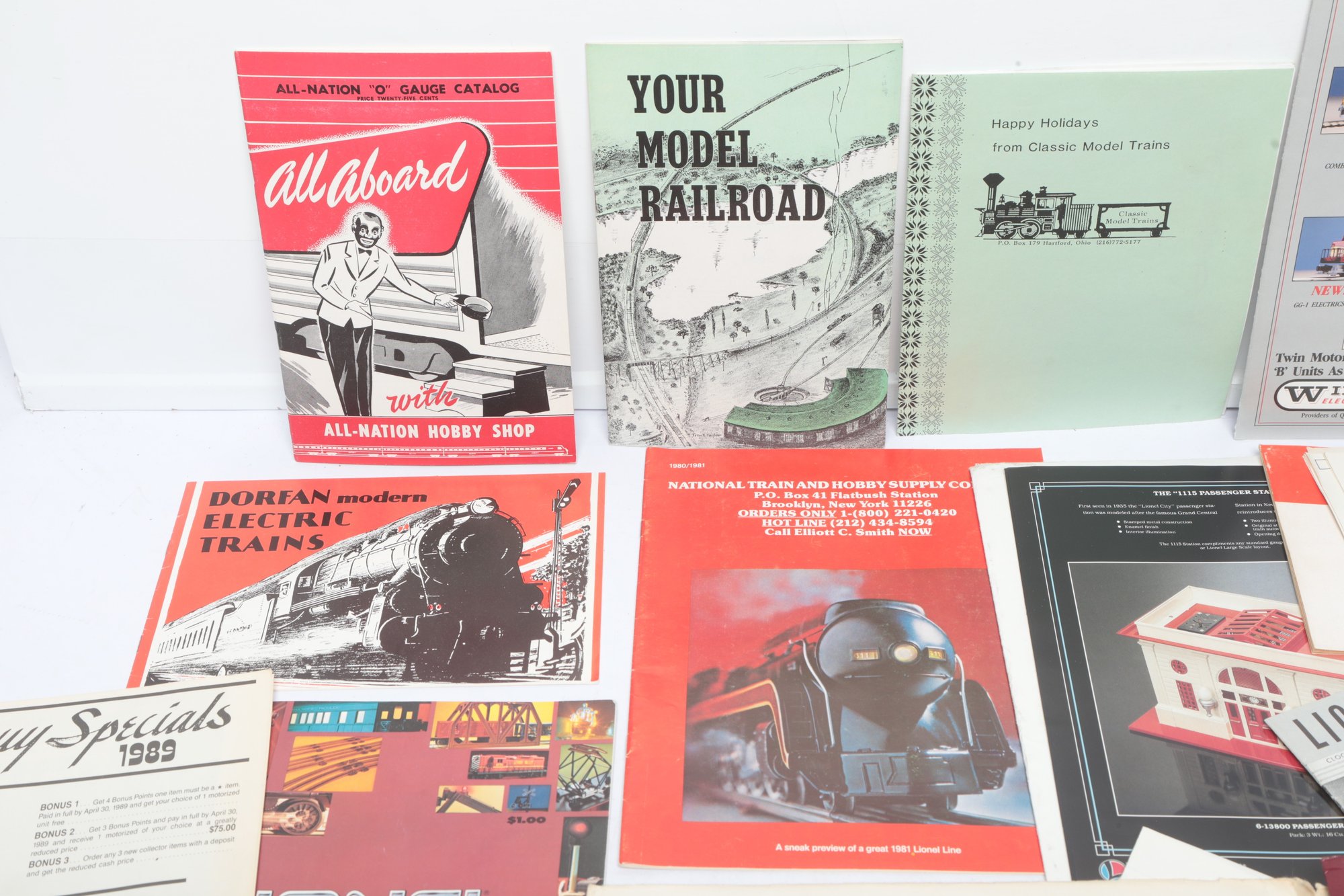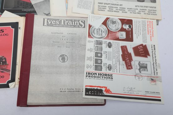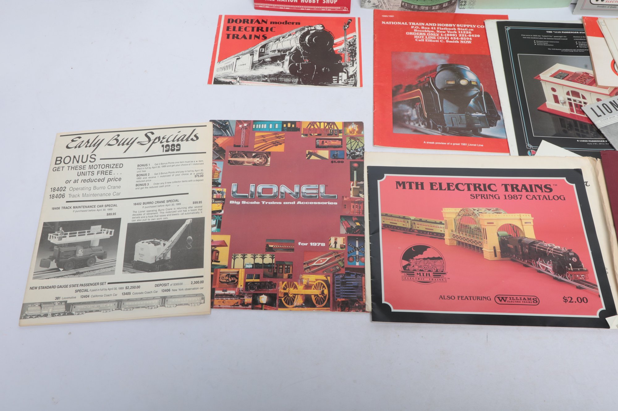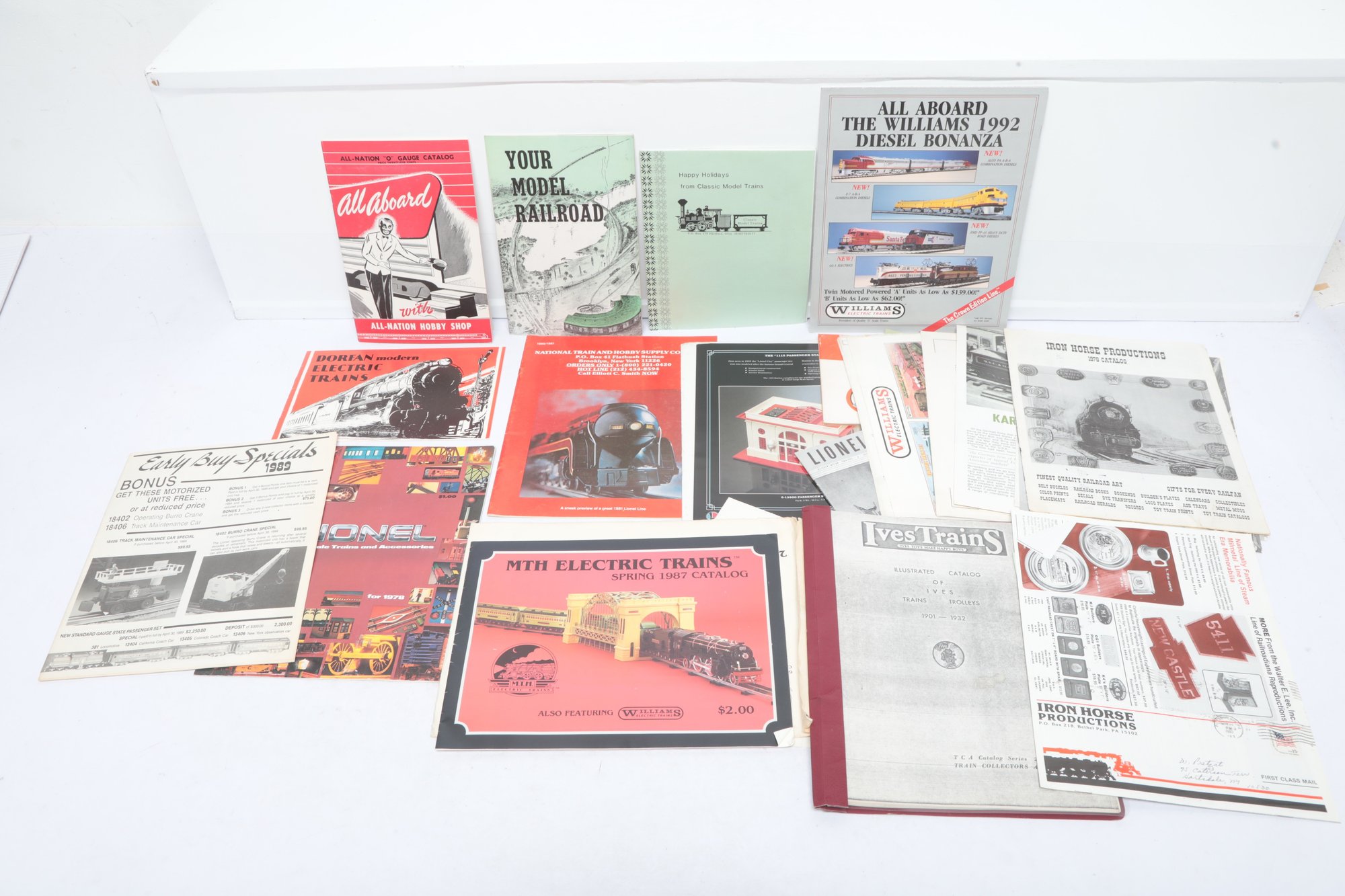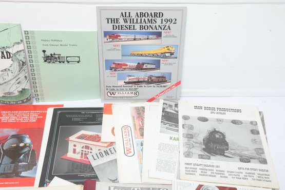 An extensive collection of vintage model train catalogs and hobbyist literature including the MTH Electric Trains Spring 1987 Catalog, Williams 1992 Diesel Bonanza, and Iron Horse Productions 1978 Catalog. The lot also features "All Aboard" by All-Nation Hobby Shop, various Lionel promotional materials from the late 1970s, and a reference guide for Ives Trains and Trolleys. Most items are in softcover booklet or pamphlet format with vibrant period graphics; overall condition appears well-preserved with some minor edge wear and light creasing to various covers.
