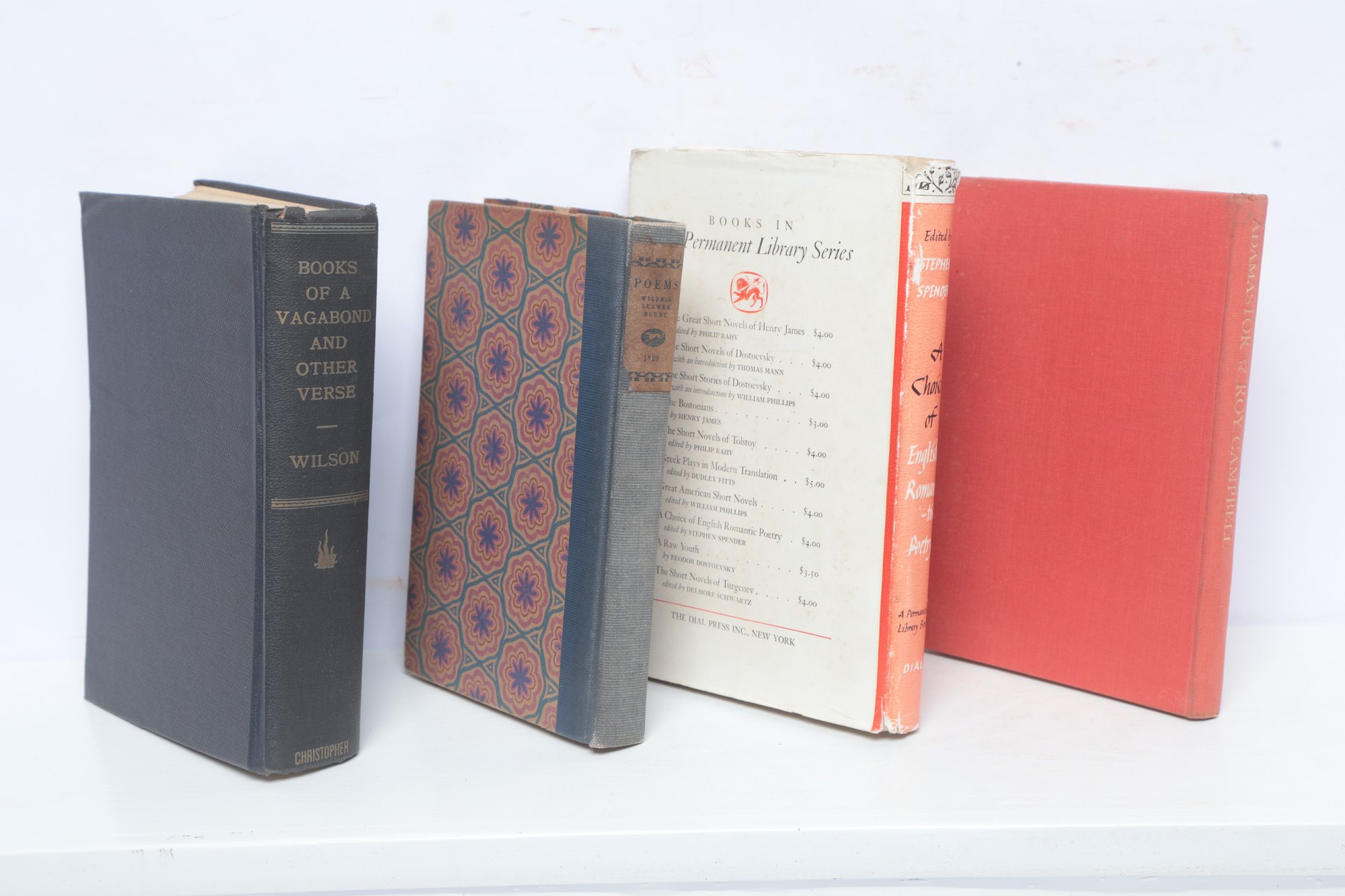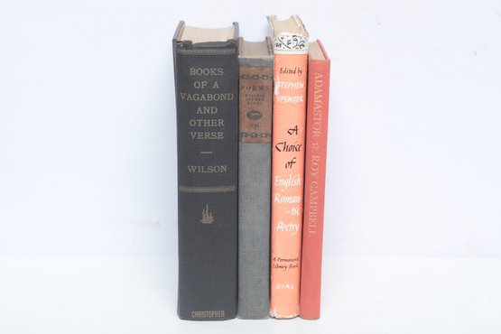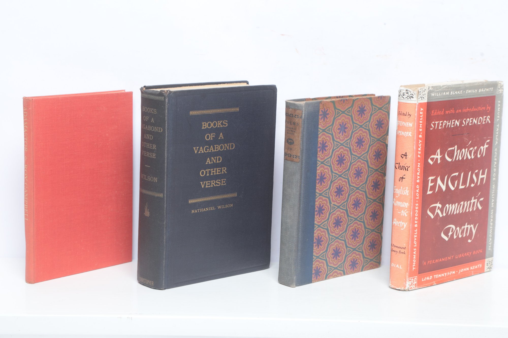 A collection of four vintage poetry volumes featuring works by Roy Campbell, Stephen Spender, and Wilfrid Scaven Blunt. Notable titles include "A Choice of English Romantic Poetry" and "Adamastor."