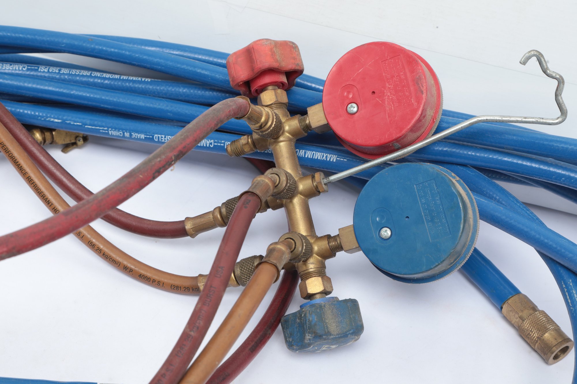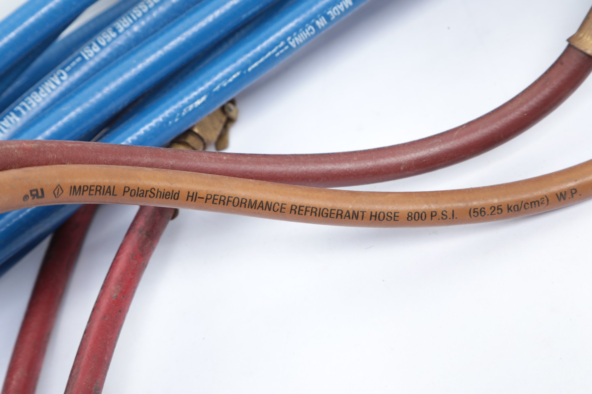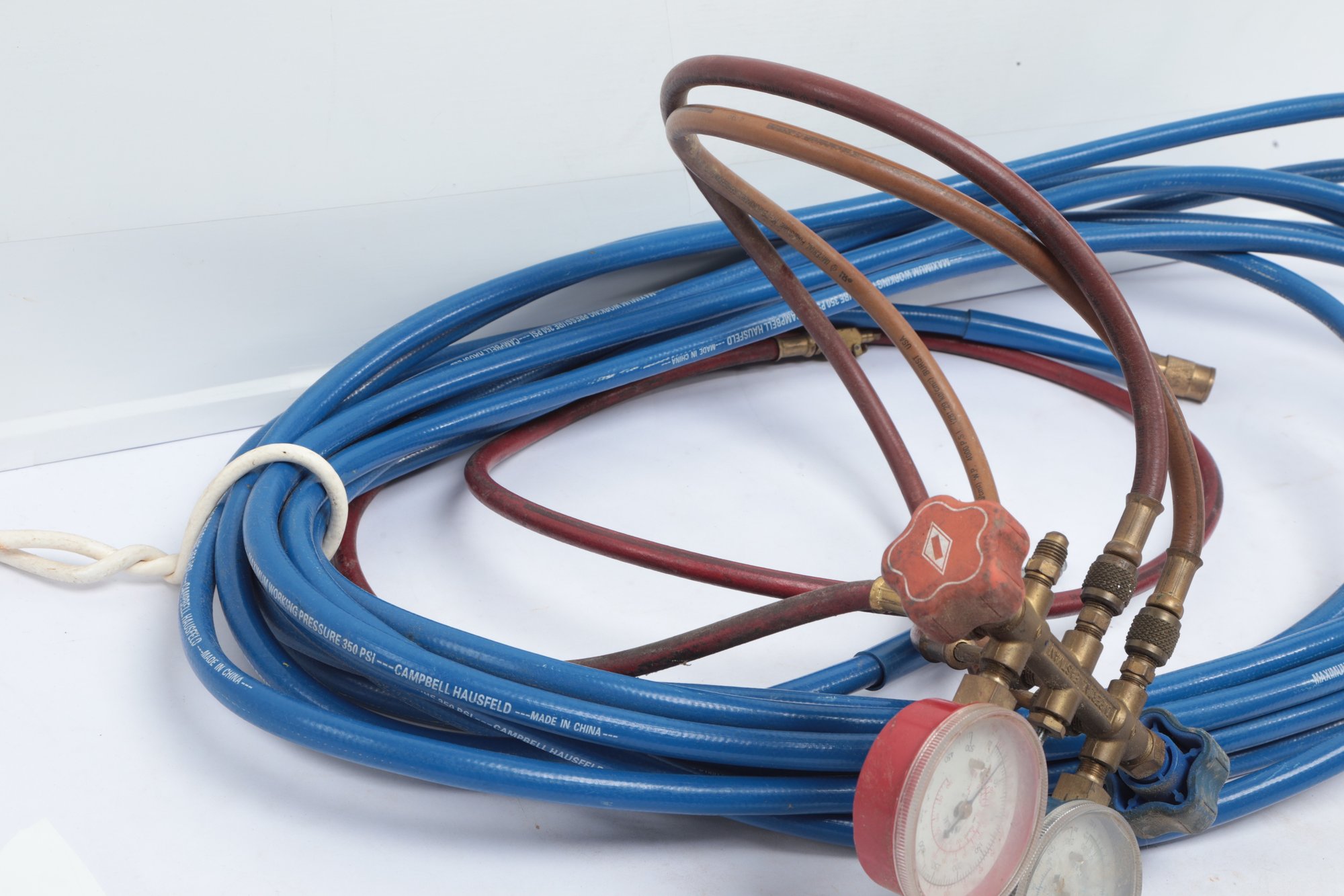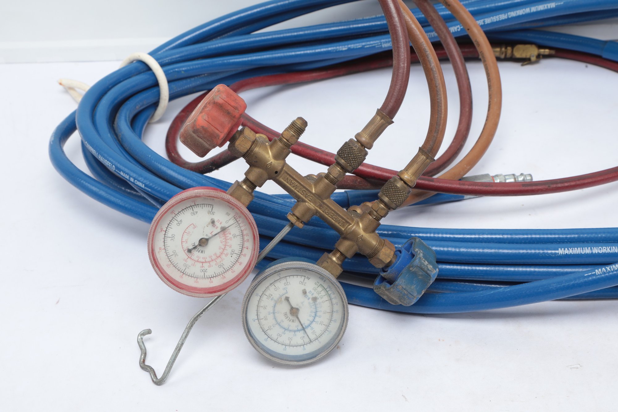 Imperial Manifold Gauges W/ 350 Psi Air Hose. See pictures carefully for details on condition and contents included.