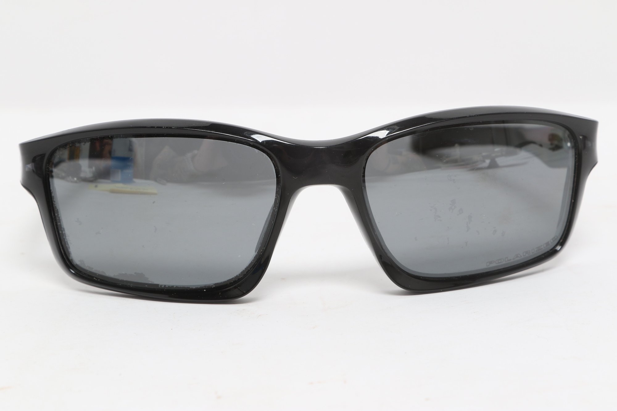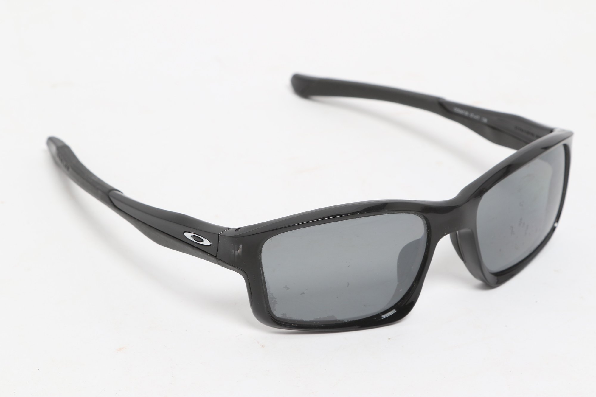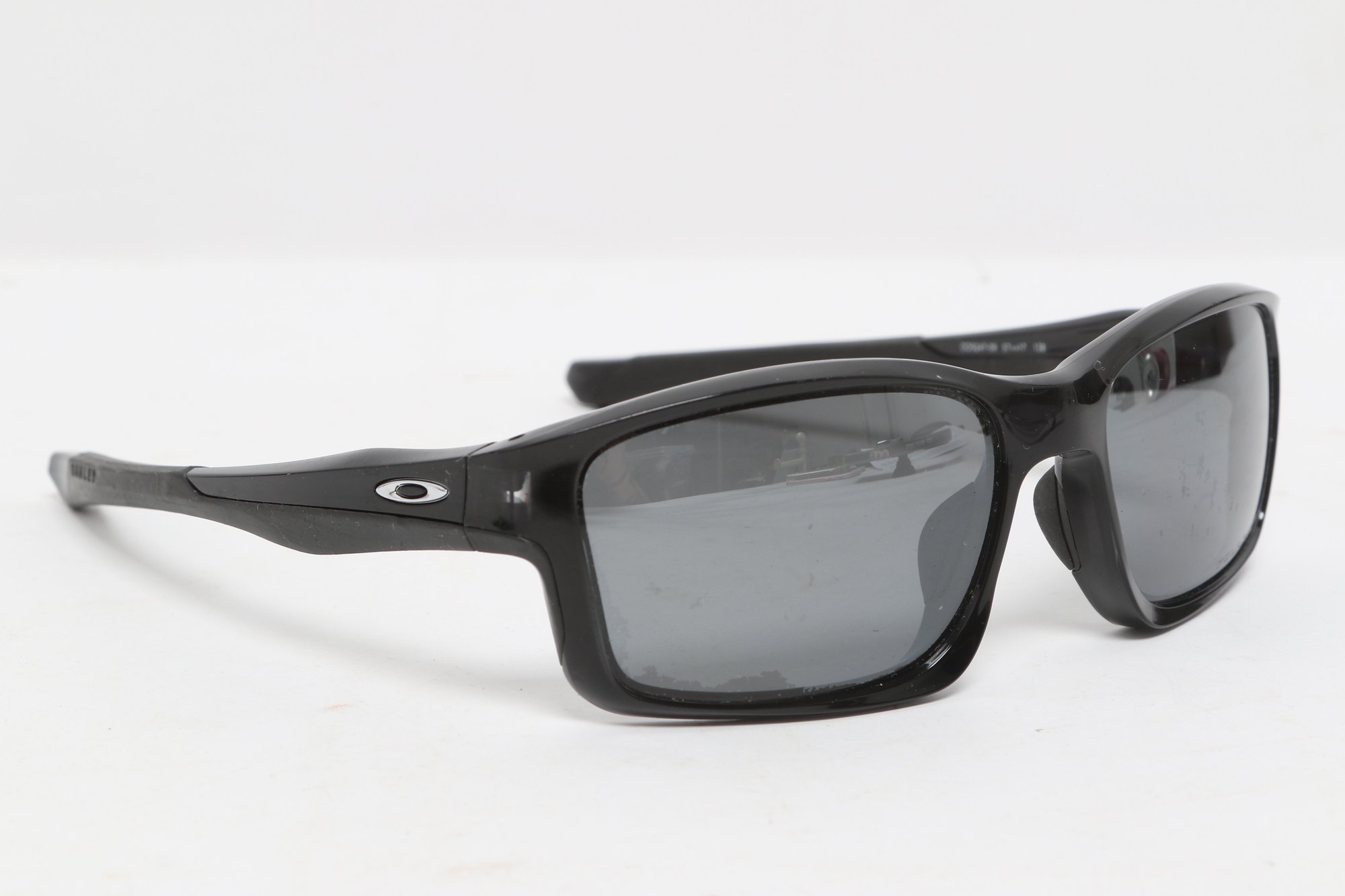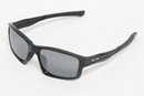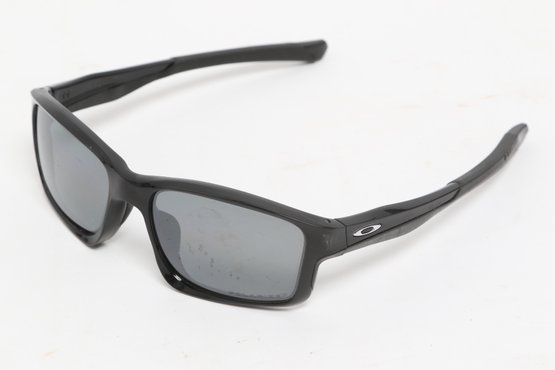 Oakley Chainline sunglasses featuring a black rectangular frame with gray lenses and Oakley “O” logos at the temples. Lightweight sport design with wrap-style fit. Condition consistent with use; light surface wear visible.