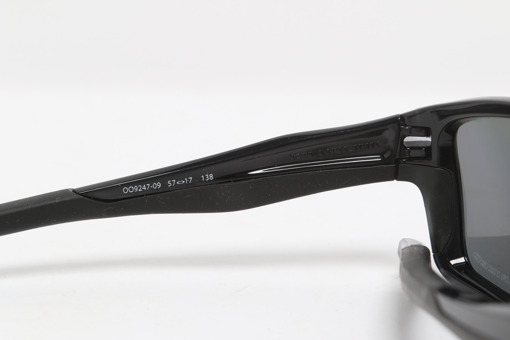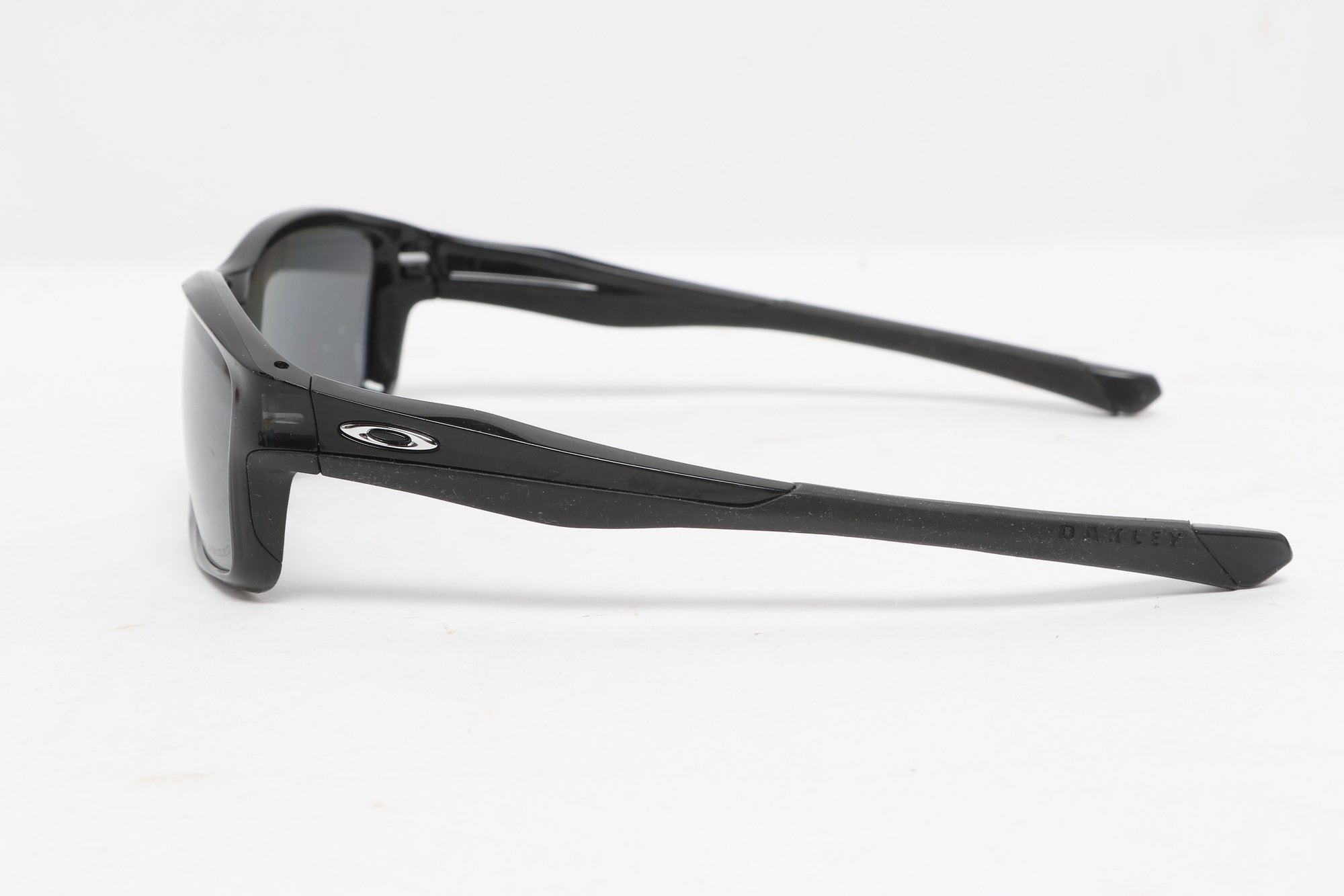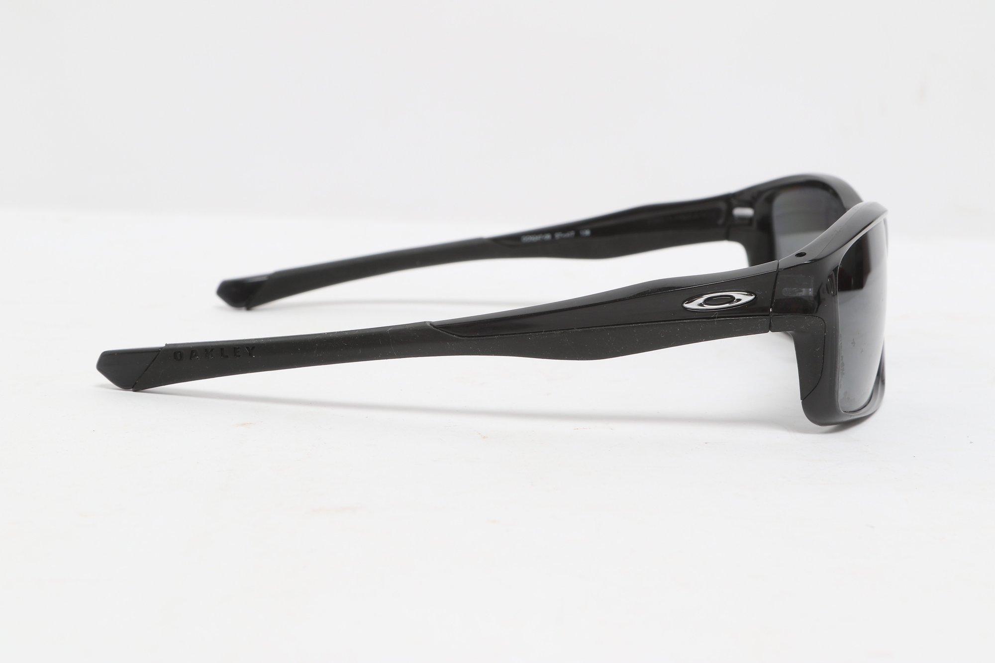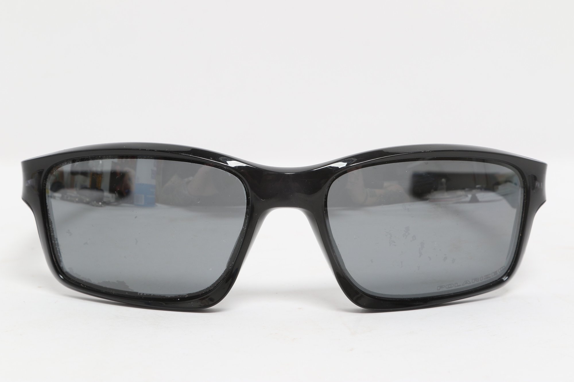Oakley Chainline sunglasses featuring a black rectangular frame with gray lenses and Oakley “O” logos at the temples. Lightweight sport design with wrap-style fit. Condition consistent with use; light surface wear visible.