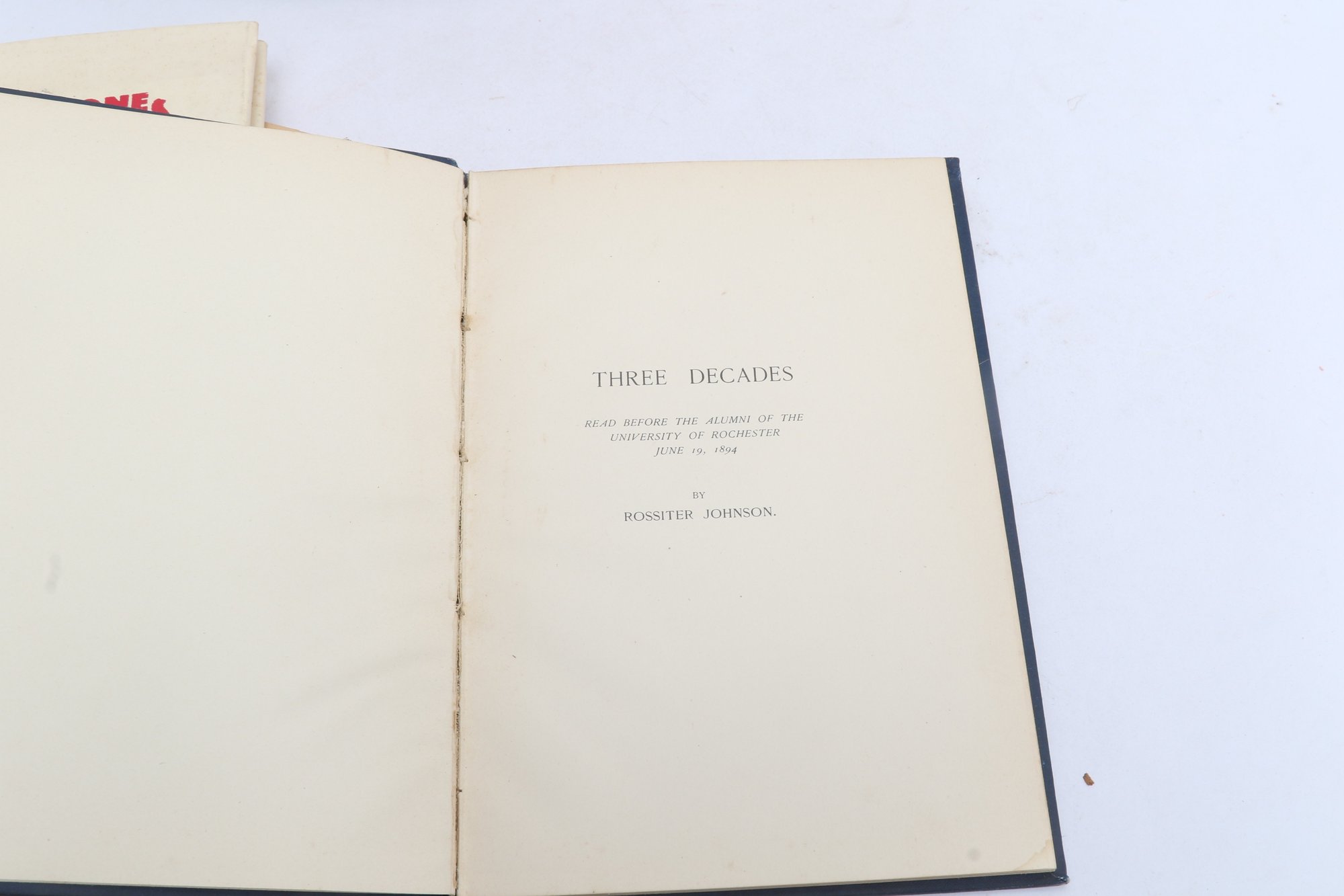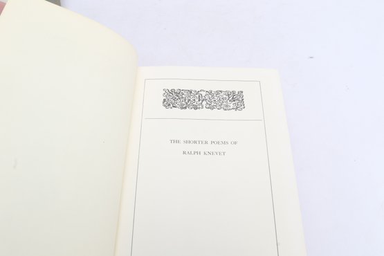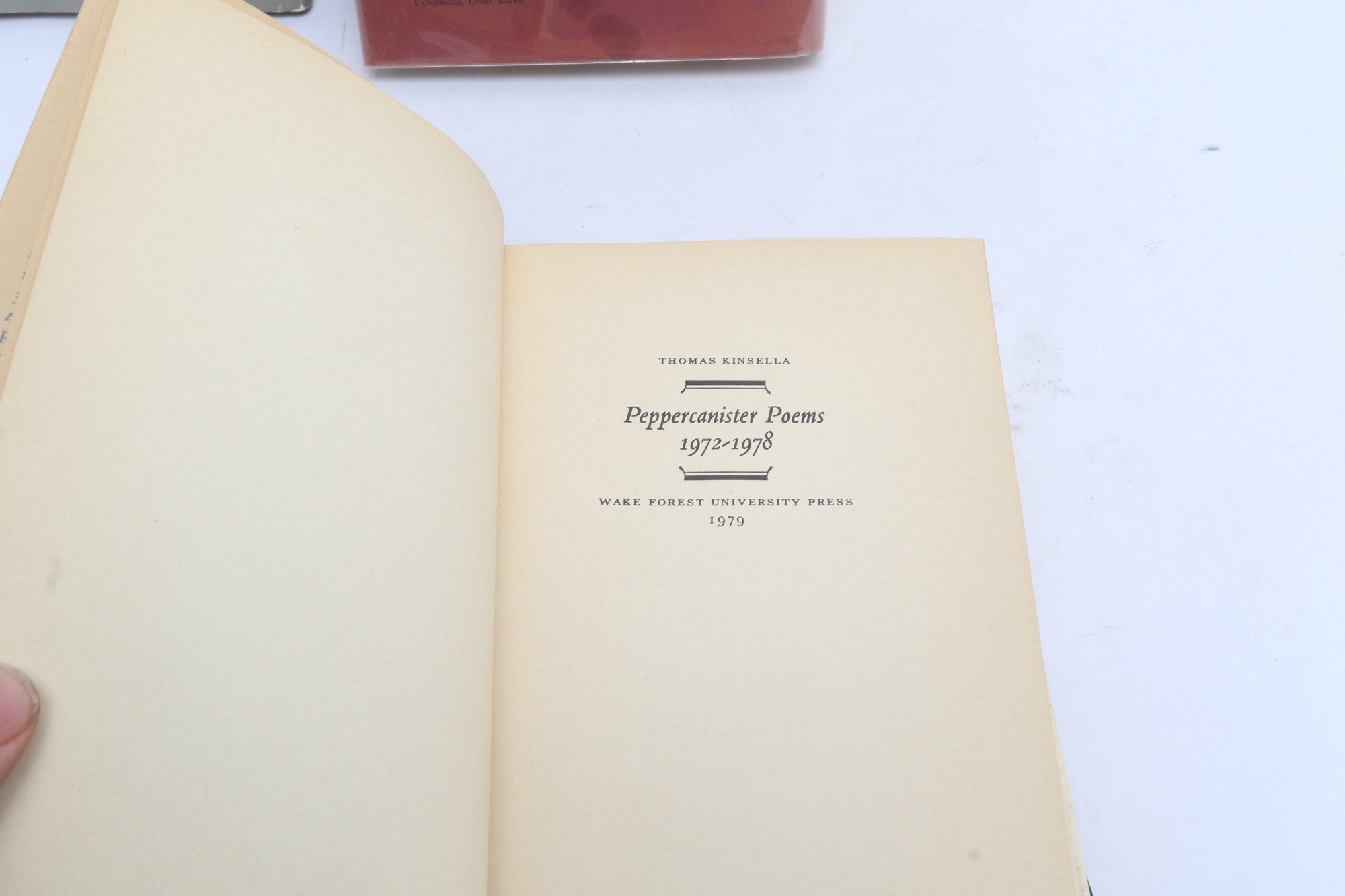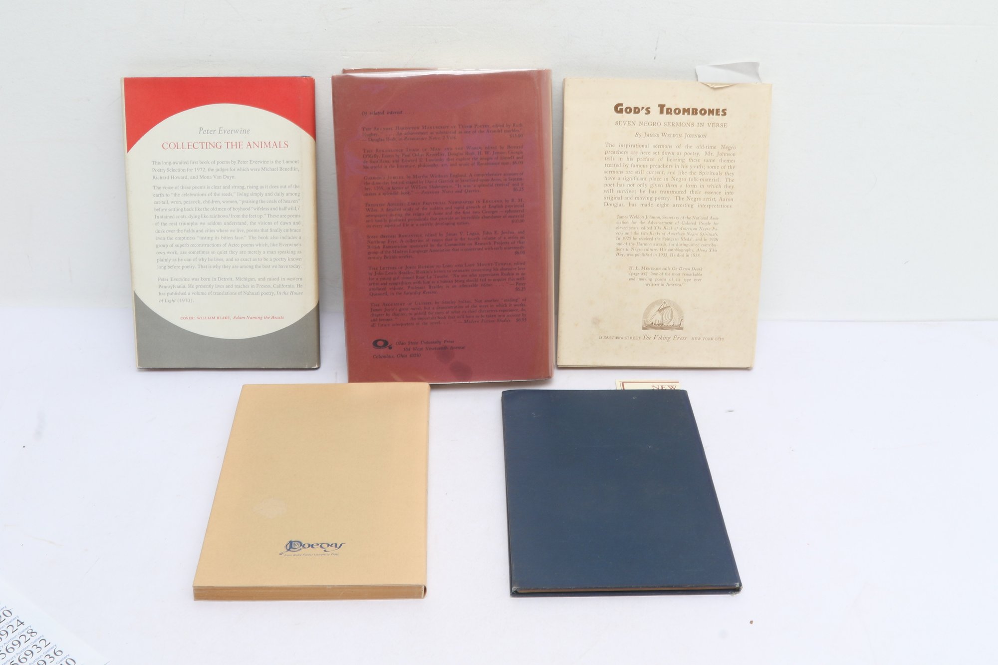 Five volumes spanning contemporary American and Irish poetry. Peter Everwine's "Collecting the Animals," Lamont Poetry Selection 1972, published by Atheneum, New York, 1973, in red dust jacket with animal imagery. Thomas Kinsella's "Peppercanister Poems 1972-1978" from Wake Forest University Press, 1979, in cream wrappers with presentation inscription "To Miss Clara M. Pike, with the author's kind regards." James Weldon Johnson's "God's Trombones: Seven Negro Sermons in Verse" featuring modernist cover design. Randall Jarrell's "Three Decades" in navy boards. "The Shorter Poems of Ralph Knevet: A Critical Edition" by Amy M. Charles, published by Ohio State University Press, in coral wrappers. Collection represents significant voices in mid-to-late 20th century poetry.