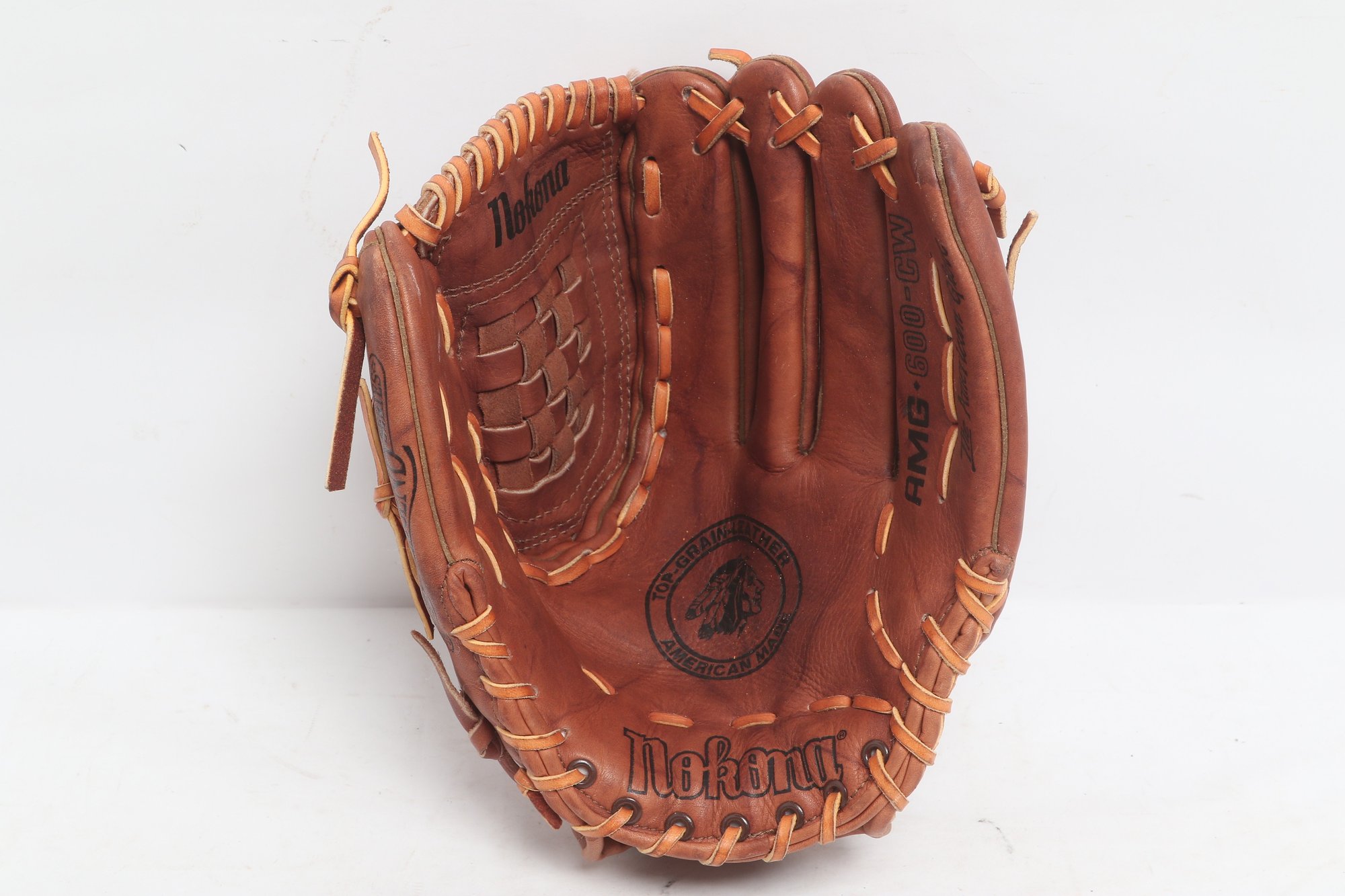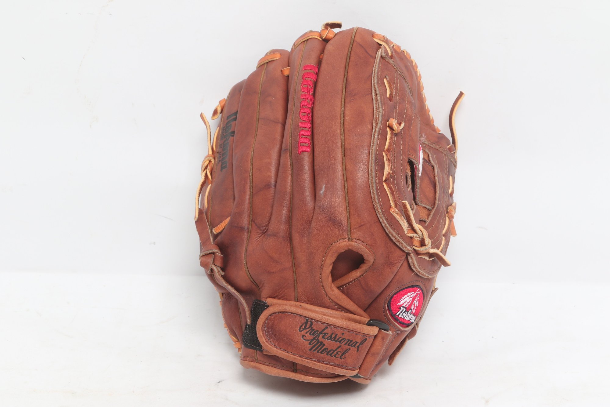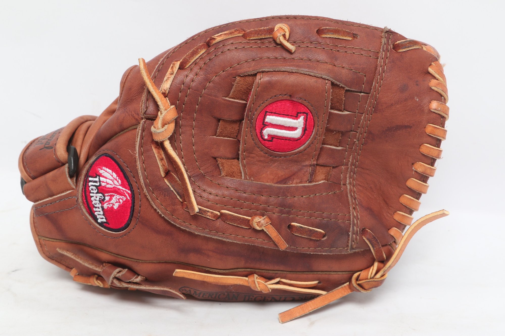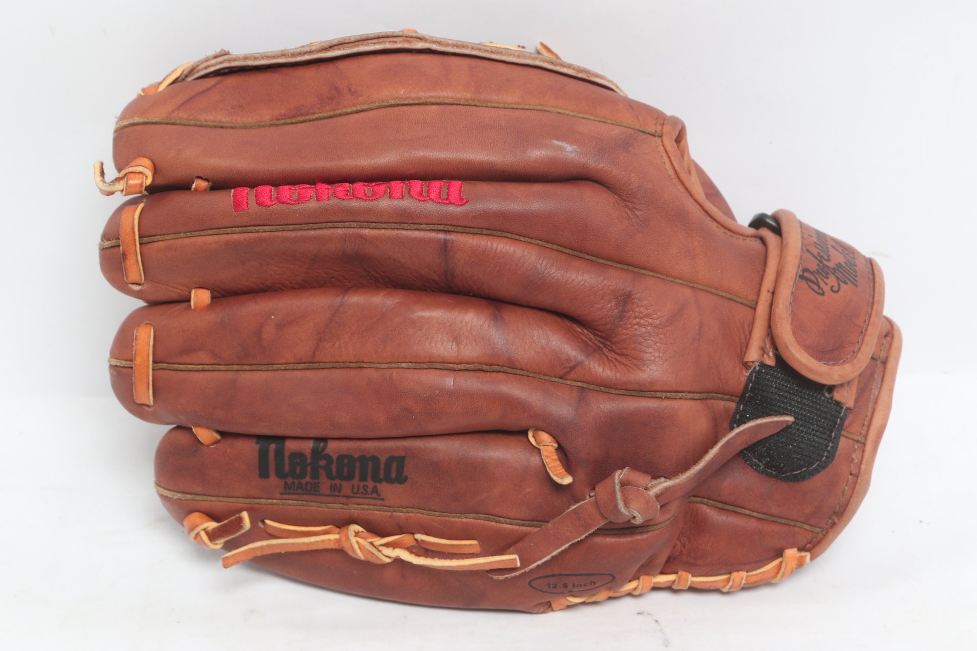 Nokona American Legend Series baseball glove, 12.5 inches, crafted in the USA from premium leather. Features “Professional Model” marking with classic brown leather, durable lacing, and deep pocket design. Shows light to moderate use with attractive patina, remaining in solid playing condition.