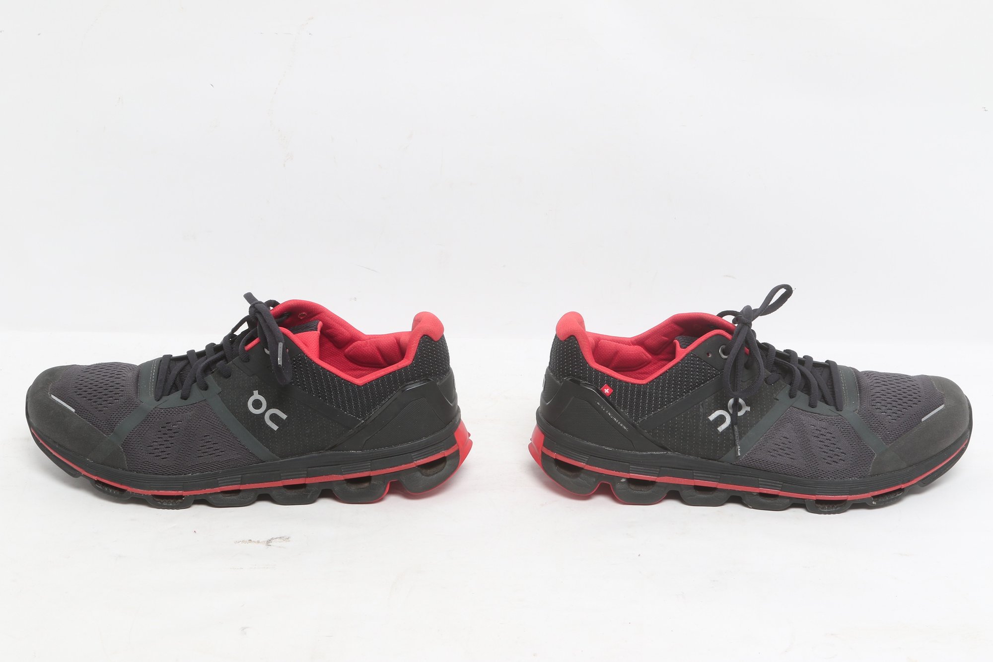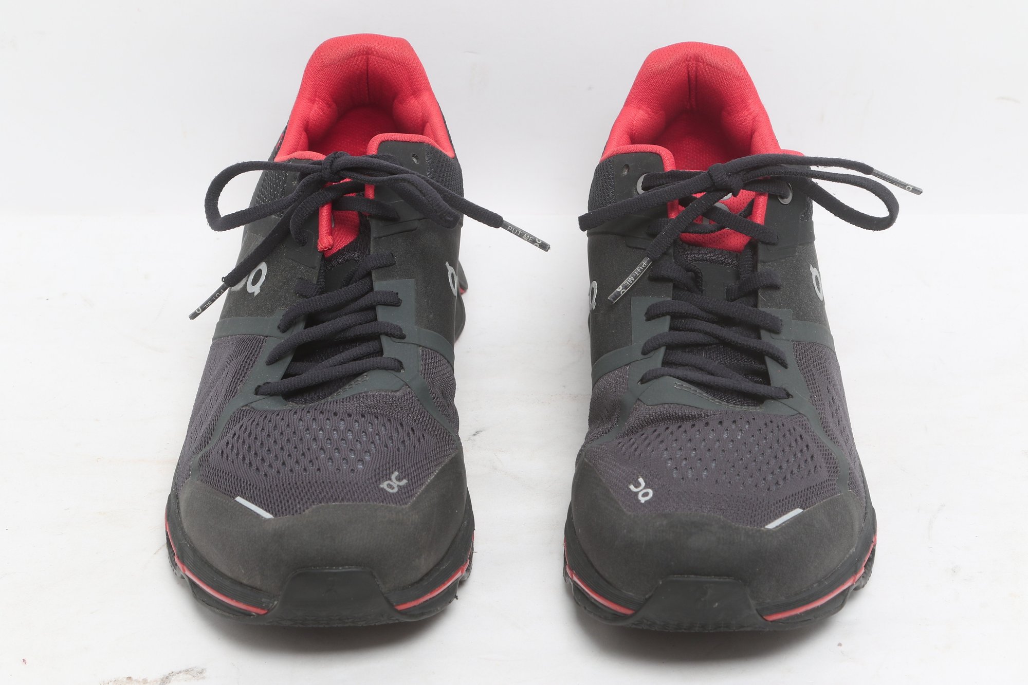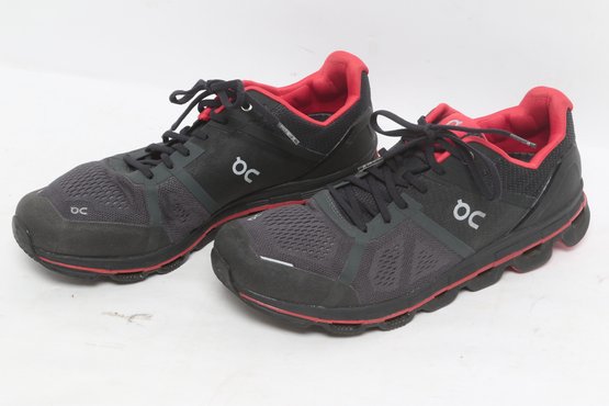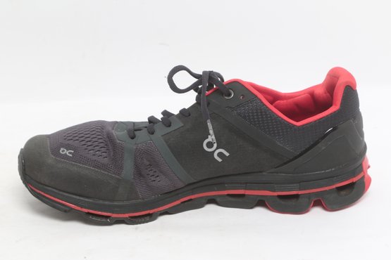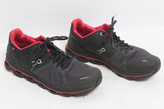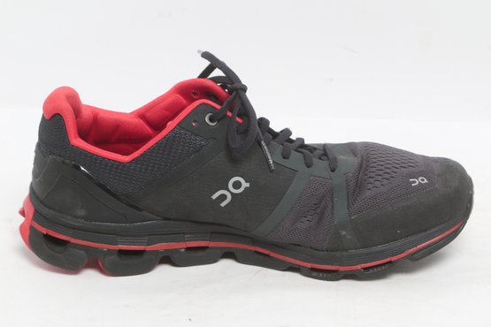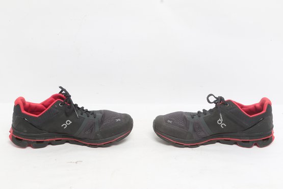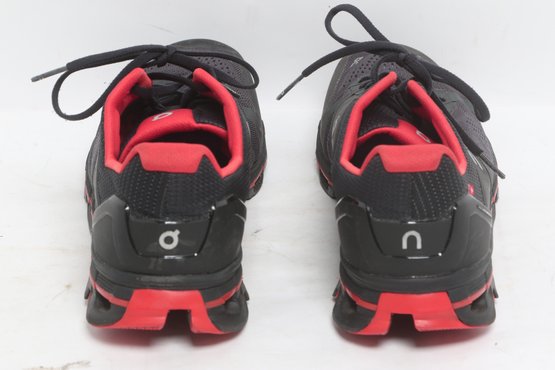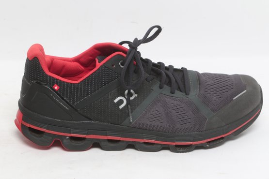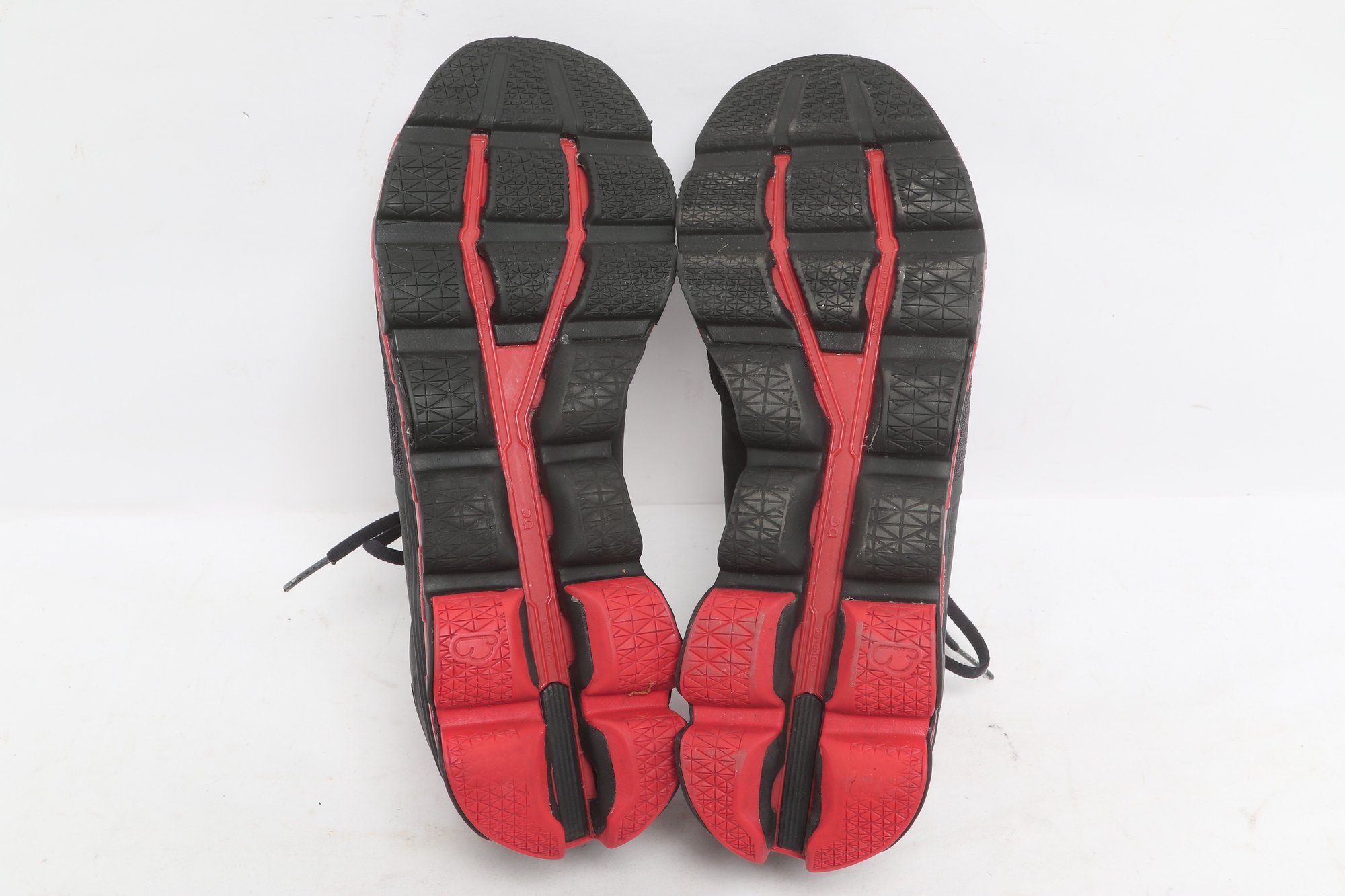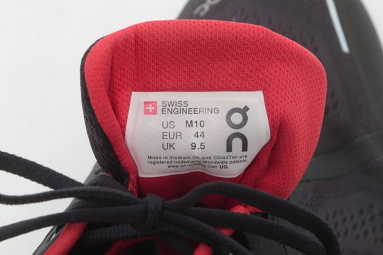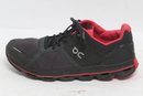 On Running Cloud men’s athletic sneakers in black with red accents, size US 10. Designed for comfort and performance with lightweight construction and cushioned sole. Ideal for running or everyday wear. Pre-owned with light wear, overall in good condition.