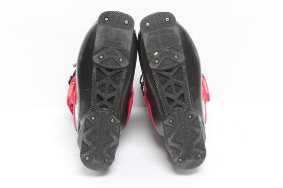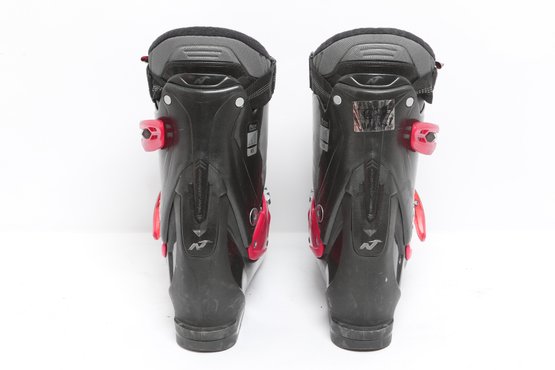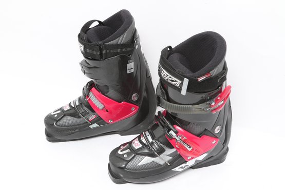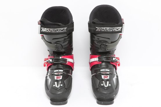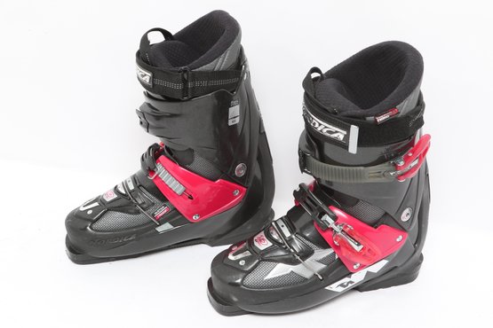 Nordica Sportmachine alpine ski boots in black and red with adjustable buckle closures and secure strap. Durable hard shell design for downhill performance; pre-owned with visible wear from use.