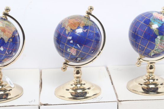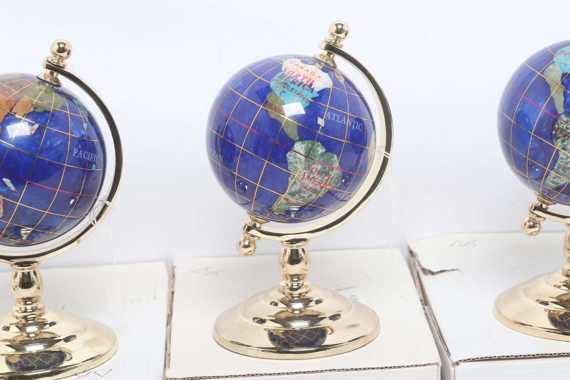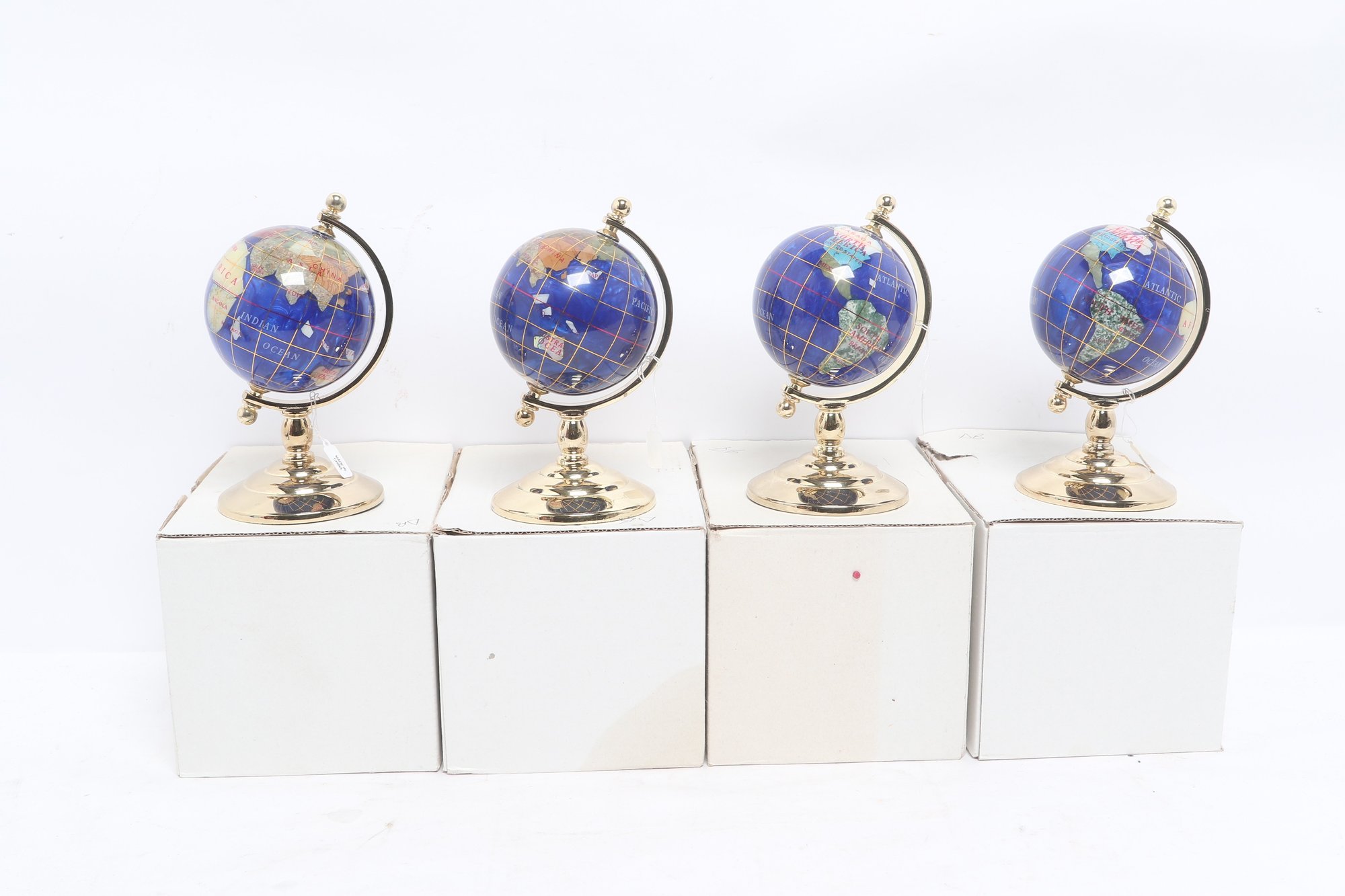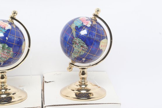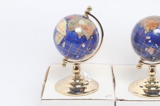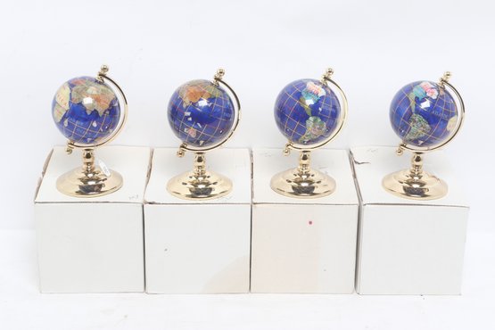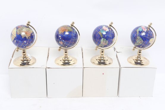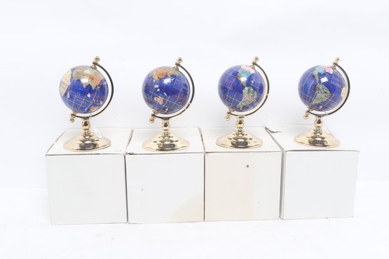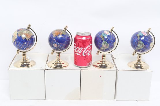 Set of four decorative mini globes featuring a gemstone-style appearance with vibrant blue oceans and gold-tone stands. Each globe is mounted on a small pedestal base and appears to be unused, with original boxes included. Great for desk décor, office display, or collectible gift items.