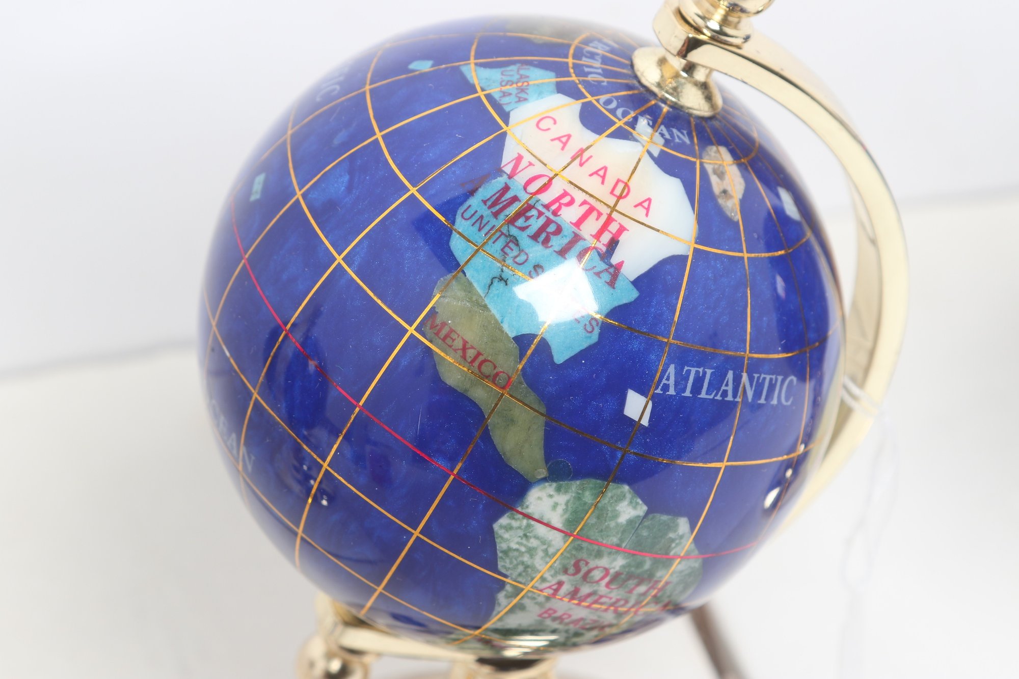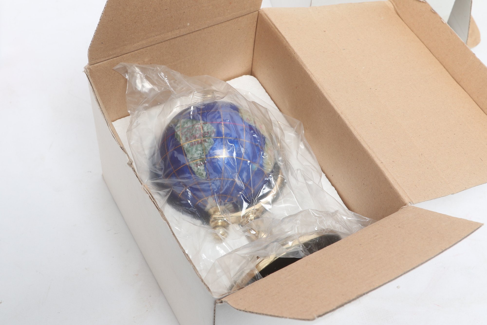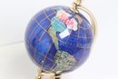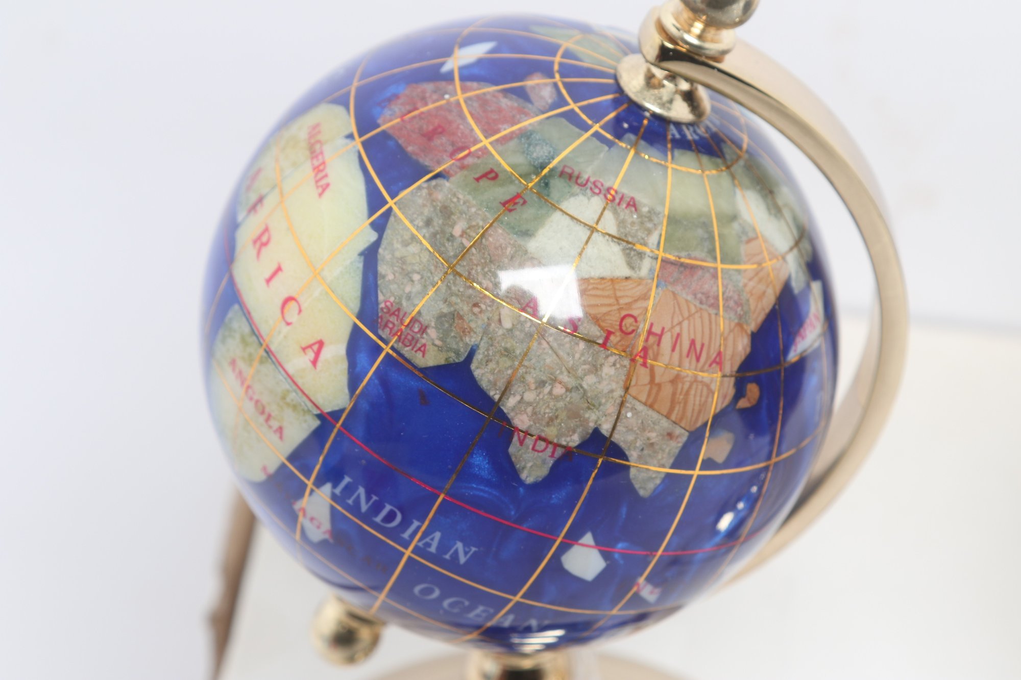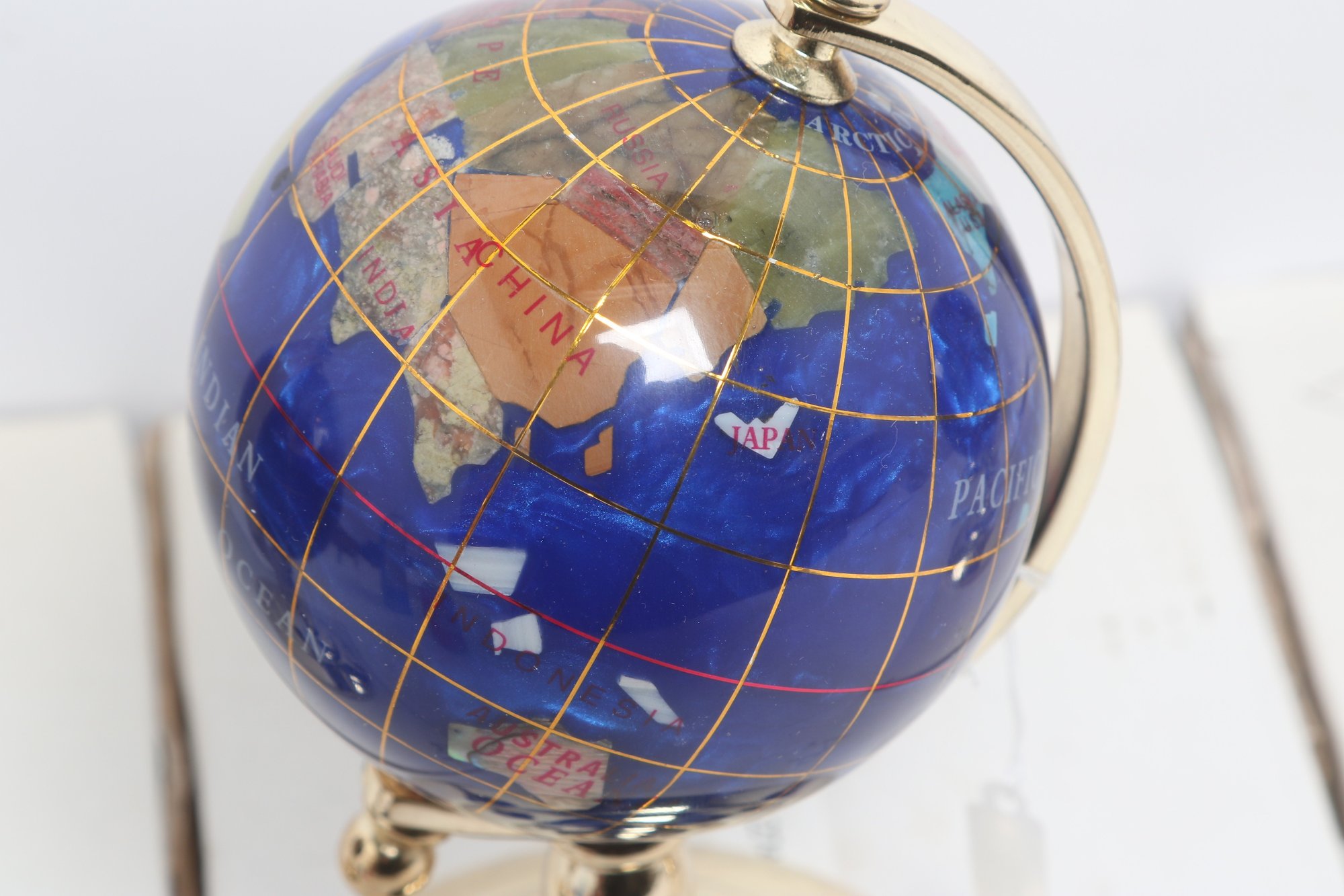 Set of four decorative mini globes featuring a gemstone-style appearance with vibrant blue oceans and gold-tone stands. Each globe is mounted on a small pedestal base and appears to be unused, with original boxes included. Great for desk décor, office display, or collectible gift items.