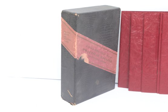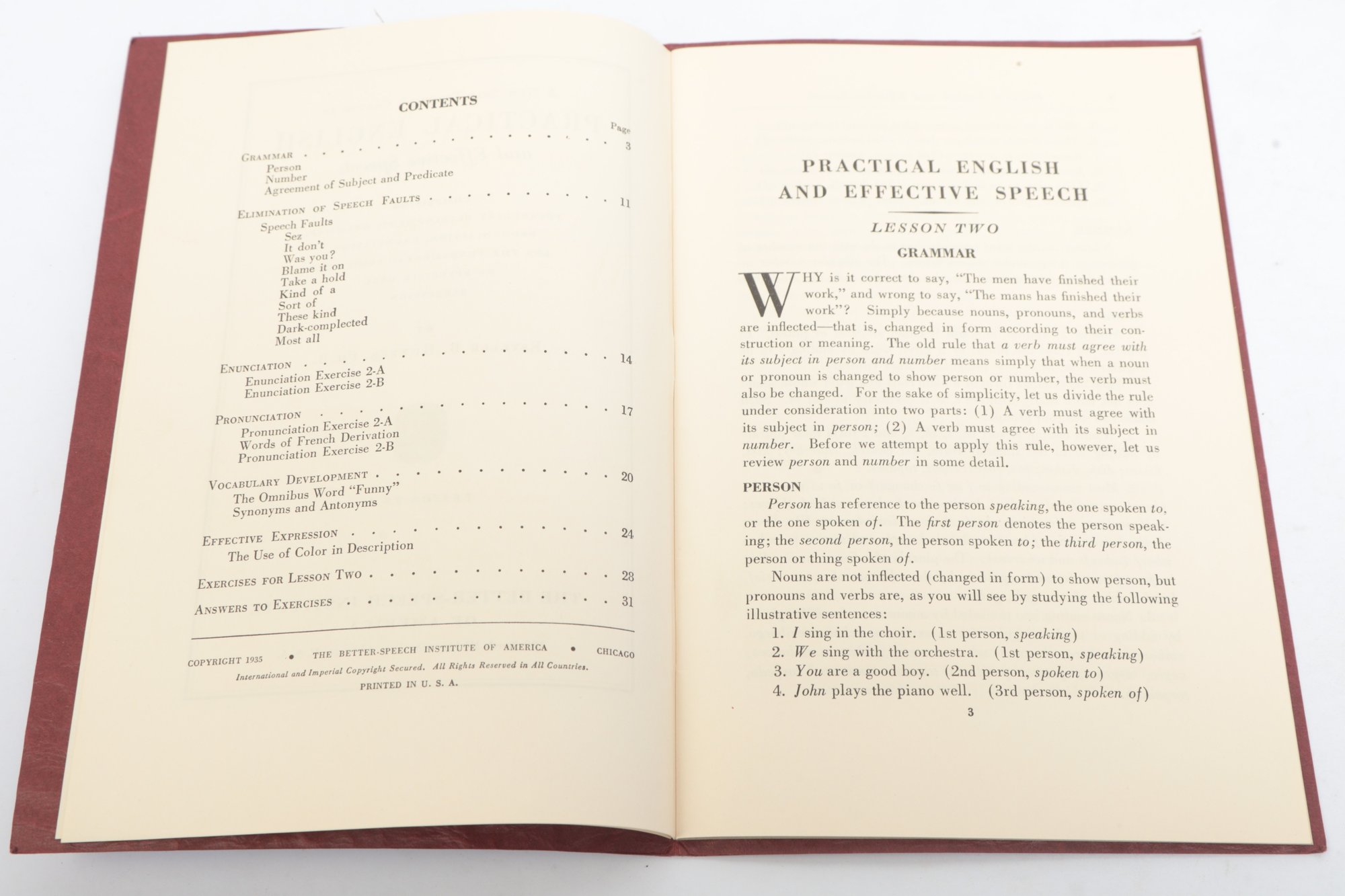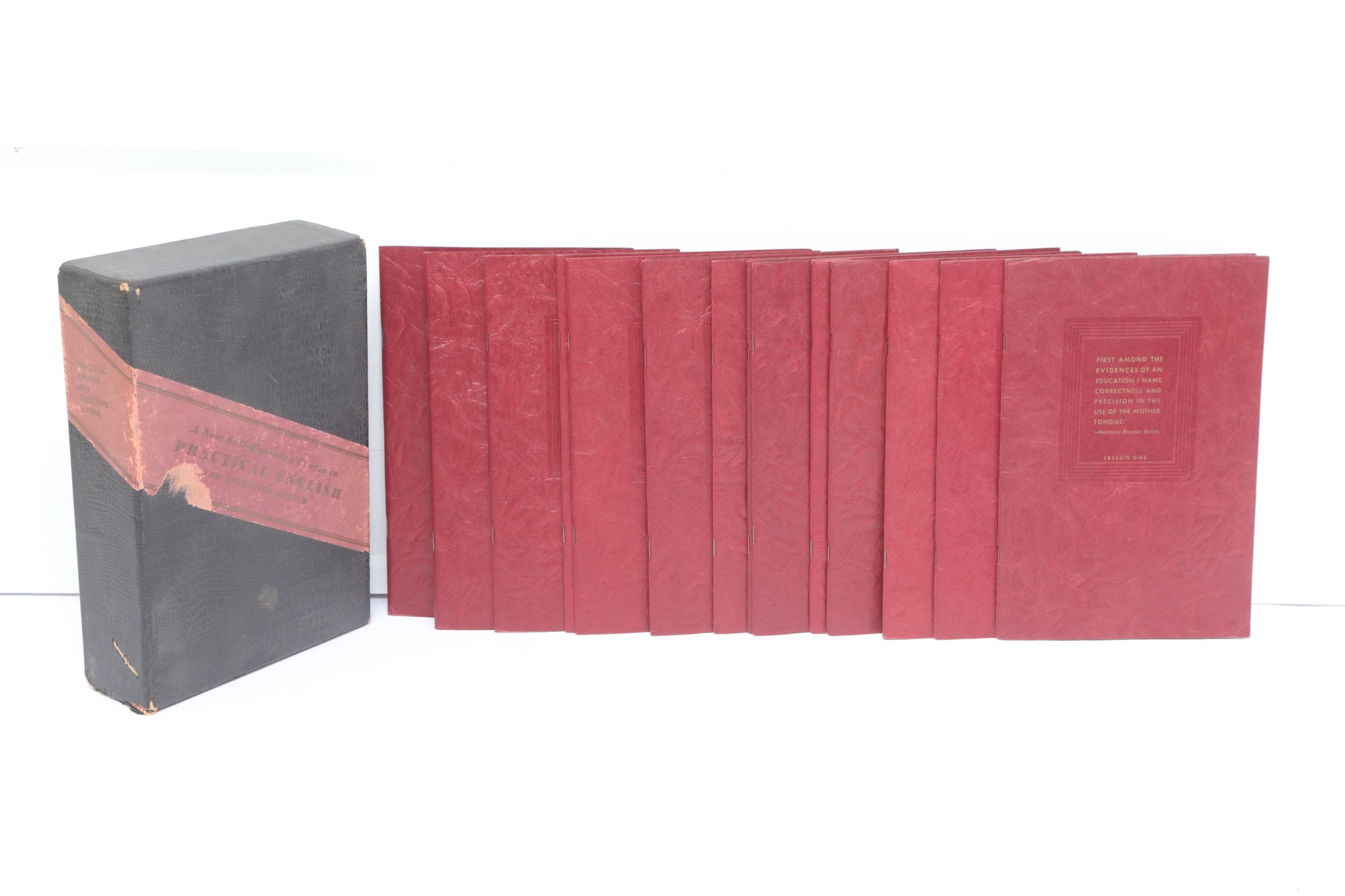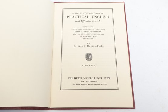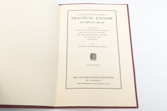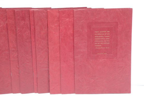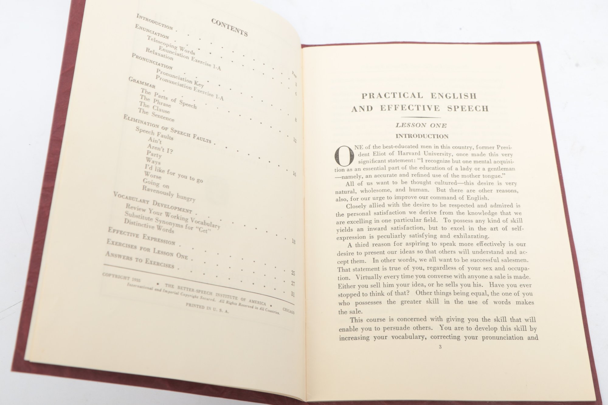 Complete self-teaching course in English usage and spoken expression, issued by The Better-Speech Institute of America, Chicago, consisting of multiple lesson booklets housed in the original publisher’s box. The set covers vocabulary development, grammar, pronunciation, enunciation, and principles of effective oral expression, reflecting early 20th-century American elocution and self-improvement pedagogy. Individual lessons bound in uniform red wrappers, printed in a clear instructional format for progressive study; housed in the original black box with printed paper label. Condition generally good: box worn with rubbing, edge wear, and losses to the label; lesson booklets clean and intact with light handling wear. A well-preserved example of period correspondence-style education material, of interest for the history of speech training, rhetoric, and adult self-education in America.