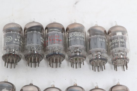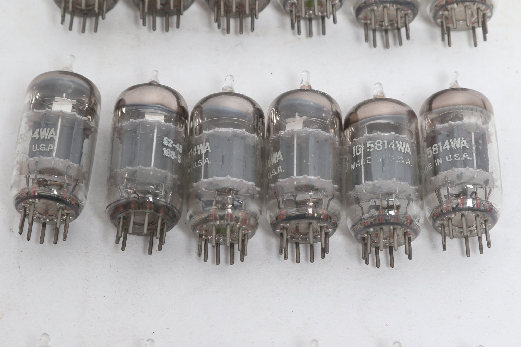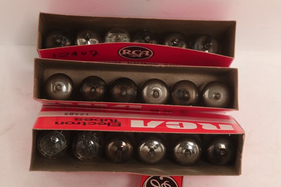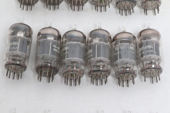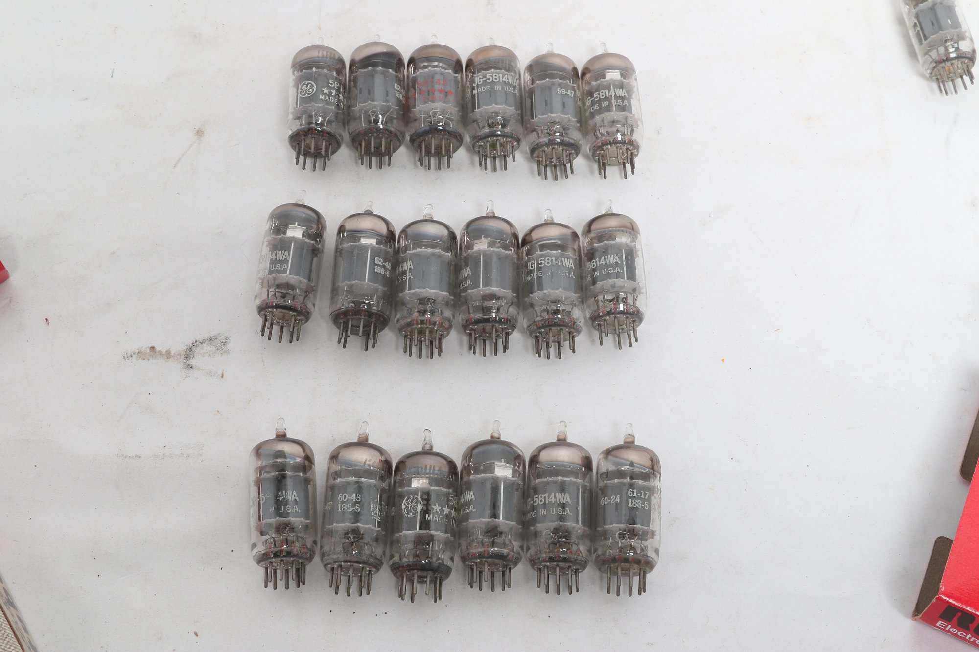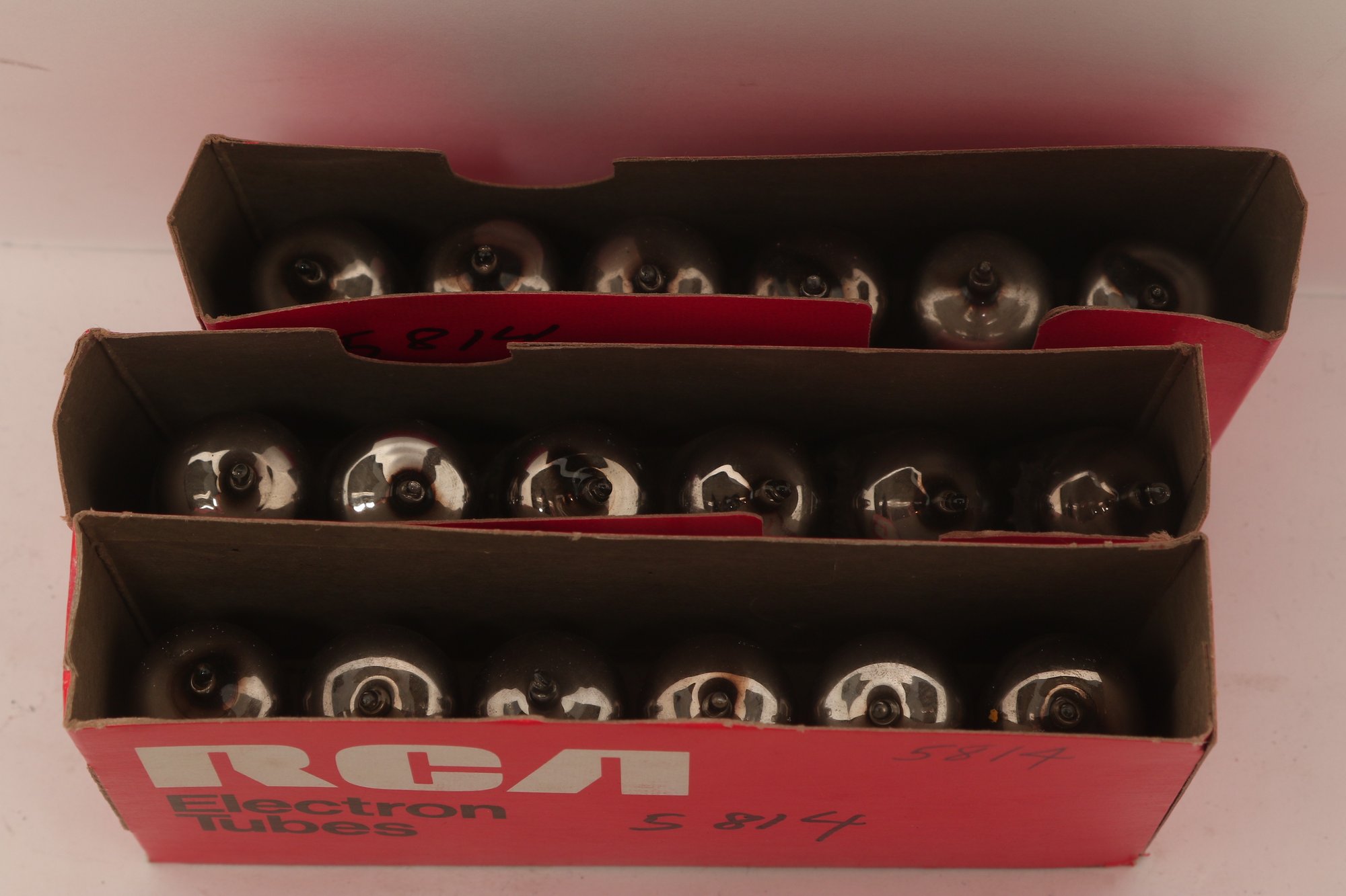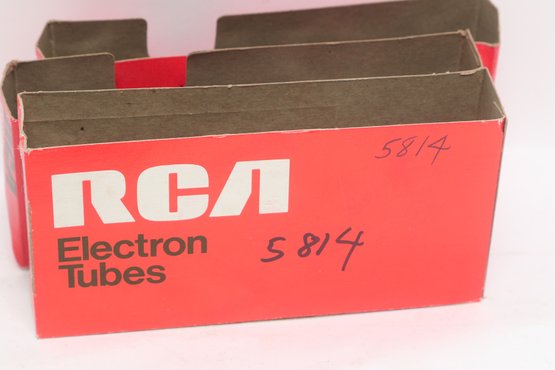 Assorted lot of vintage RCA electron vacuum tubes including multiple 5814 types and other mixed examples. Includes original RCA boxes and additional tubes in storage tray. Untested condition with visible age-related wear, ideal for collectors or electronics enthusiasts.