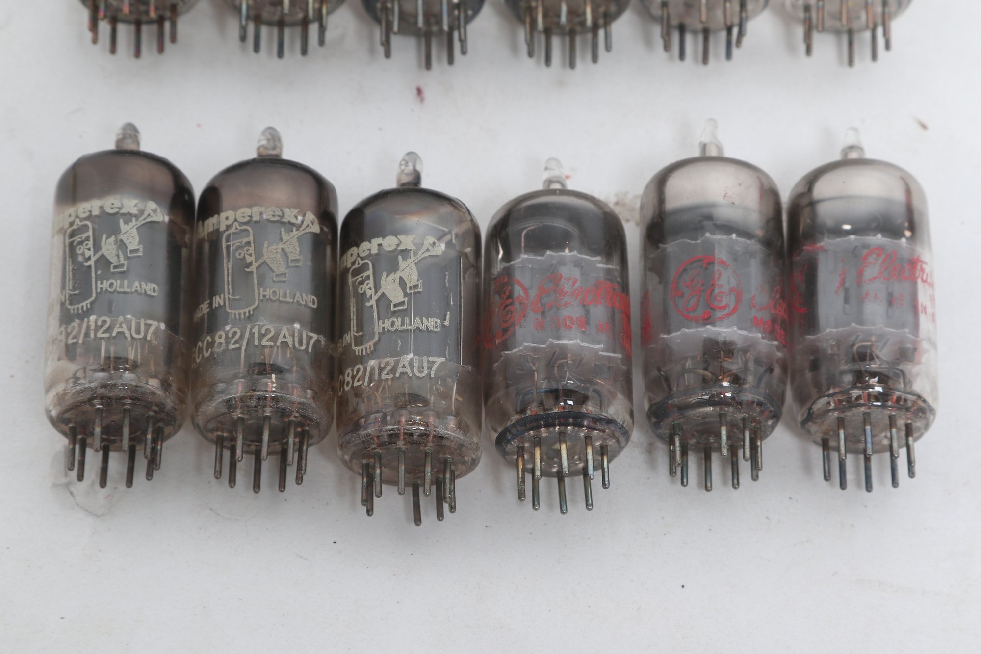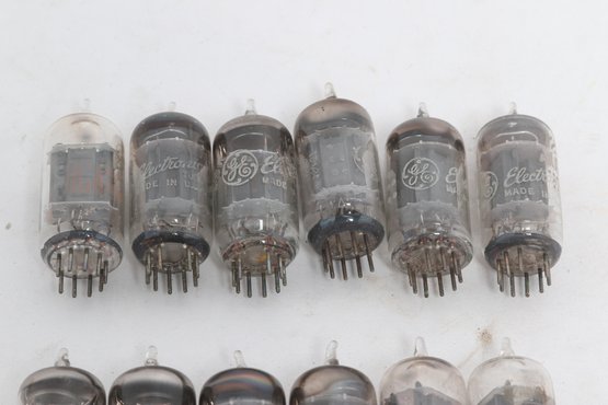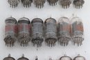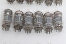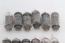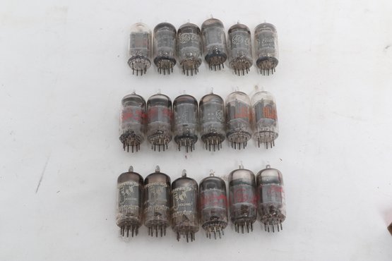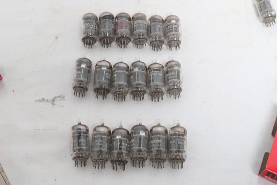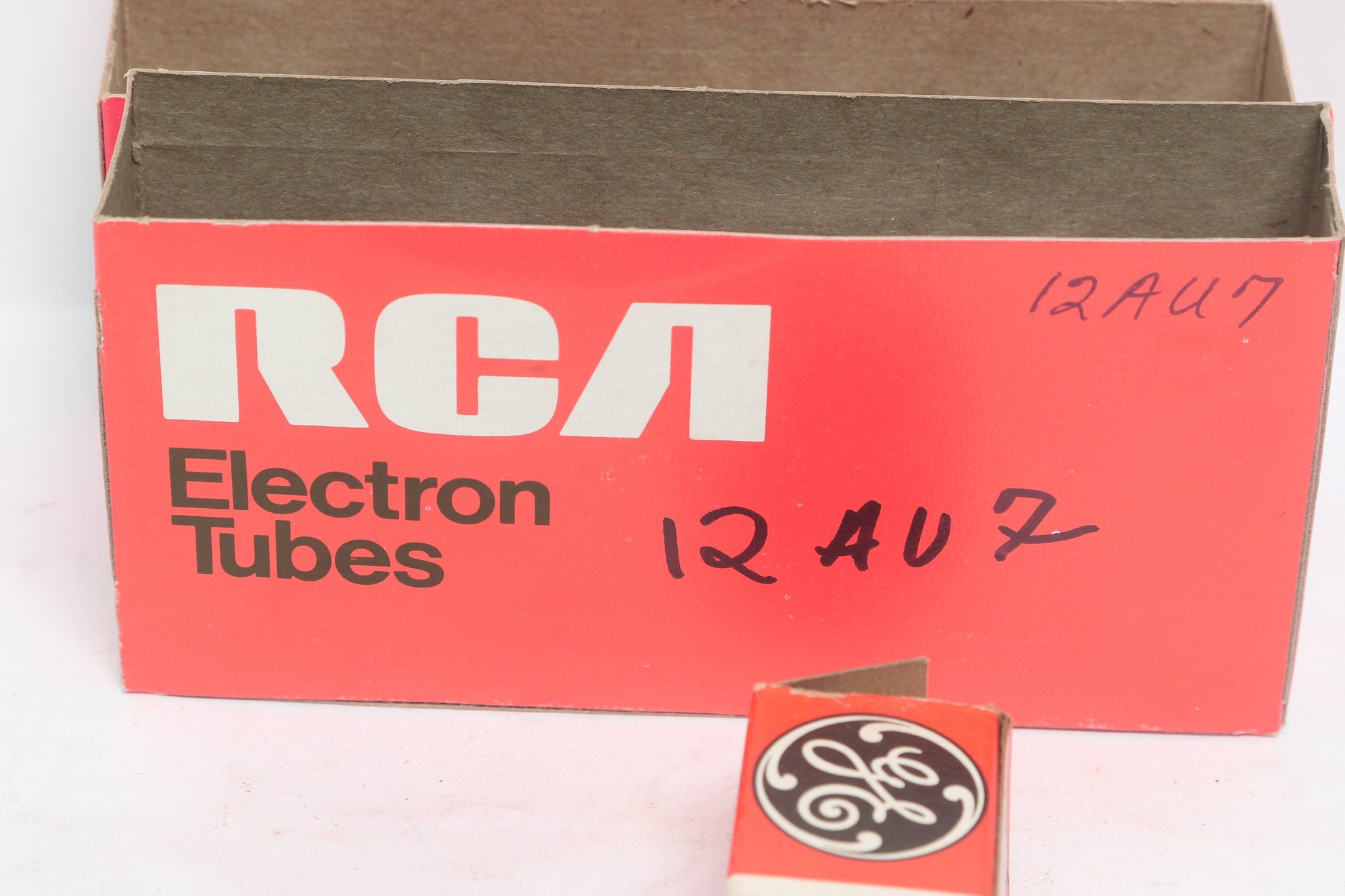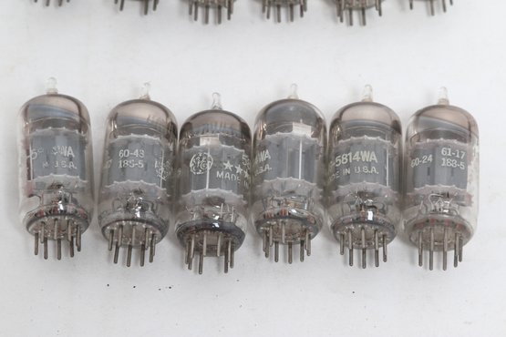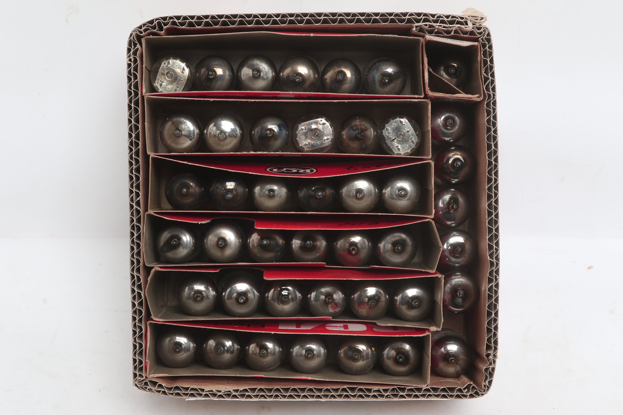 Assorted lot of vintage RCA electron vacuum tubes including multiple 5814 types and other mixed examples. Includes original RCA boxes and additional tubes in storage tray. Untested condition with visible age-related wear, ideal for collectors or electronics enthusiasts.
