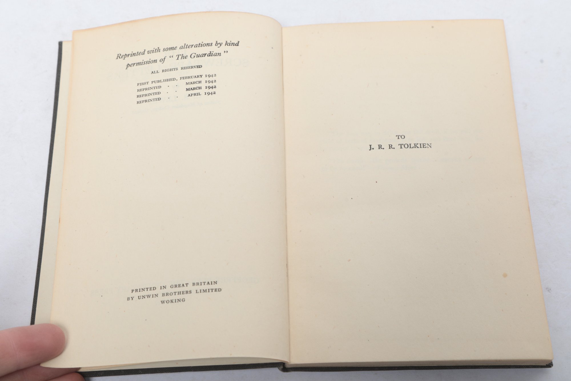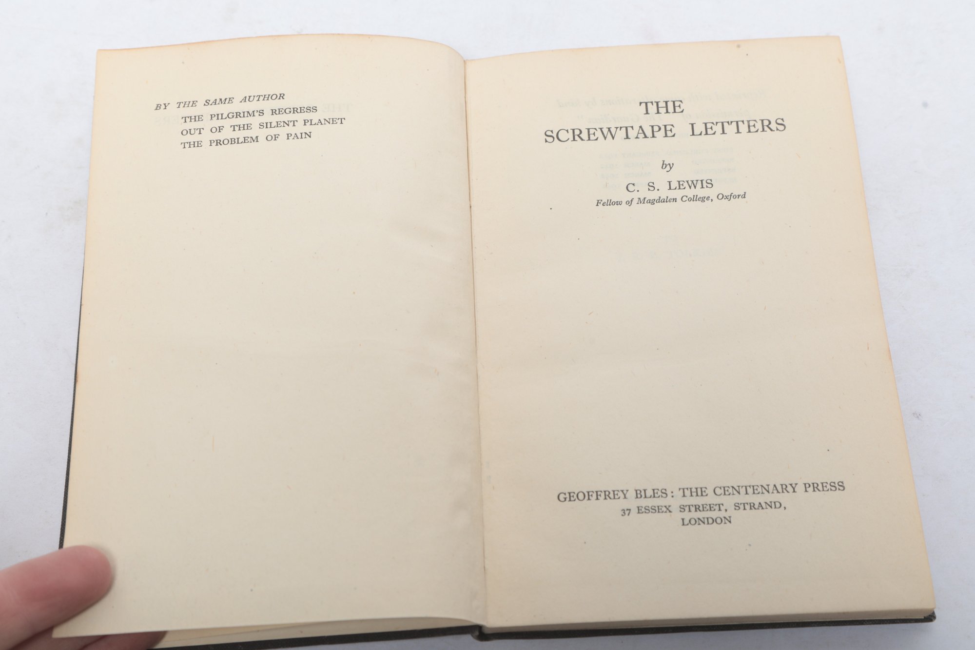 London: Geoffrey Bles: The Centenary Press, 1942, hardcover in black cloth. Early printing of the classic epistolary work by C.S. Lewis, listing three previous titles on the ad card. Binding shows minor shelf wear; text block is clean and tightly bound with light age-toning to the title page..