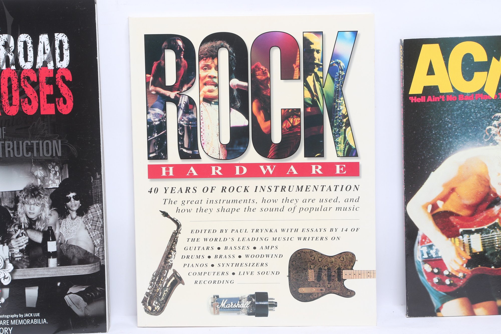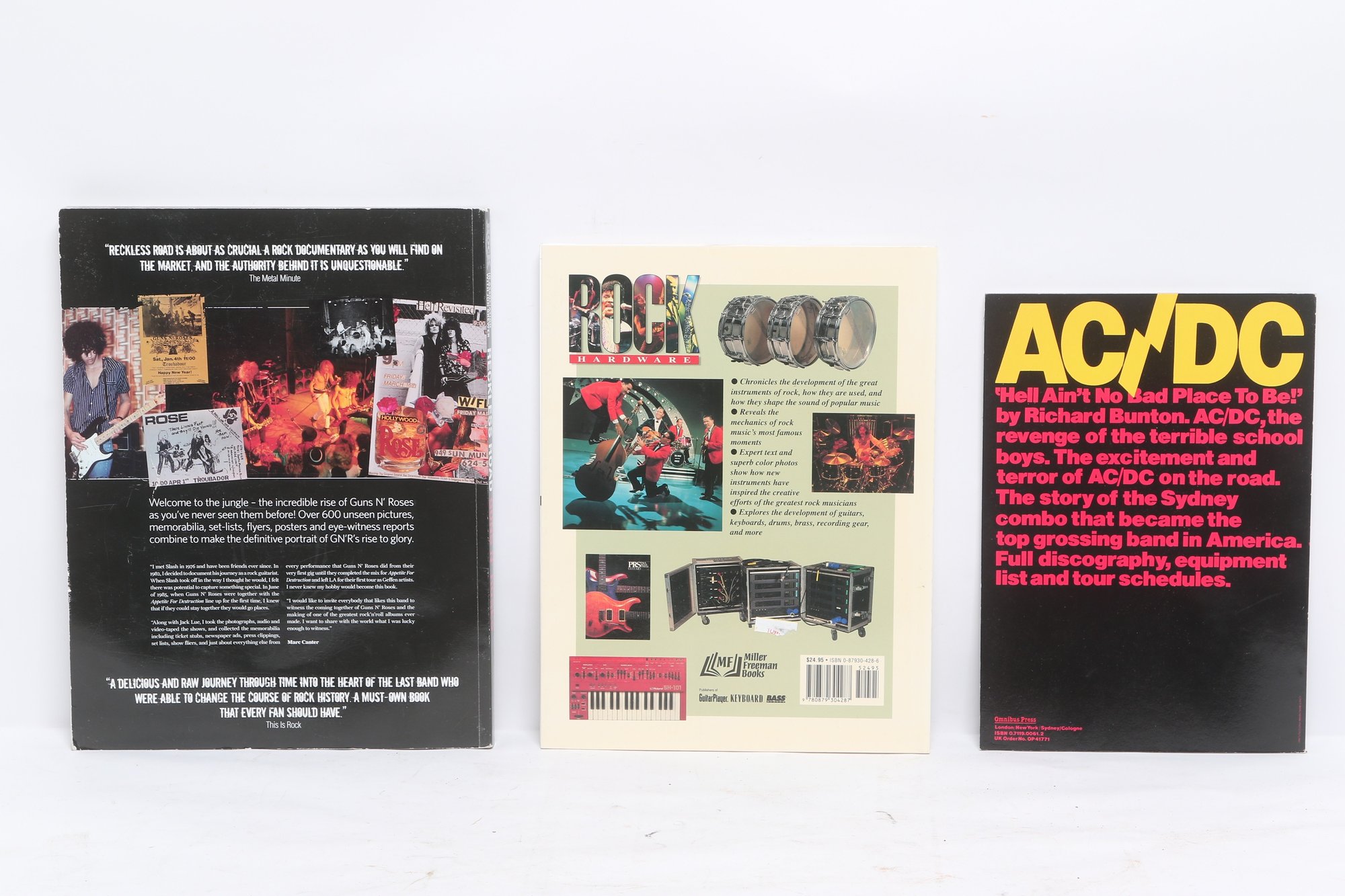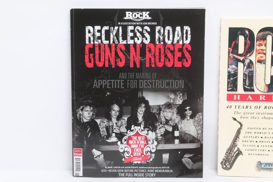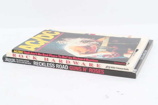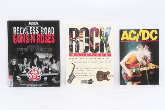 Lot of three rock music books featuring AC/DC, Guns N’ Roses, and Rock Hardware covering instruments and rock history. Softcover volumes with great photos and content for fans and collectors. Light wear from use.