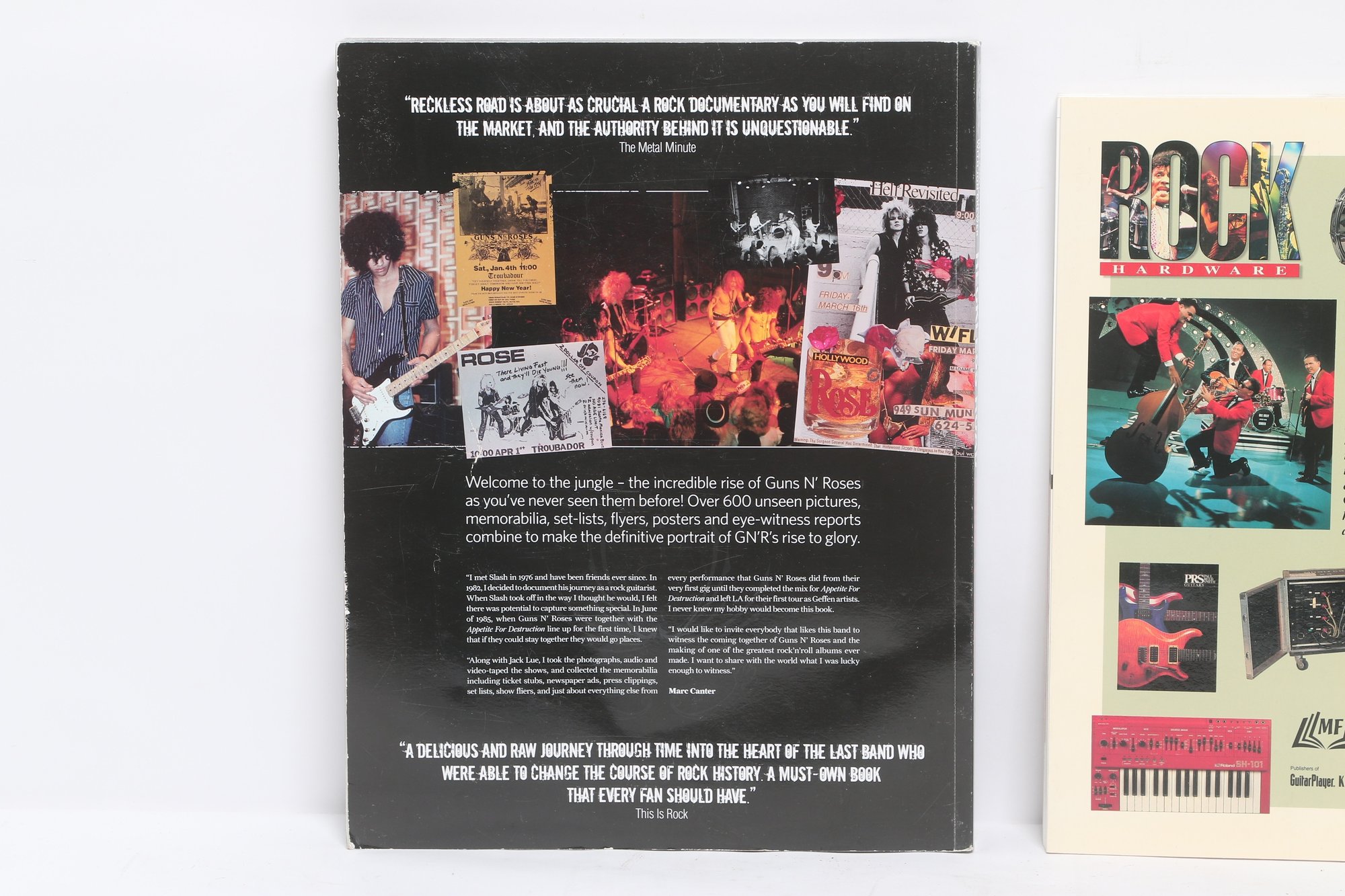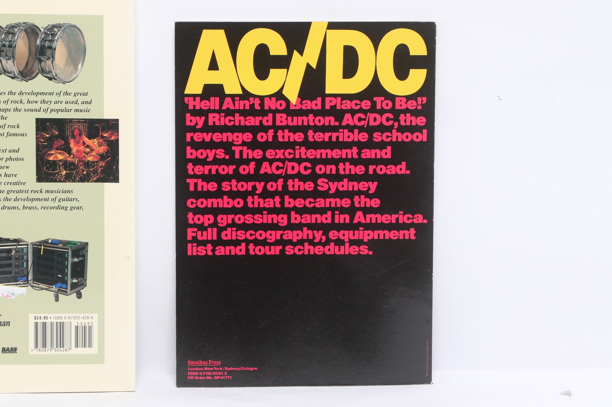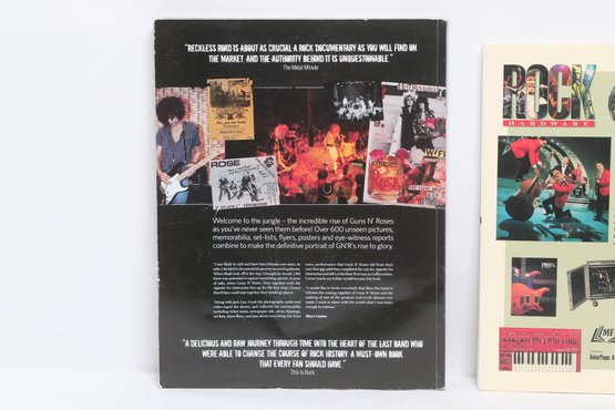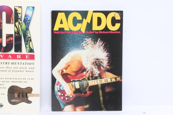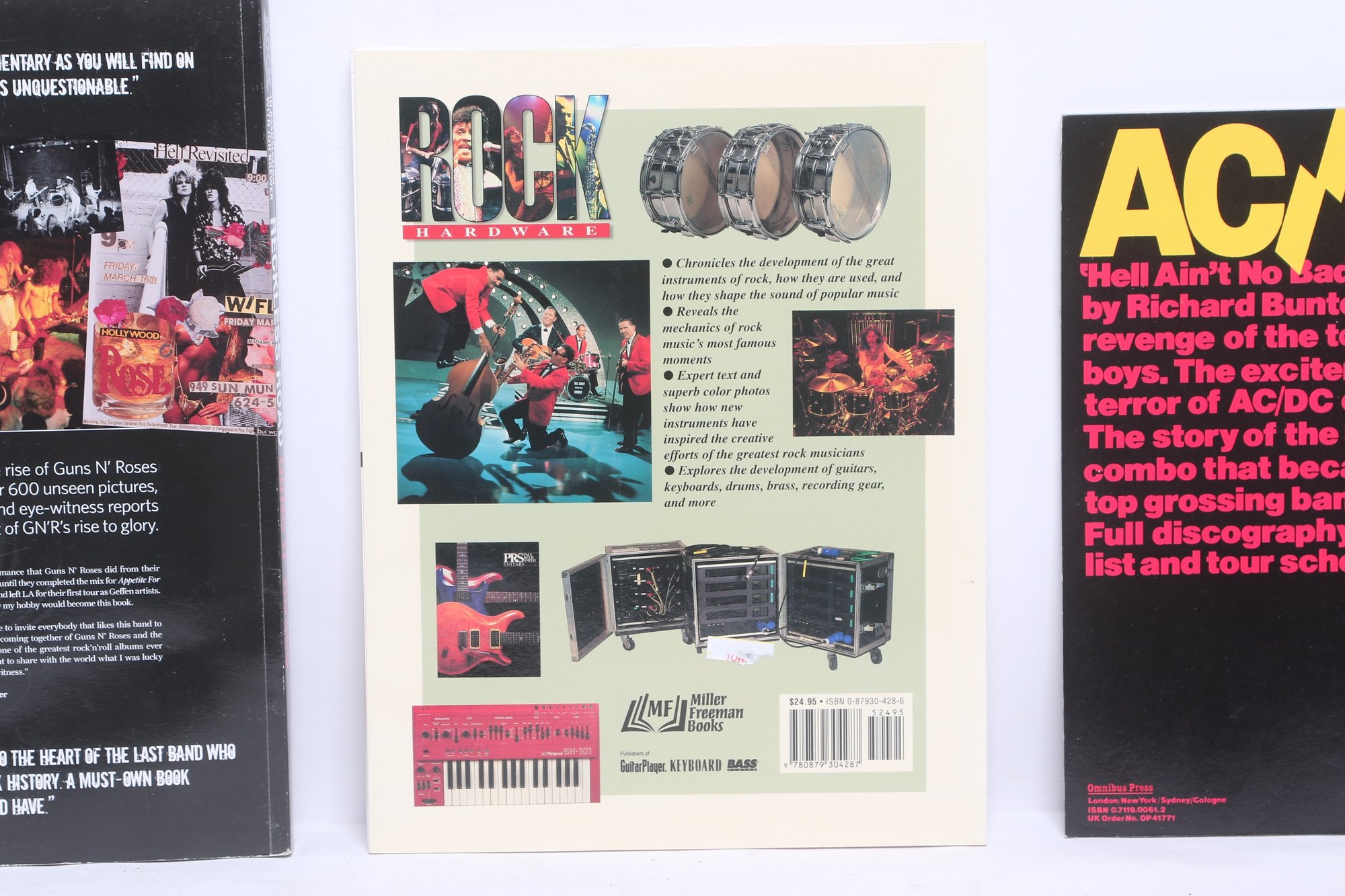 Lot of three rock music books featuring AC/DC, Guns N’ Roses, and Rock Hardware covering instruments and rock history. Softcover volumes with great photos and content for fans and collectors. Light wear from use.