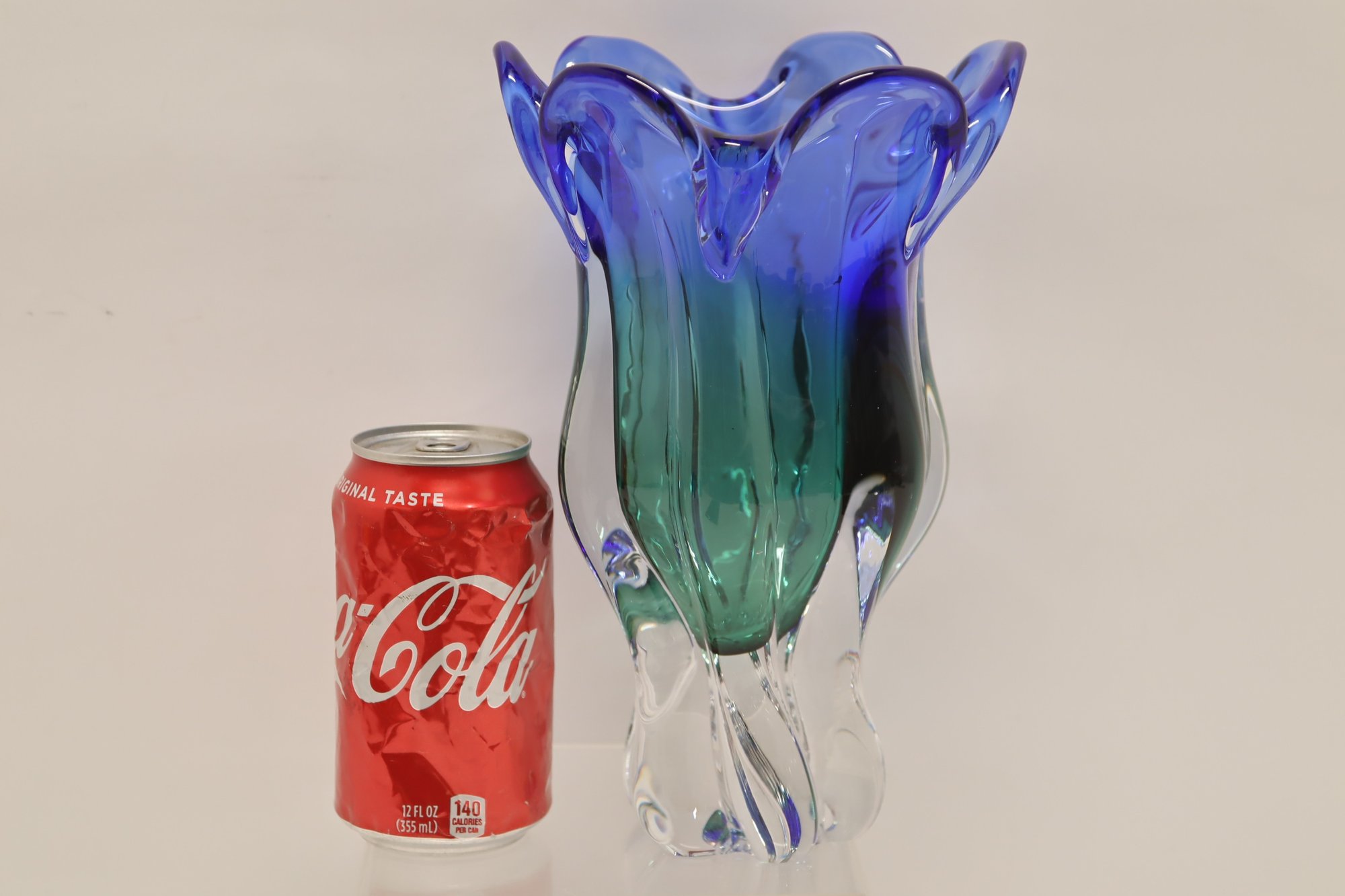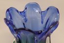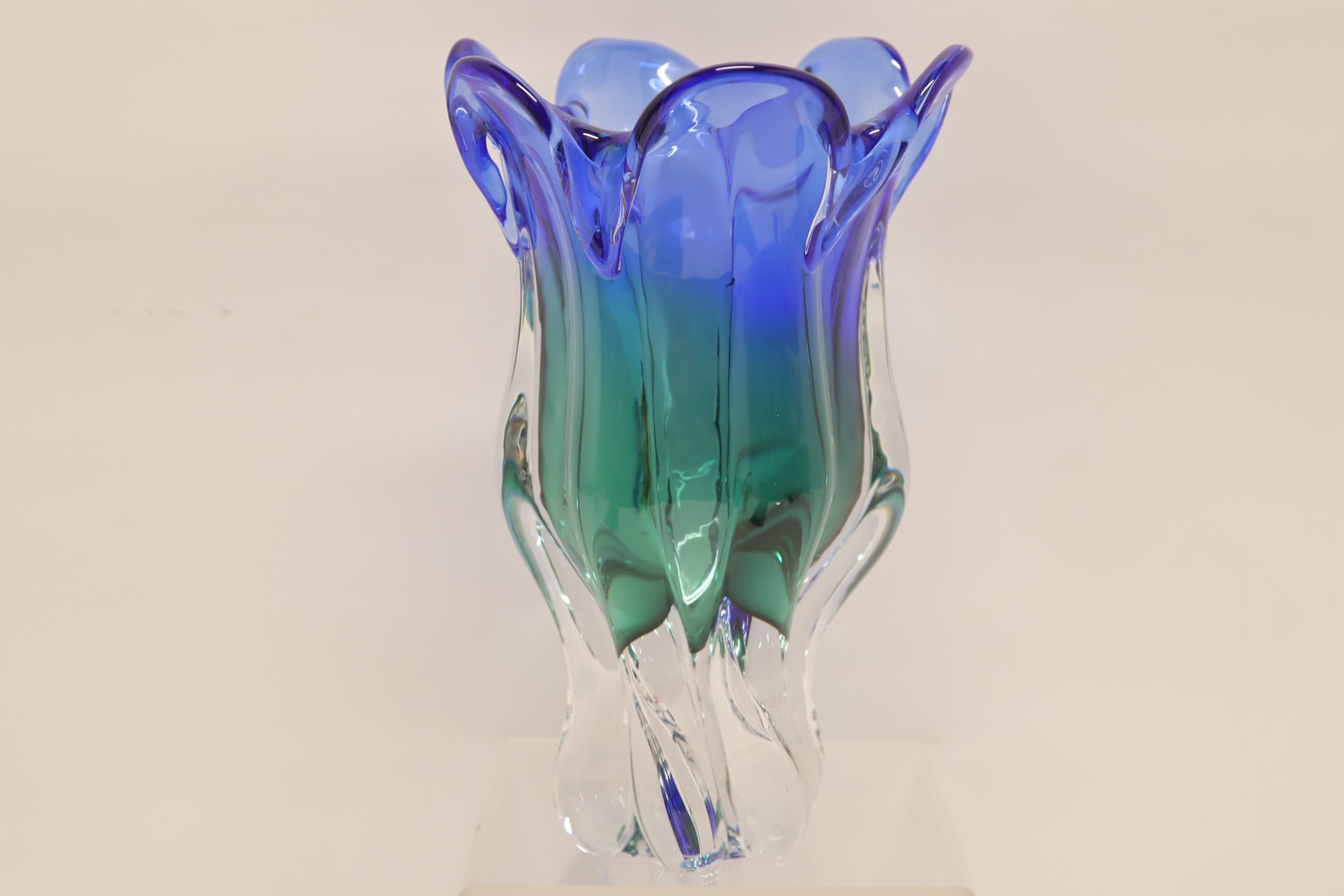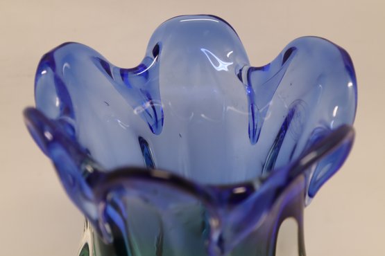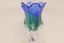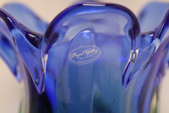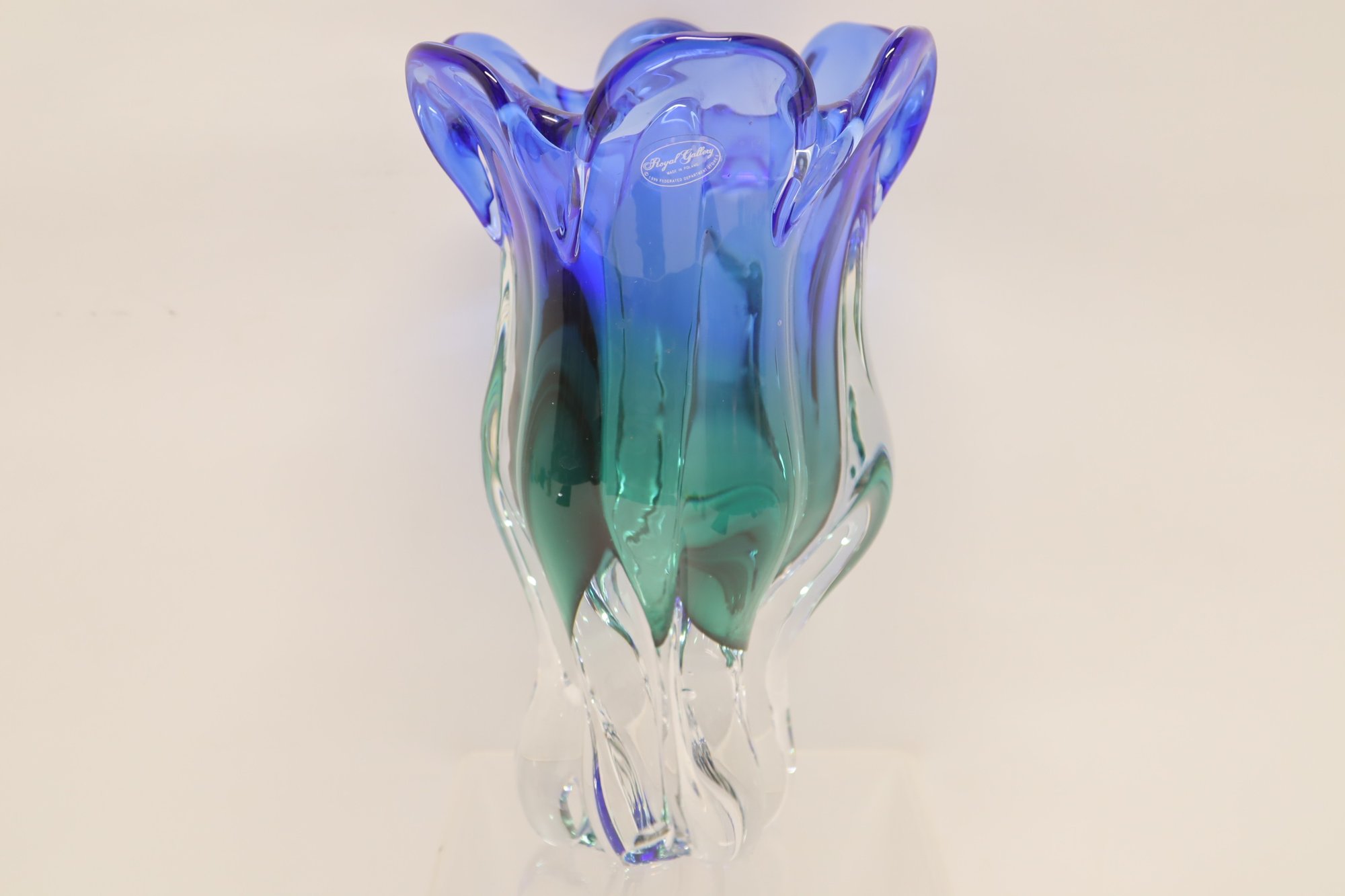 Striking Royal Gallery art glass vase featuring a vibrant blue to green gradient with a clear twisted base and elegantly ruffled rim. This hand-blown piece showcases fluid, organic form and rich coloration, making it a beautiful decorative accent for any space. Appears in very good condition with no visible chips or cracks.