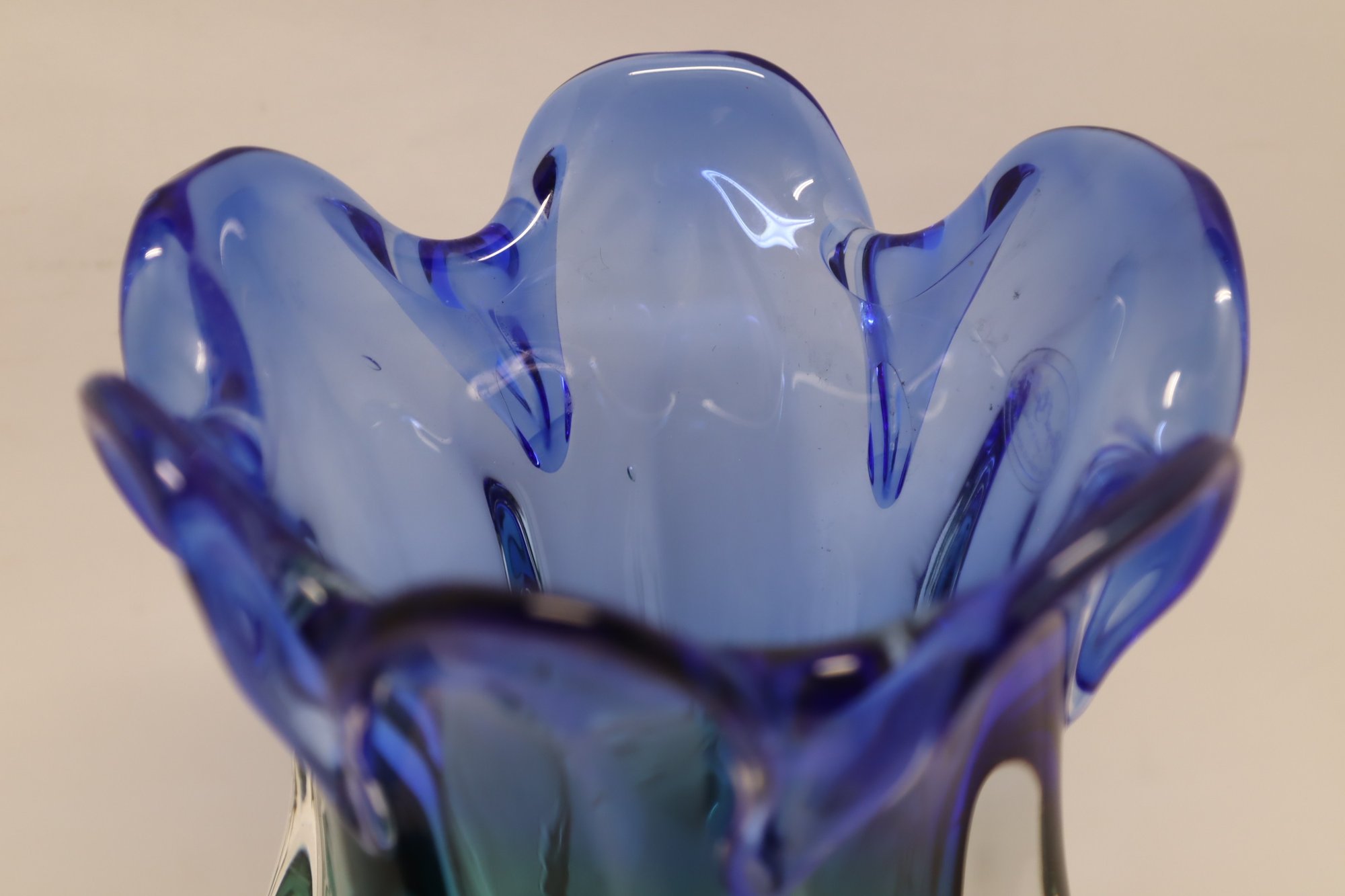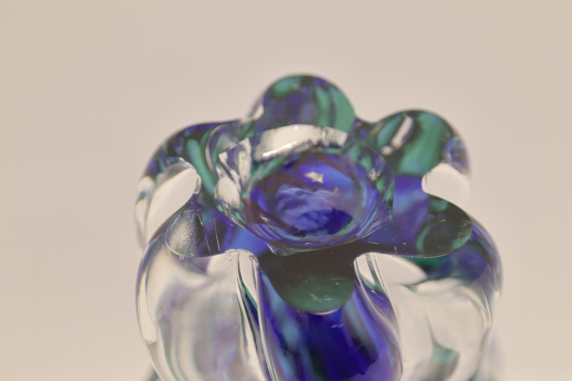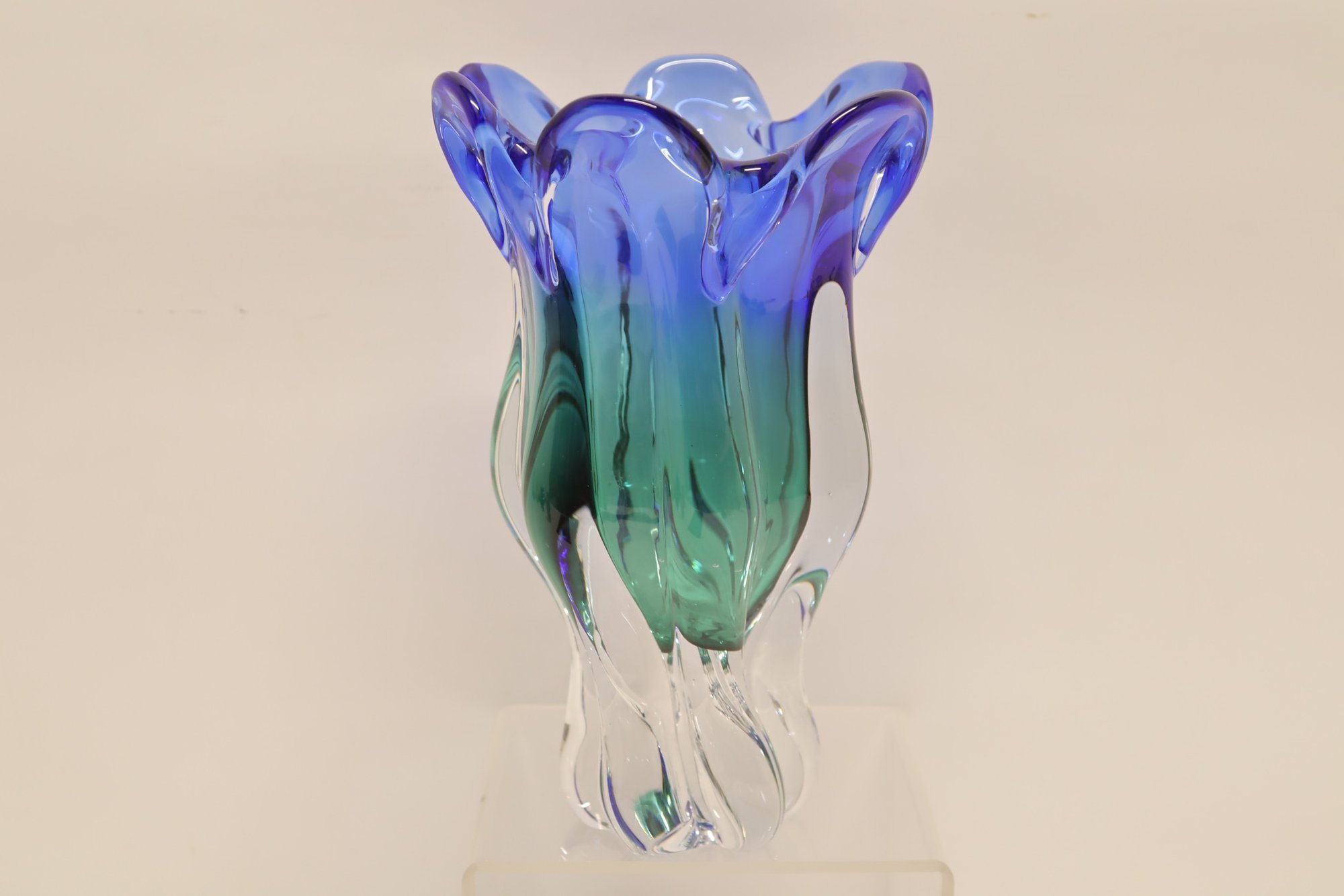 Striking Royal Gallery art glass vase featuring a vibrant blue to green gradient with a clear twisted base and elegantly ruffled rim. This hand-blown piece showcases fluid, organic form and rich coloration, making it a beautiful decorative accent for any space. Appears in very good condition with no visible chips or cracks.